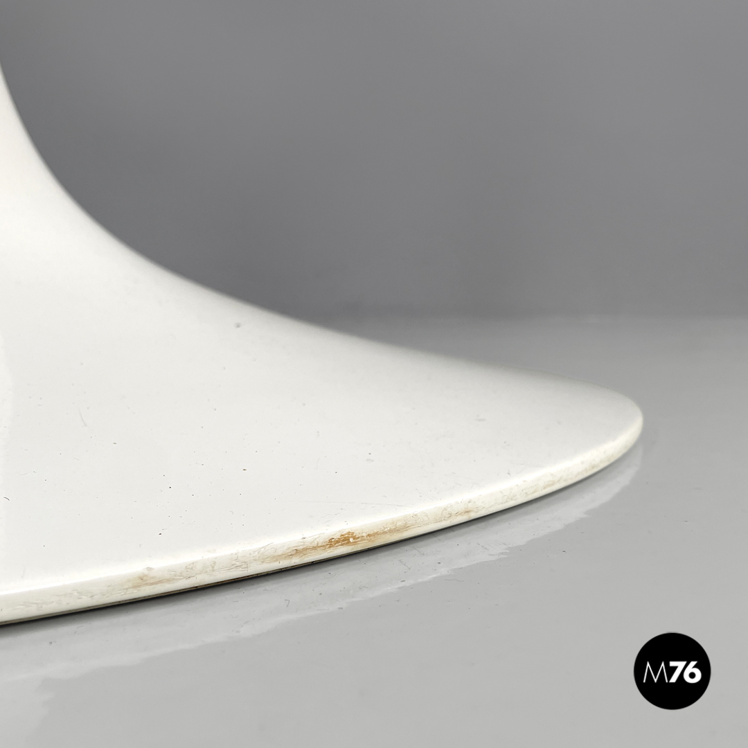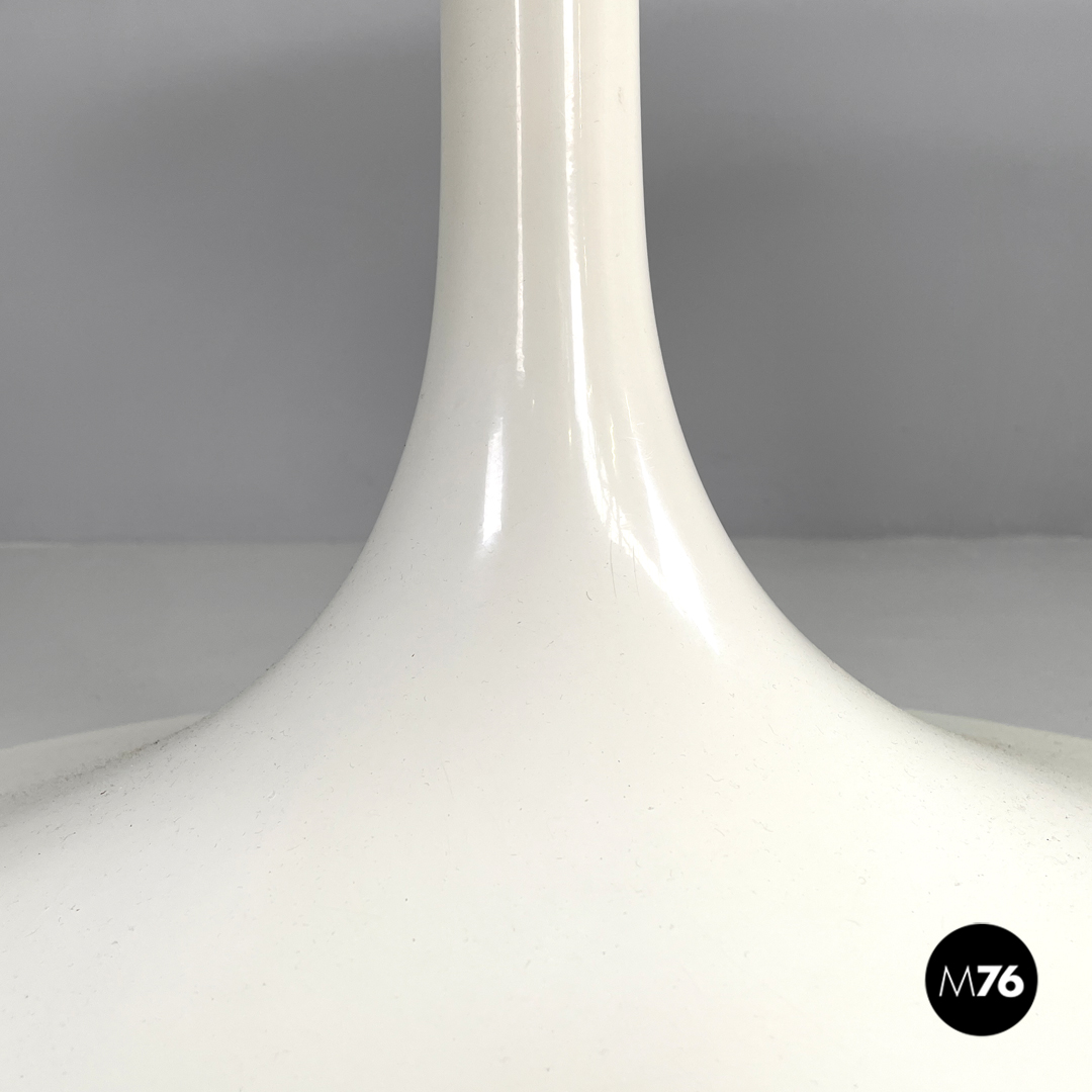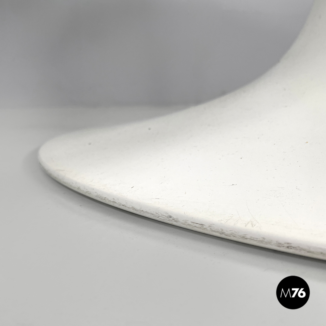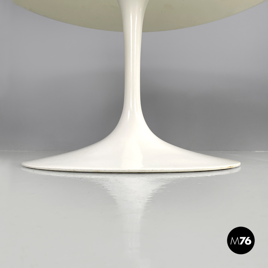 Tavolo da pranzo modello Tulip con piano tondo in laminato bianco. La zampa del tavolo è in metallo verniciato bianco.