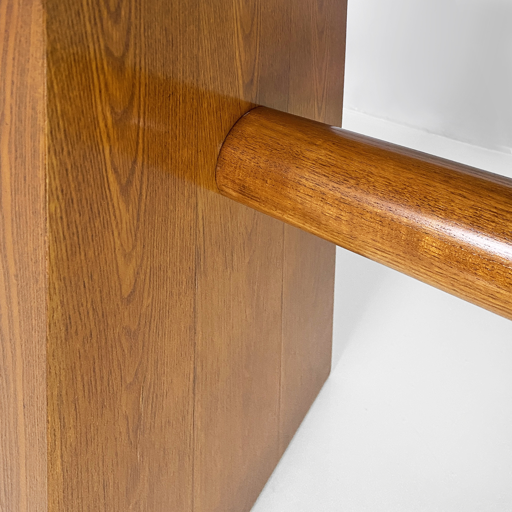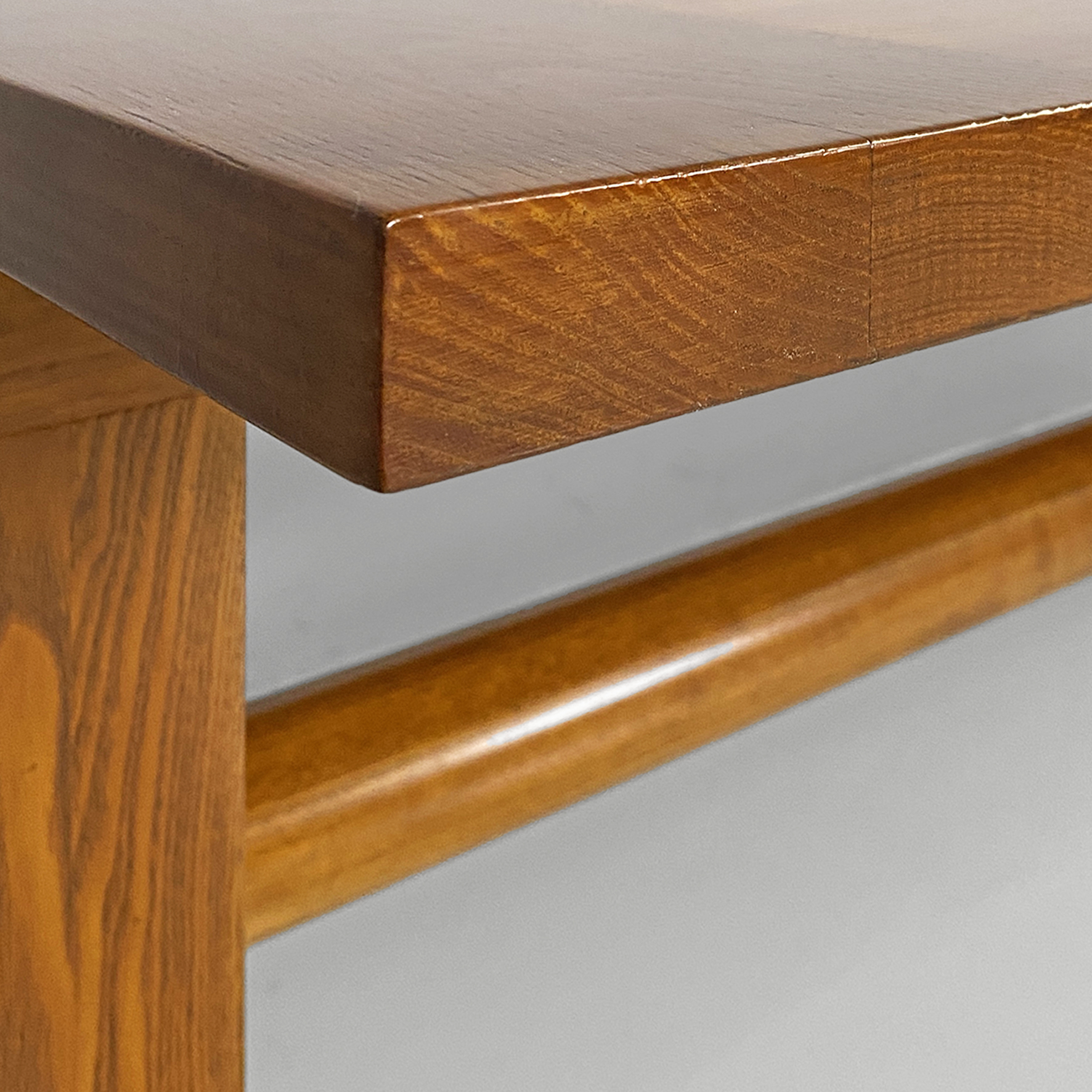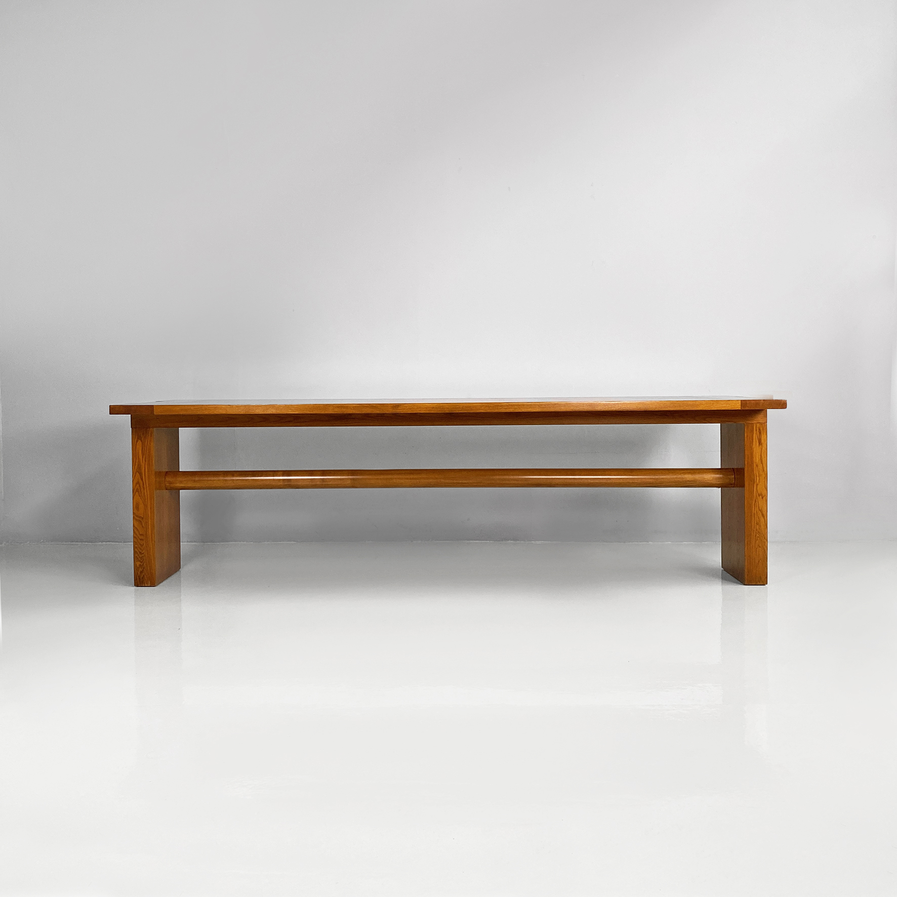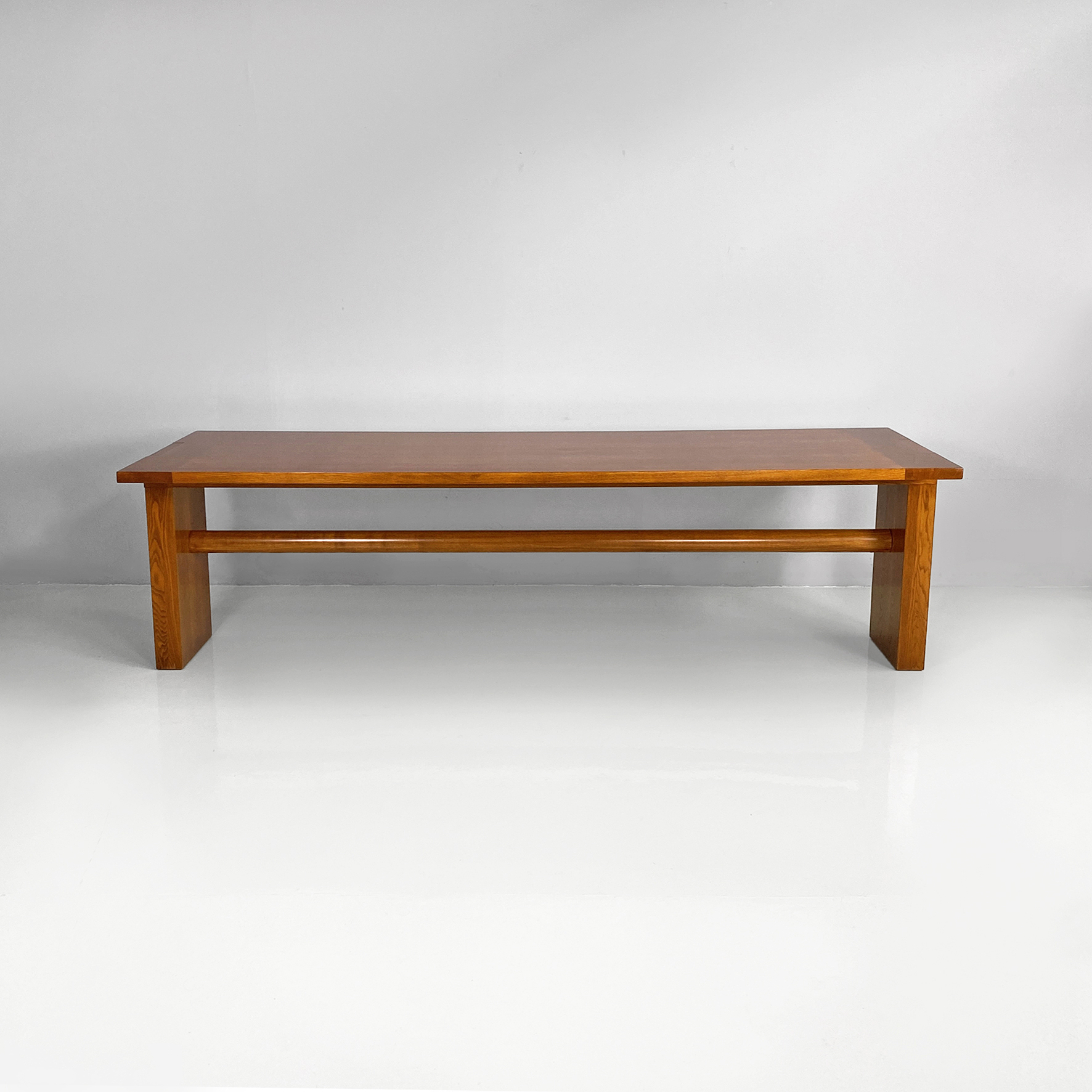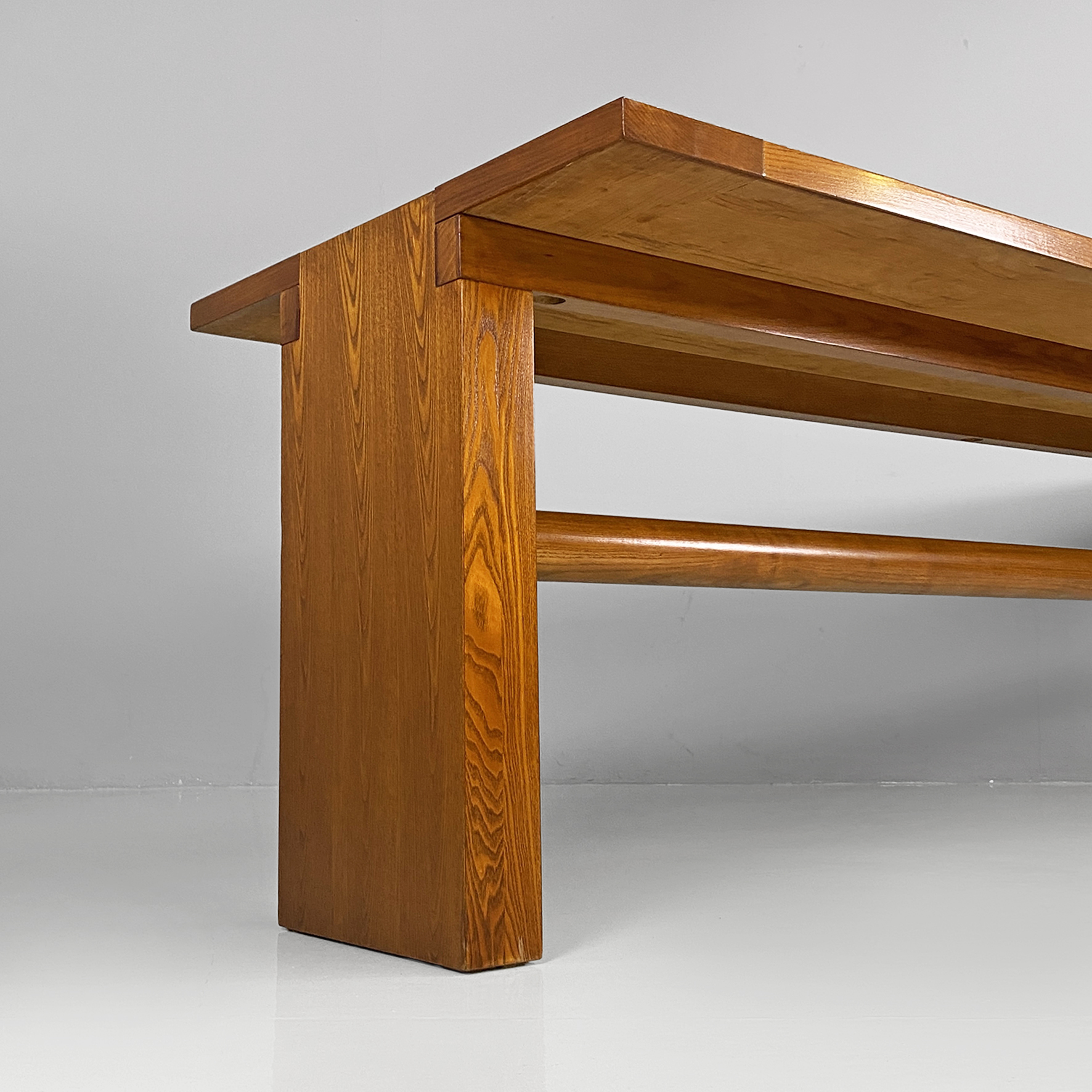 Tavolo da pranzo modello Valmarana, interamente realizzato in legno con finitura chiara e piano rettangolare, composto da due spalle laterali che fungono da zampa che si trovano posizionate a capotavola e tenute insieme da un lungo listello a sezione tonda. Le zampe incastrandosi con lo stesso piano creano un elegante e particolare incastro visibile dal piano.