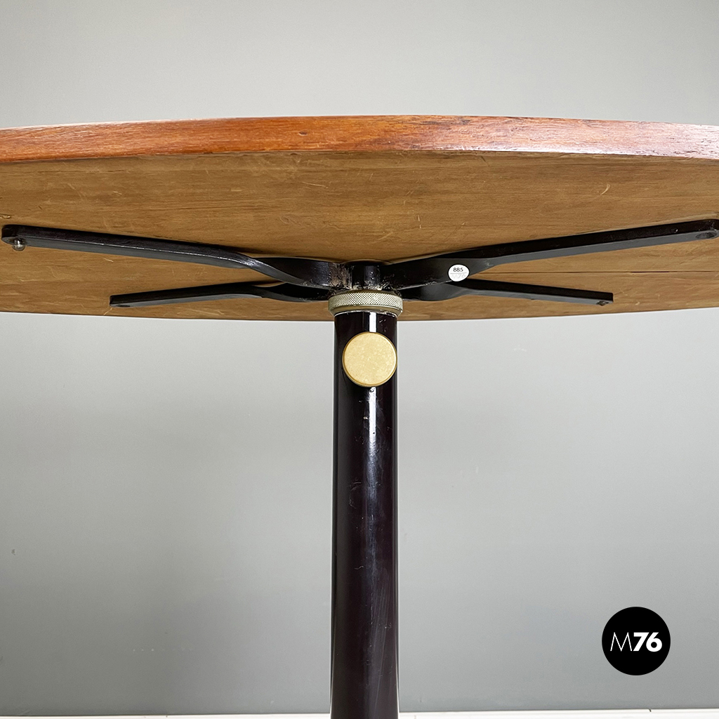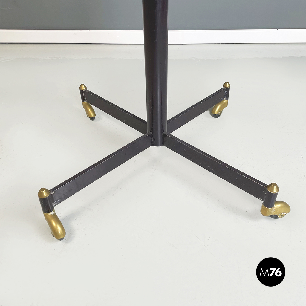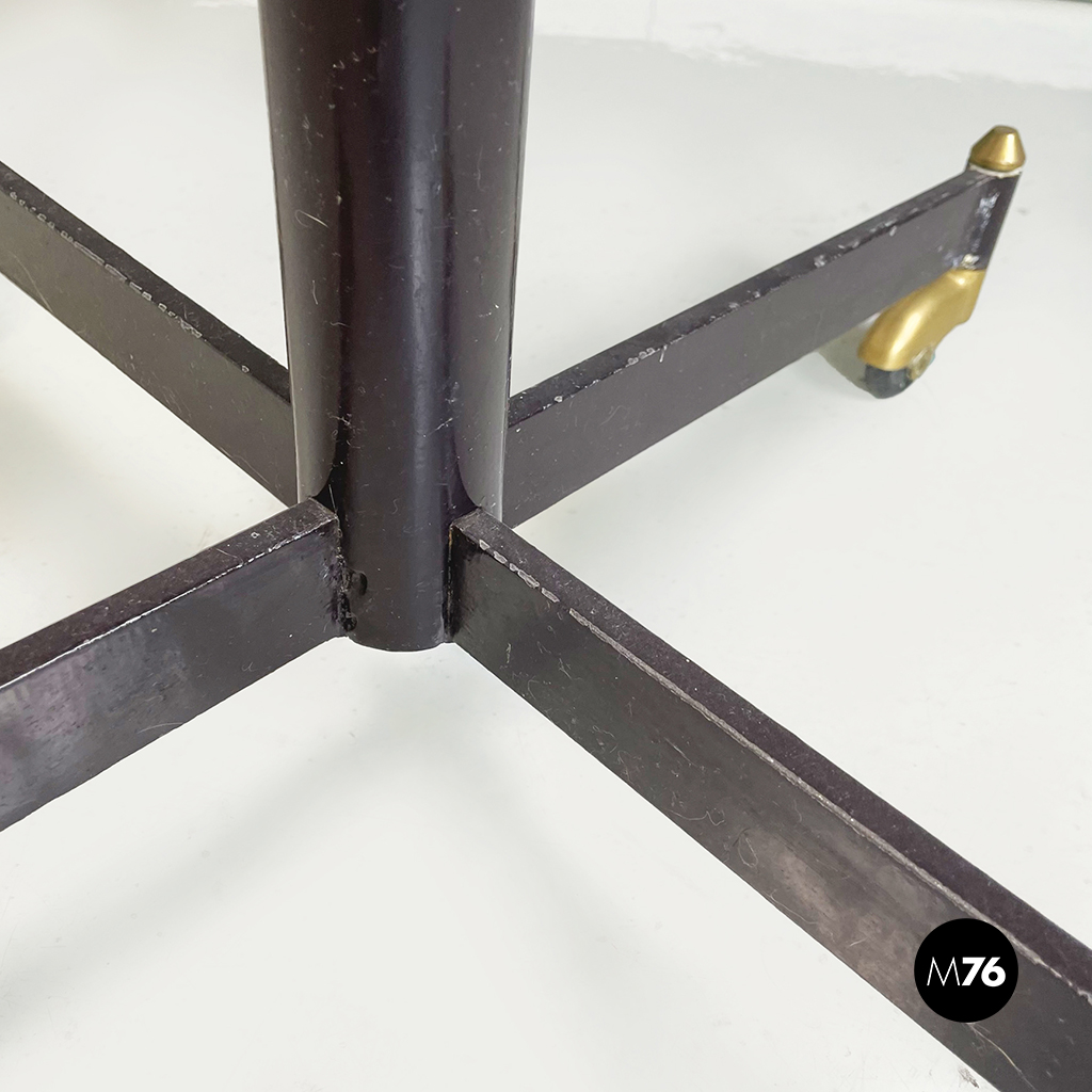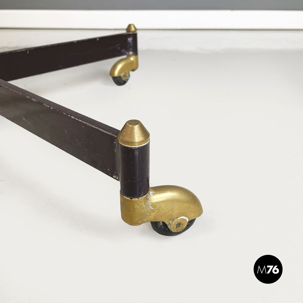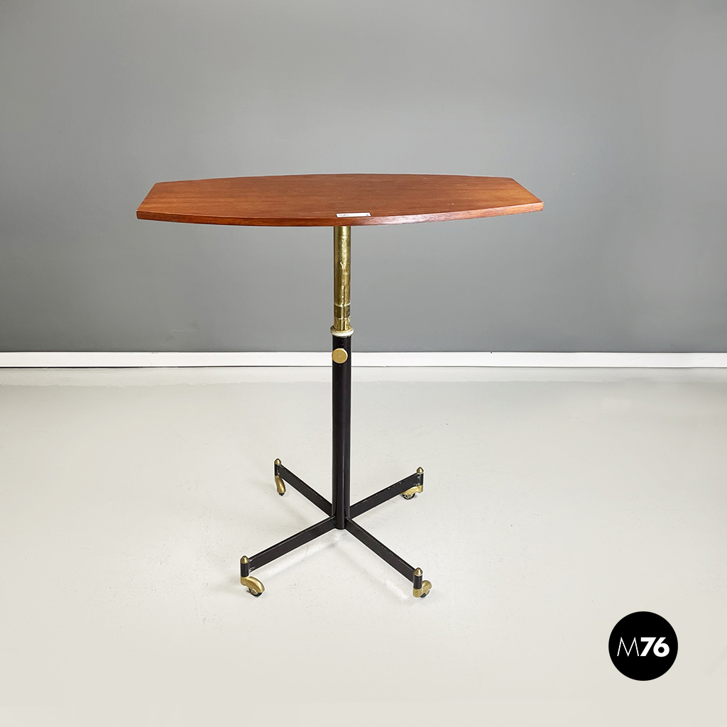 Tavolo carrello con piano rialzabile in legno e con struttura in metallo verniciato nero e ottone. Base a quattro razze su ruote. Utilizzabile come tavolo di servizio o tavolo da caffè laterale.