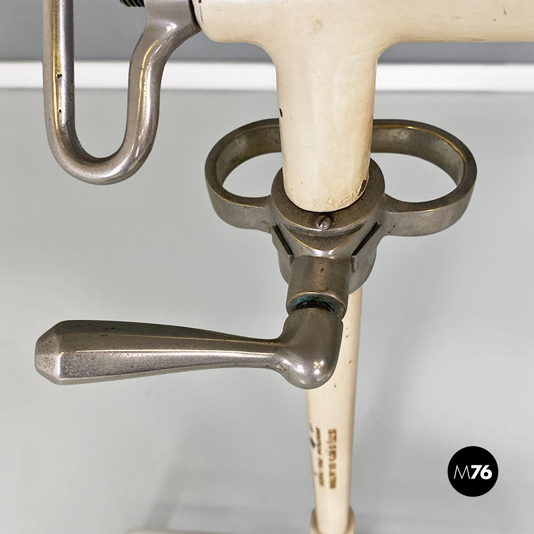Tavolo industriale da tecnigrafo o da lavoro con struttura in tubolare di metallo smaltato bianco, con zampa a tre razze, a forma di “T”, in ferro con puntali in metallo e con piano in legno e piano laterale di piccole dimensioni. Il piano più grande e l’altezza del tavolo sono direzionabili e regolabili tramite due dadi presenti sulla struttura. Utilizzabile come tavolo da caffè.