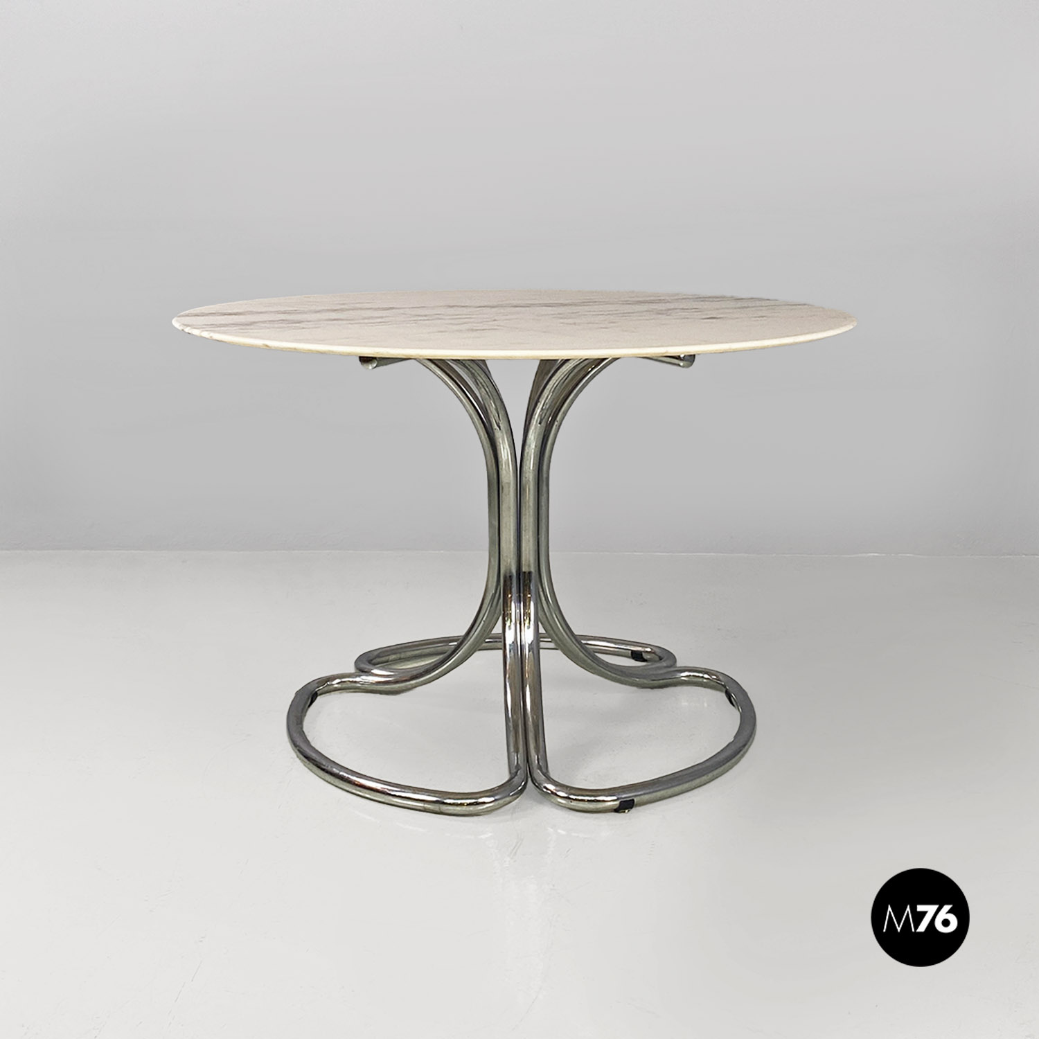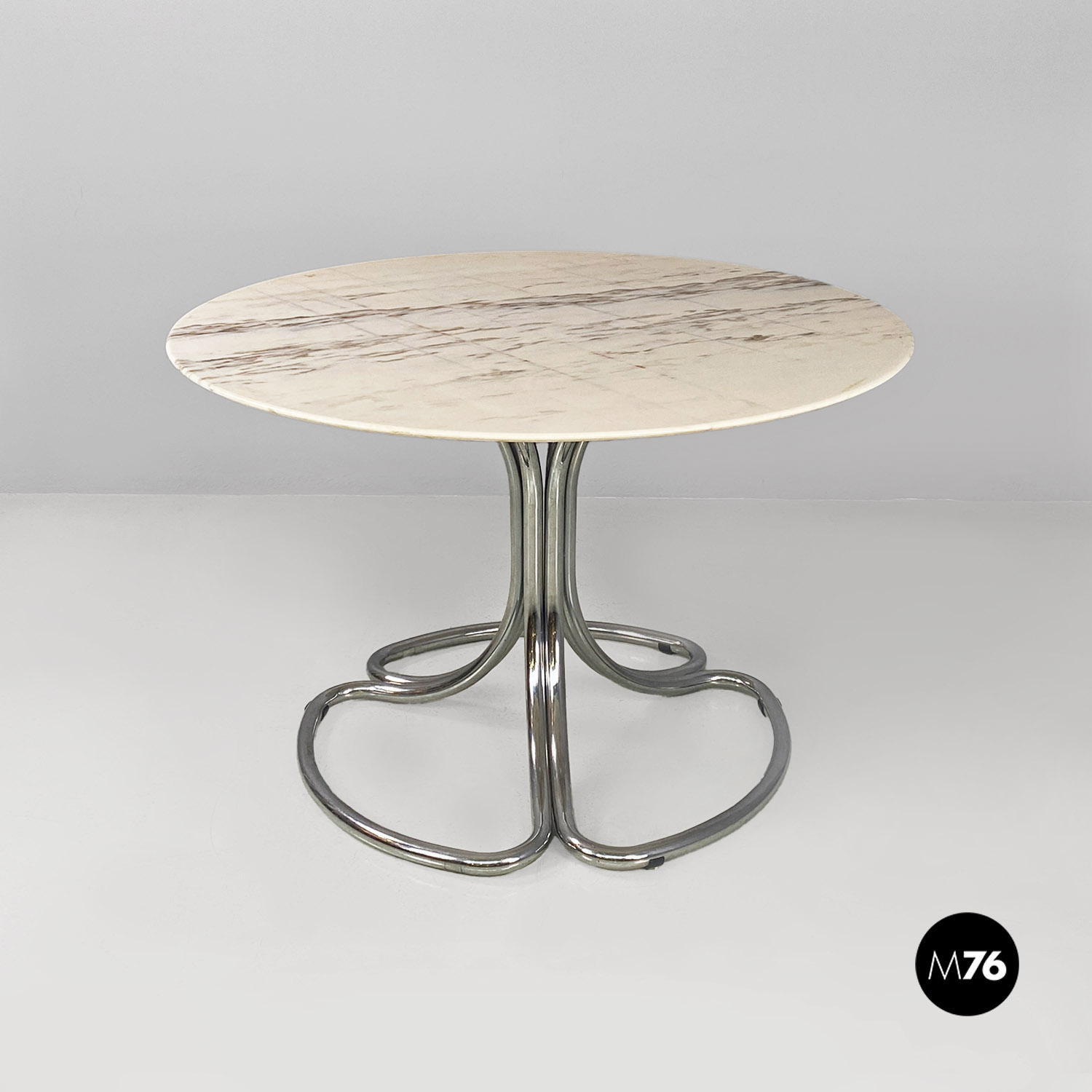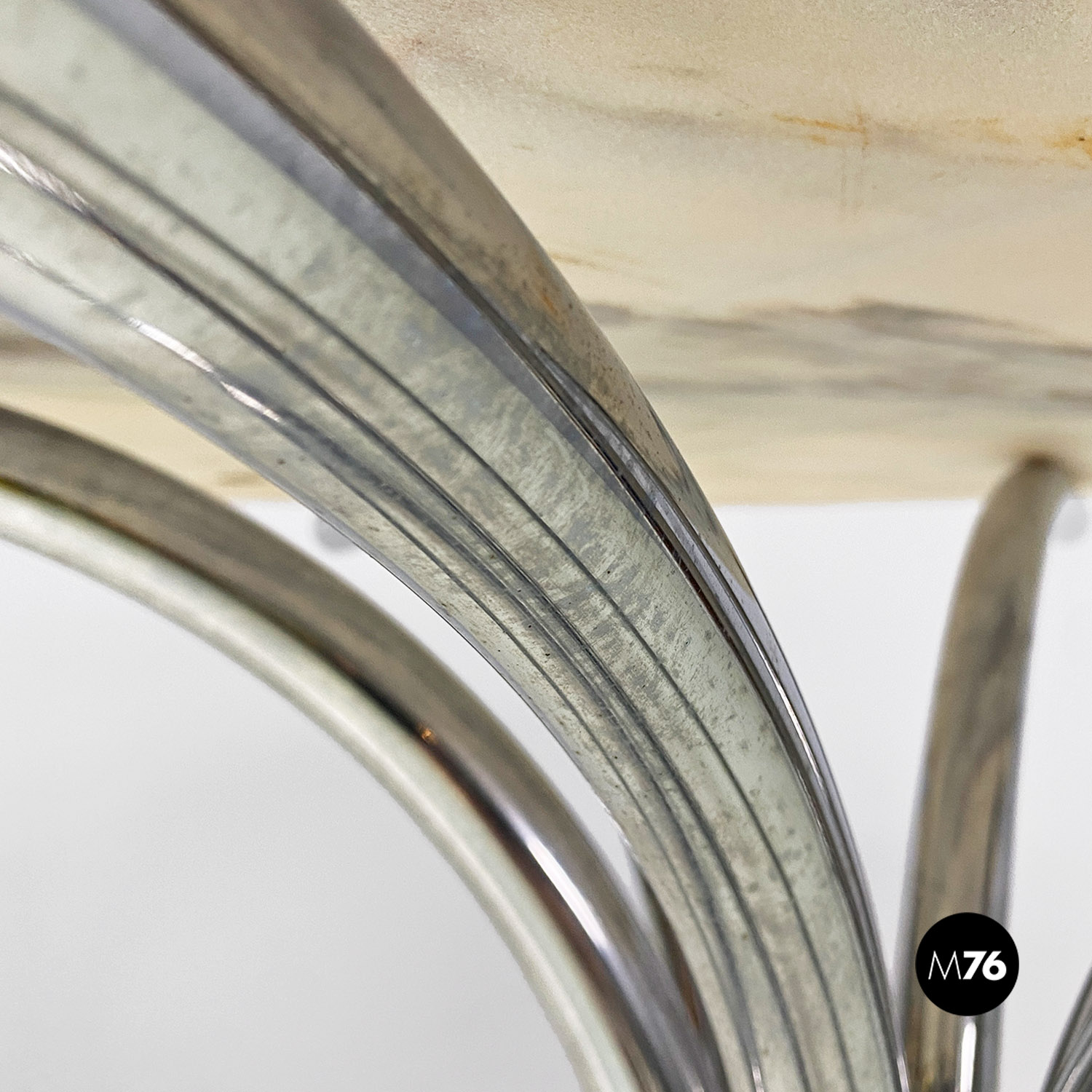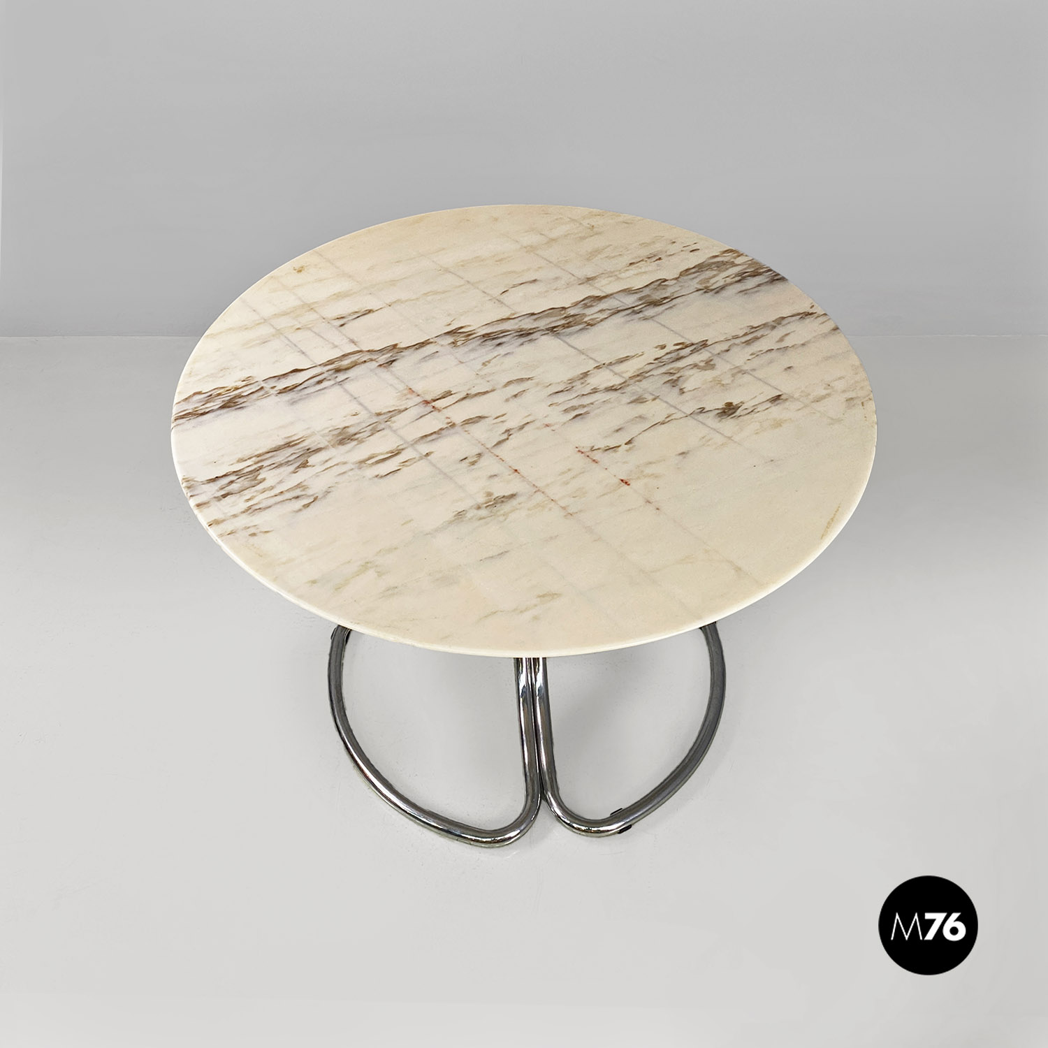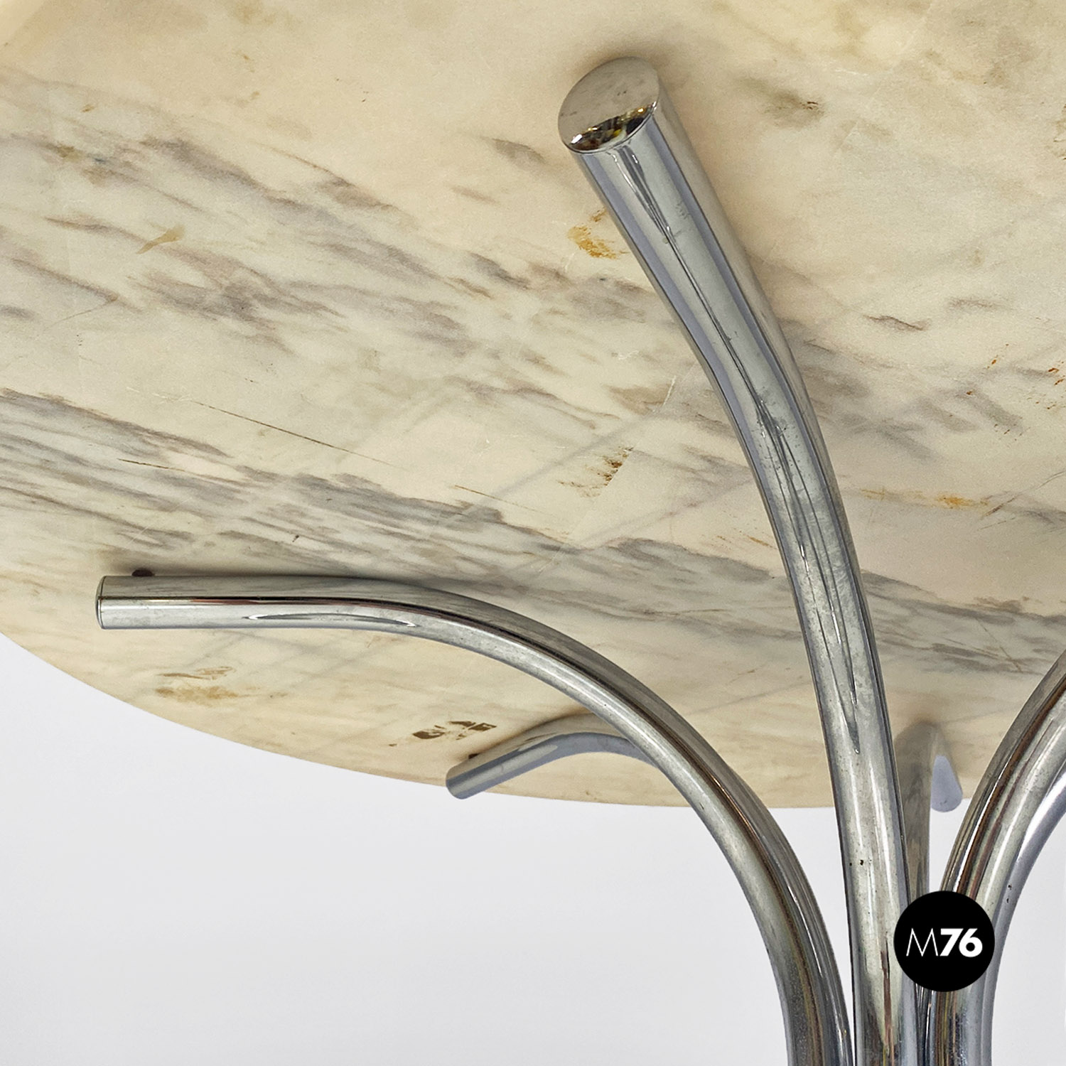 Tavolo da pranzo con piano in marmo rosa del Portogallo, con venature molto particolari e struttura snodata in acciaio cromato.