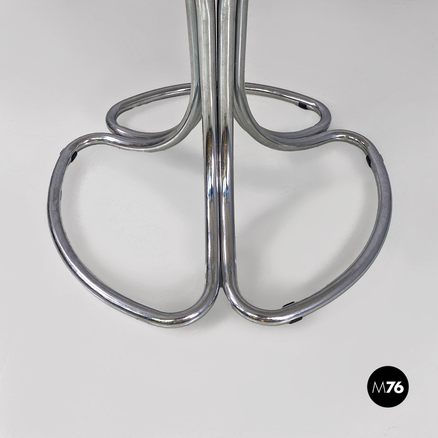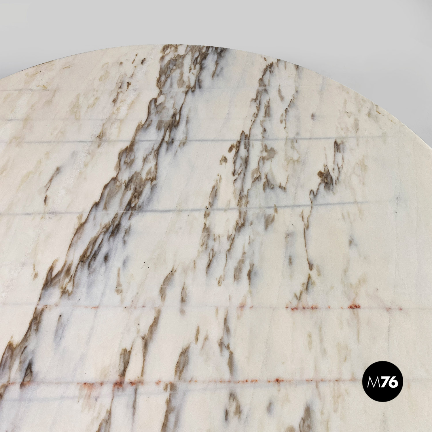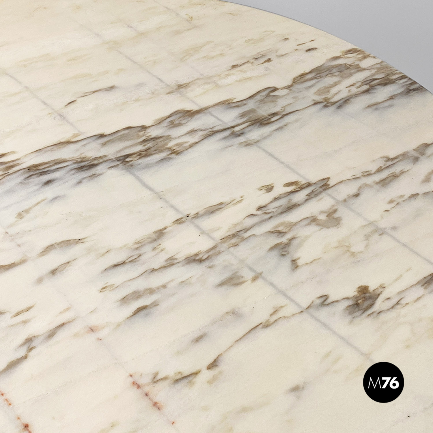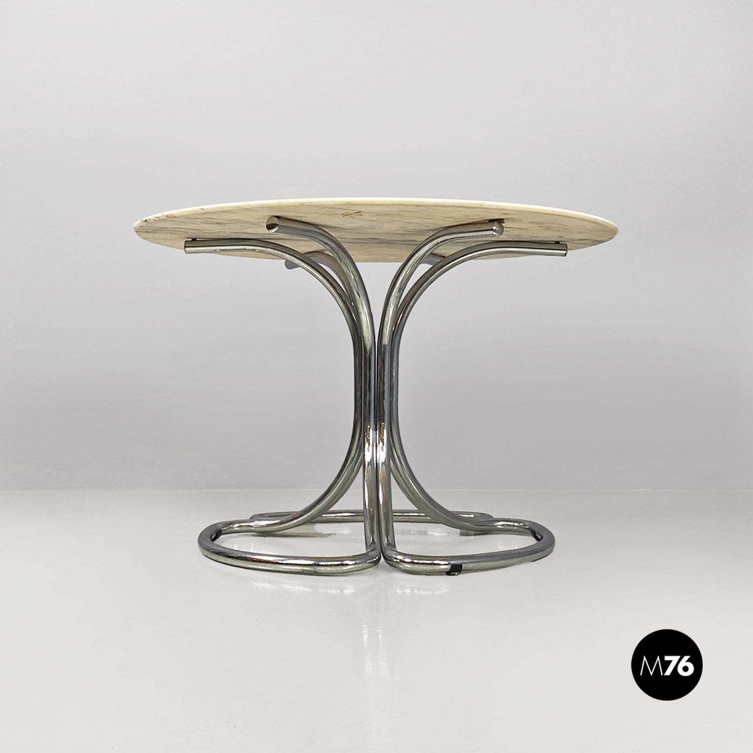 Tavolo da pranzo con piano in marmo rosa del Portogallo, con venature molto particolari e struttura snodata in acciaio cromato.
