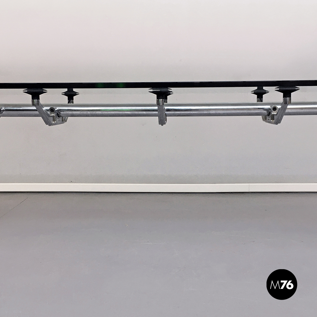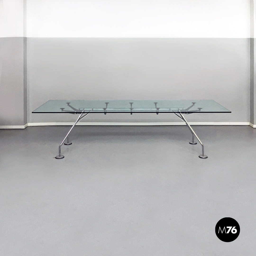 Tavolo da pranzo modello Nomos, con struttura in acciaio cromato con puntali e ventose d’appoggio.
