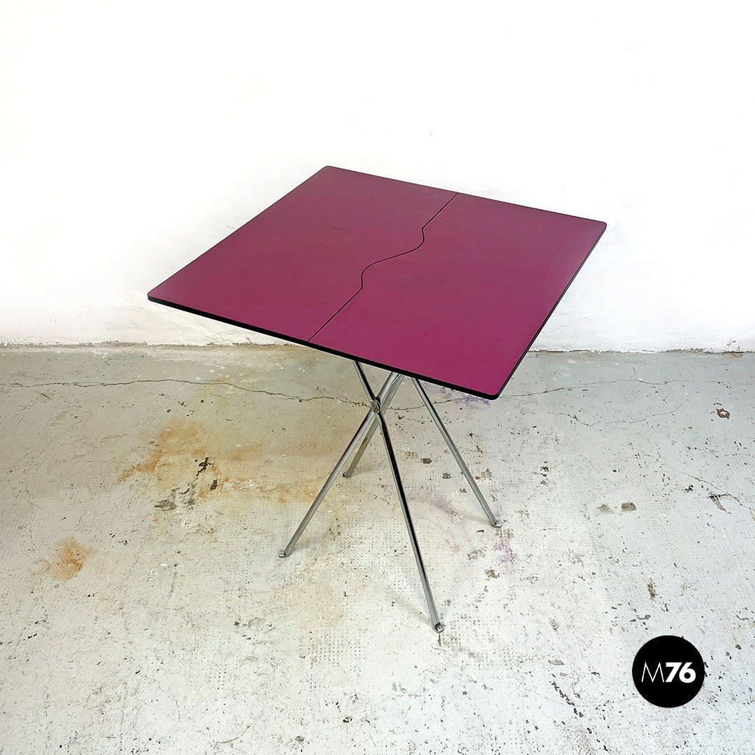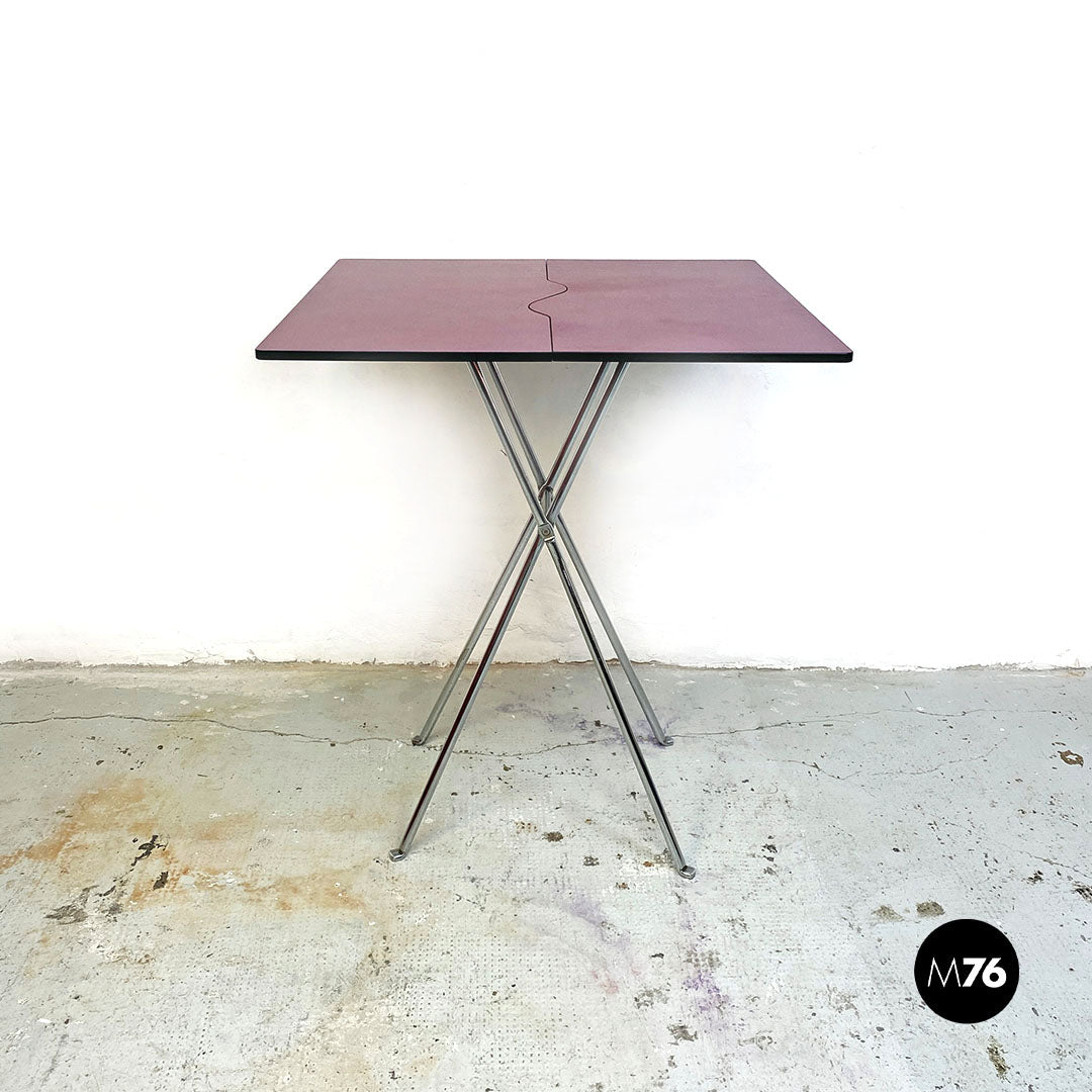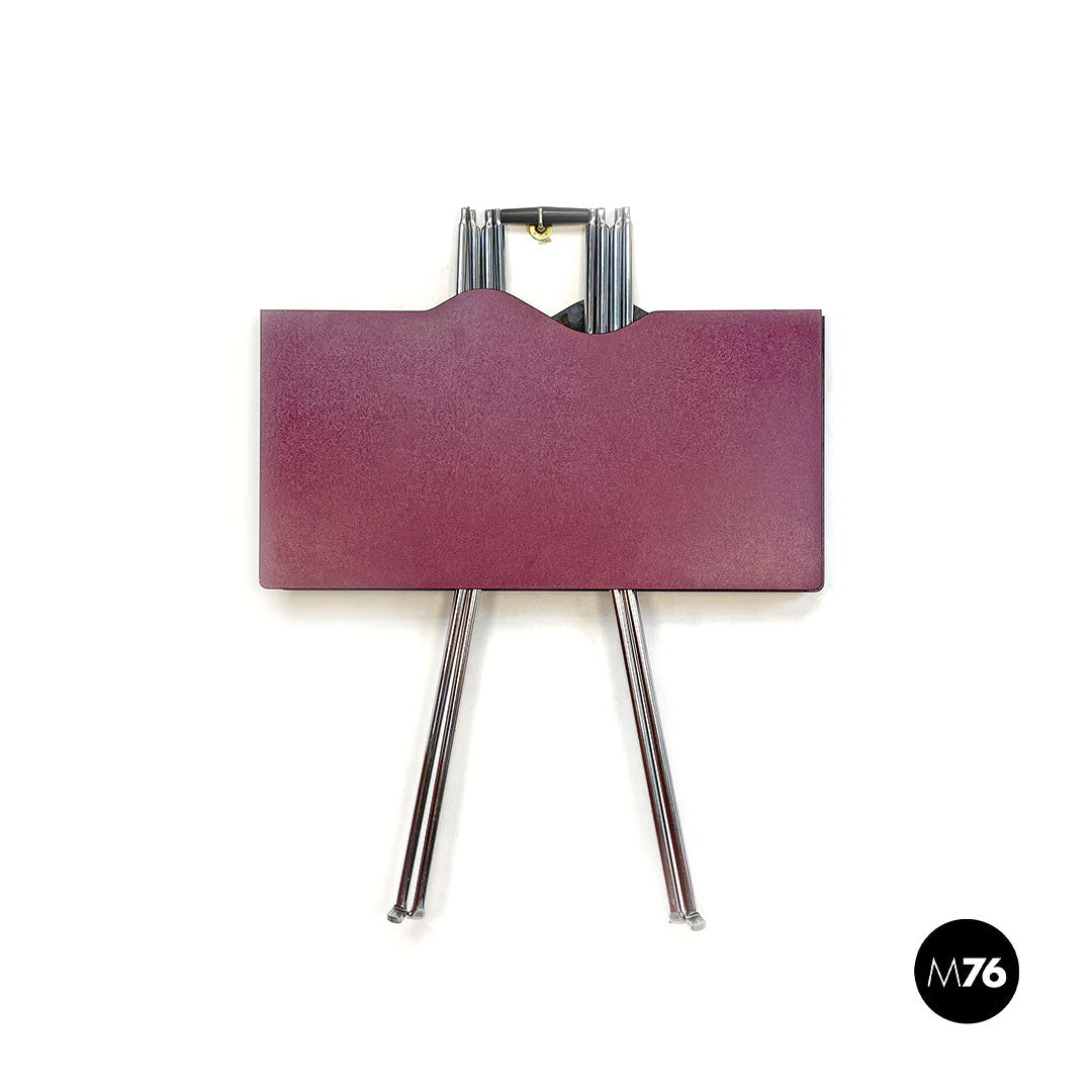 Tavolo pieghevole con struttura in tondino di acciaio cromato, con piano color vinaccia e bordo nero, diviso in due parti complementari.
