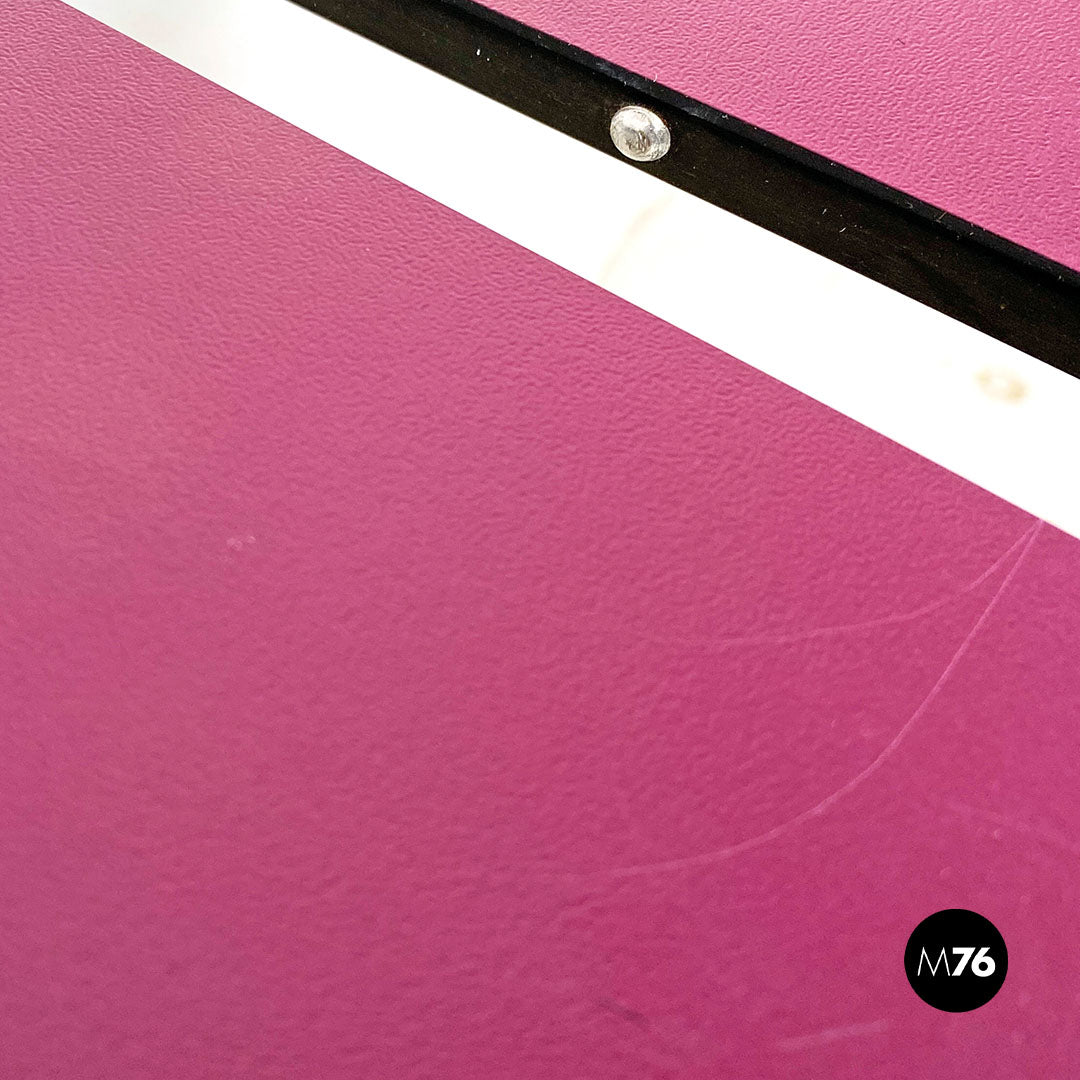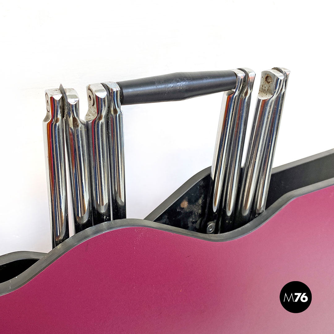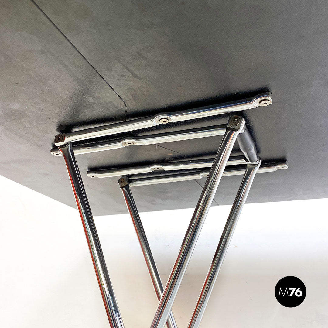 Tavolo pieghevole con struttura in tondino di acciaio cromato, con piano color vinaccia e bordo nero, diviso in due parti complementari.