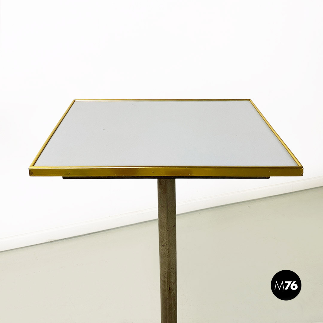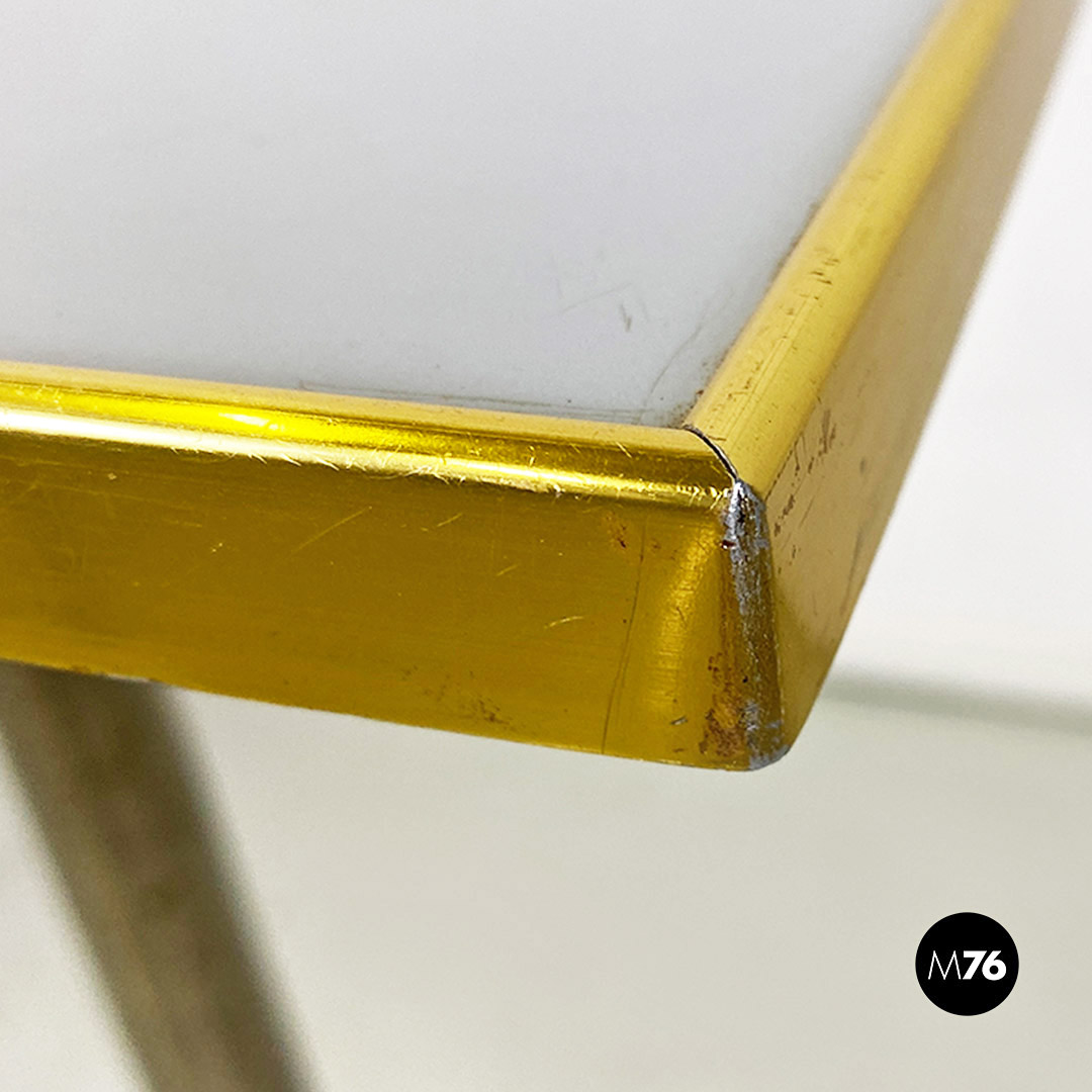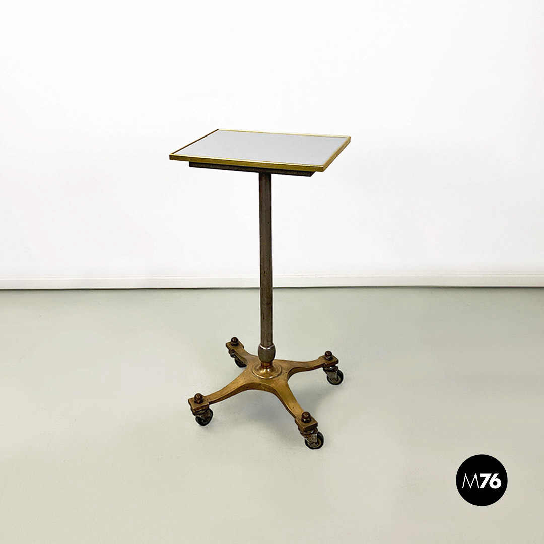 Tavolino con piano rettangolare in formica bianco, struttura in ottone e base a quattro razze con ruote.