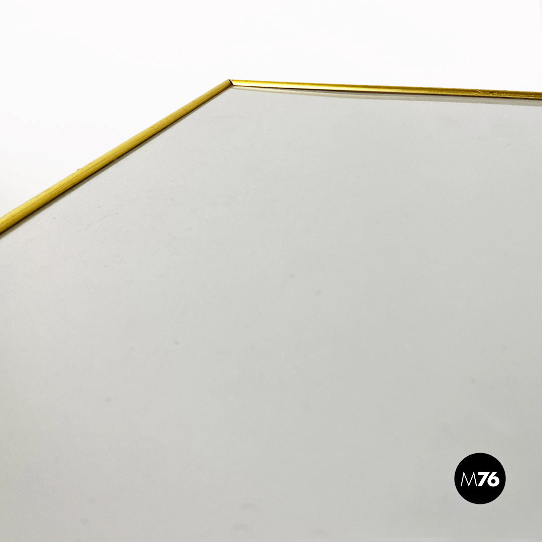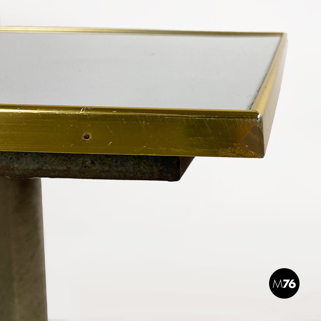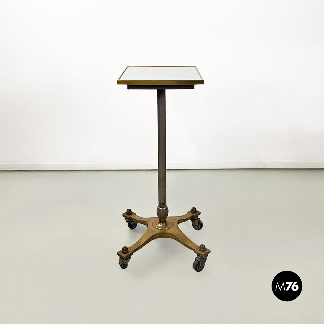 Tavolino con piano rettangolare in formica bianco, struttura in ottone e base a quattro razze con ruote.