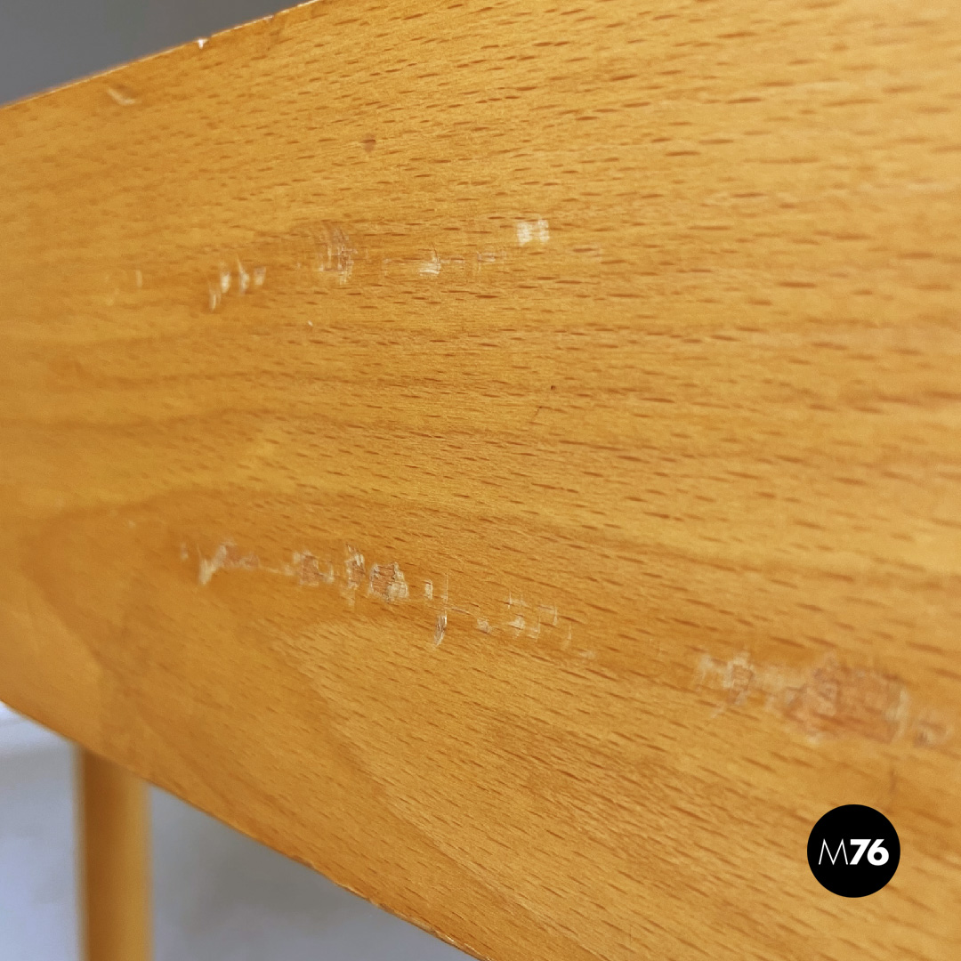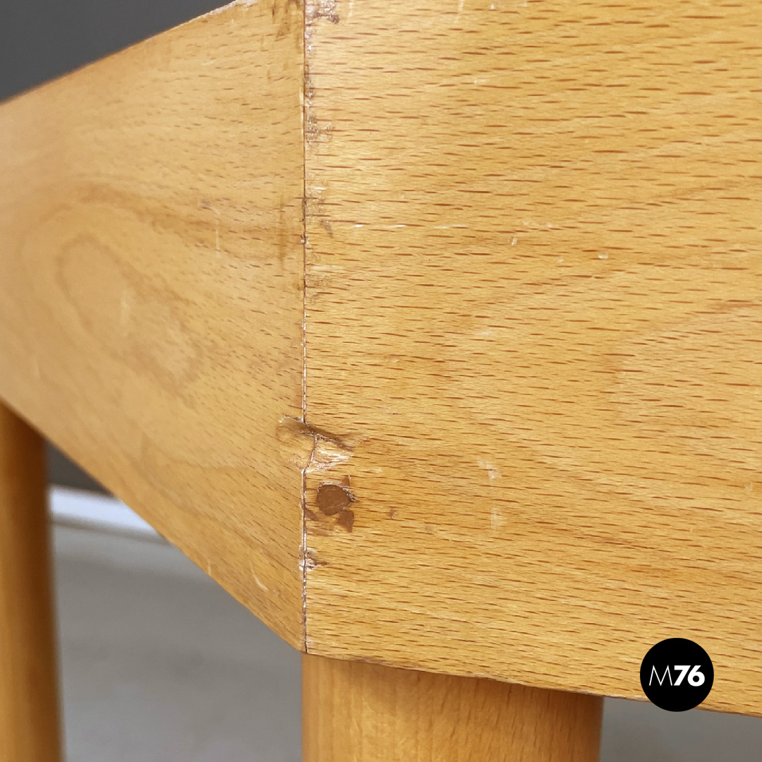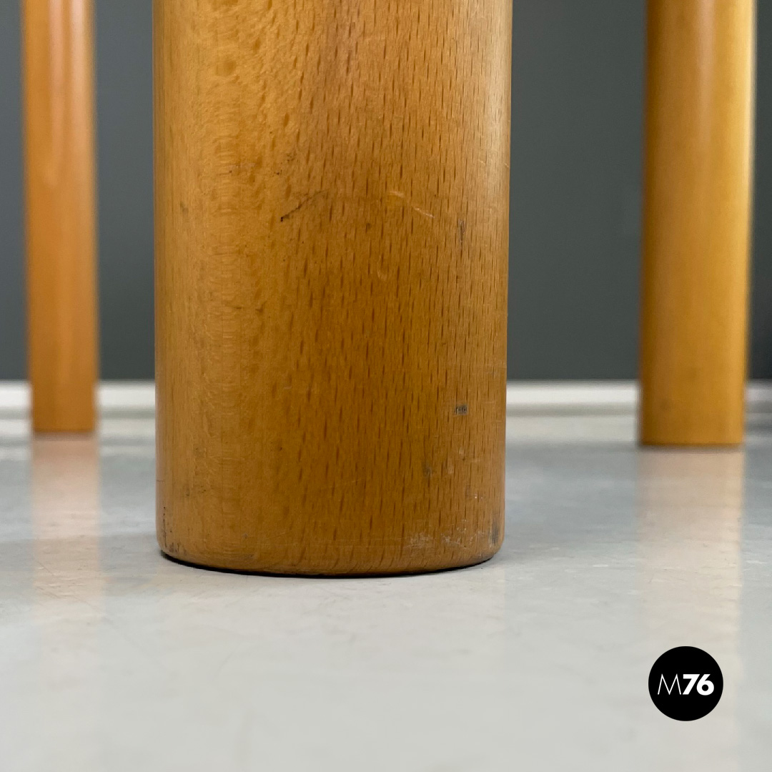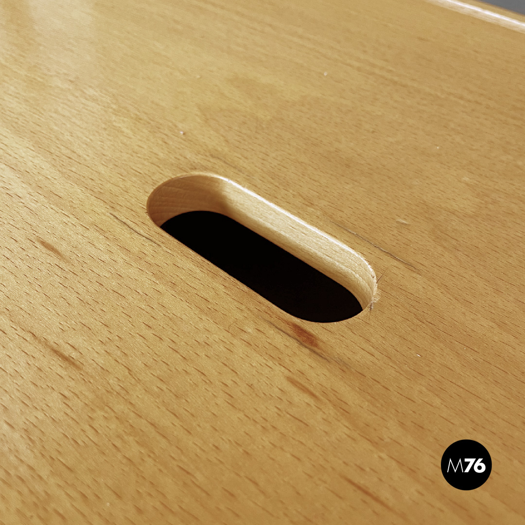 Tavolo da pranzo con piano di forma parallelepipeda in legno chiaro. Presenta un foro nella parte centrale del piano, che funge come maniglia per poterlo sollevare ed accedere al vano interno del tavolo. Ha quattro gambe a sezione tonda in legno.