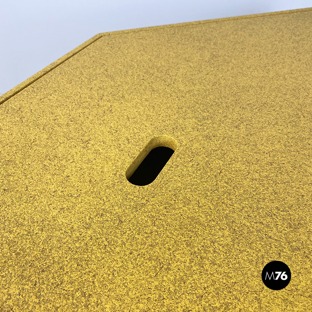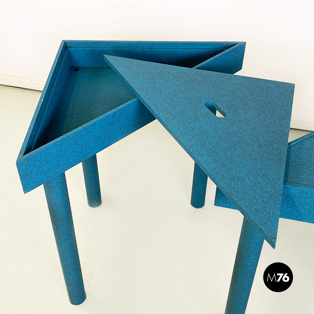 Tavolo modulare modello Tangram utilizzabile in varie configurazioni, come tavolo da pranzo, consolle o scrivania. Composto da quattro pezzi di cui due gemelli a triangolo, di colore blu, uno giallo dalla forma a trapezio, con piano estraibile a coperchio come per i primi due moduli blu ed infine quarto pezzo di forma triangolare di colore grigio, con area pari alla somma dei primi tre moduli. Struttura in legno di faggio colorato. Interamente smontabili.