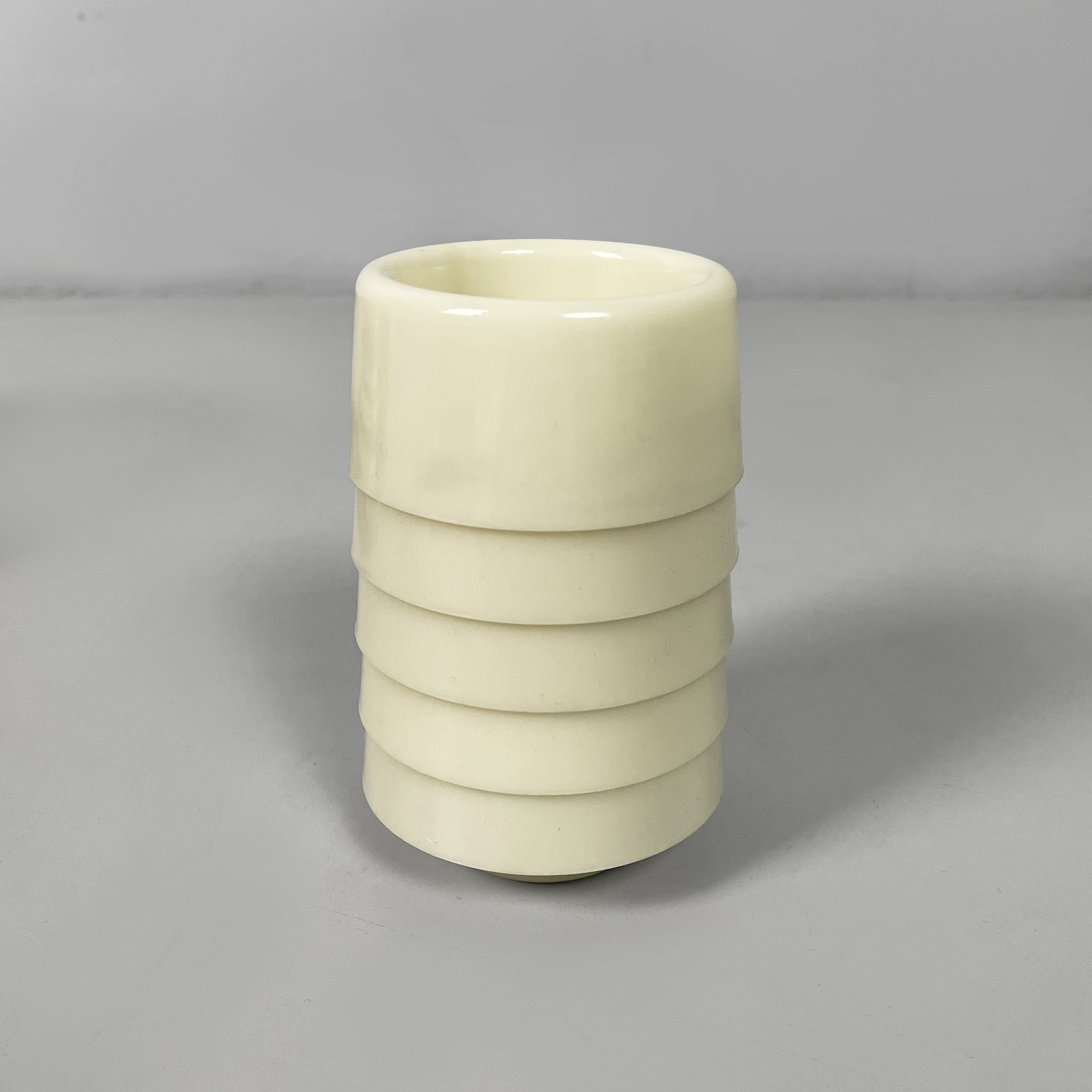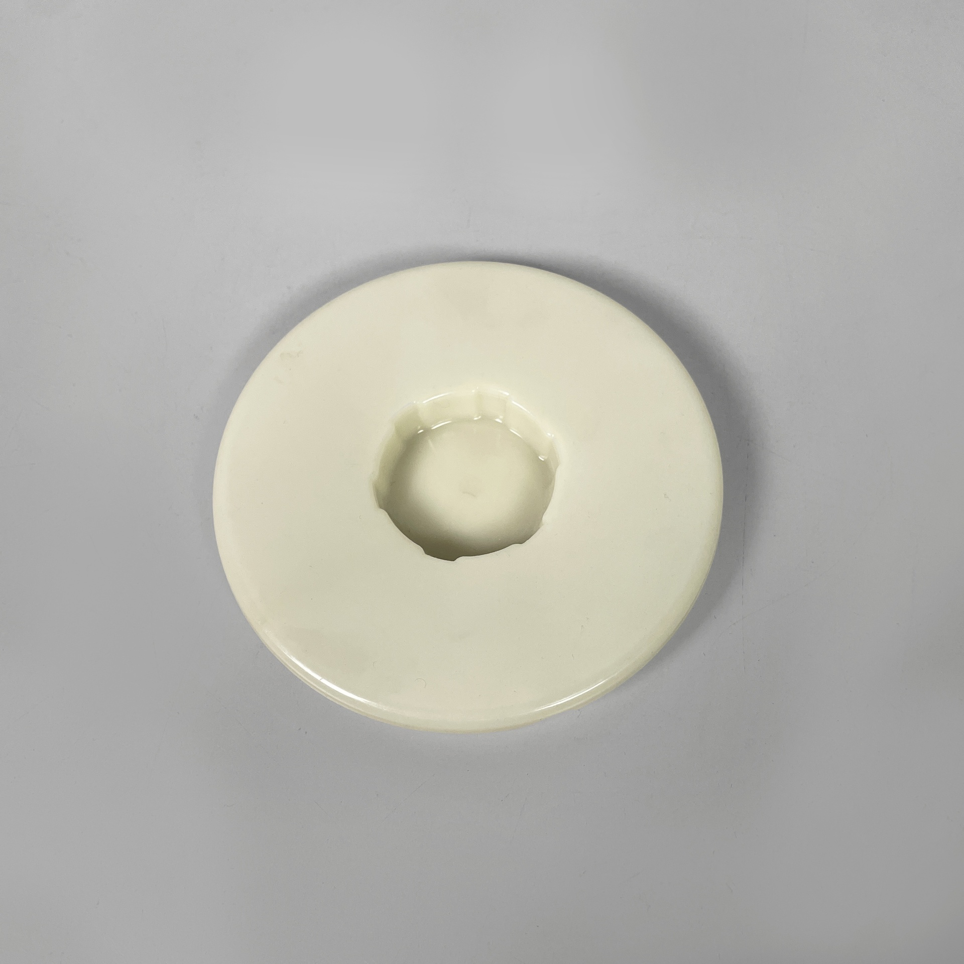 Servizio da tavolo in plastica bianca composto da sei tazzine e diciassette piattini a base tonda. Impilabili.