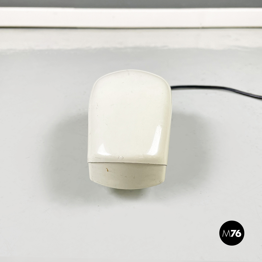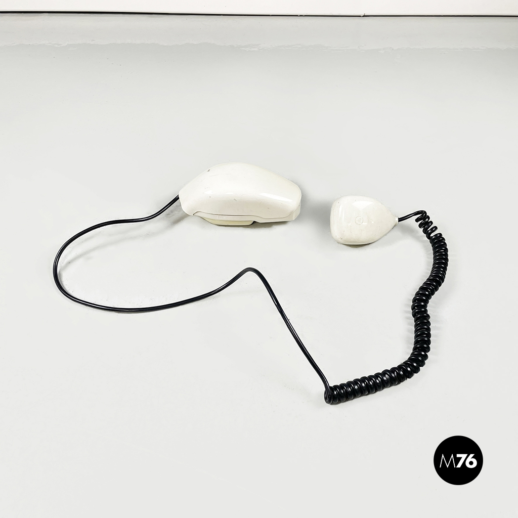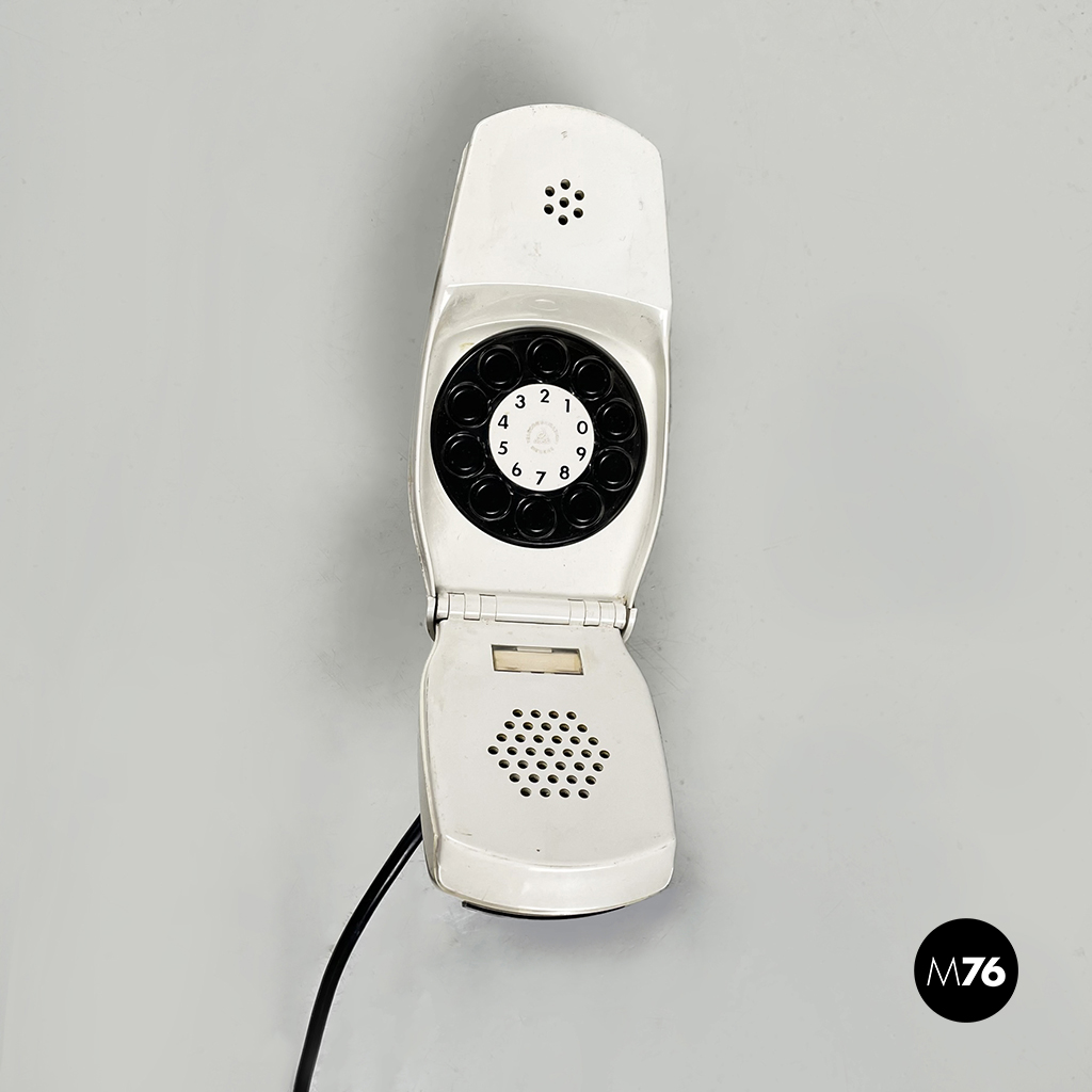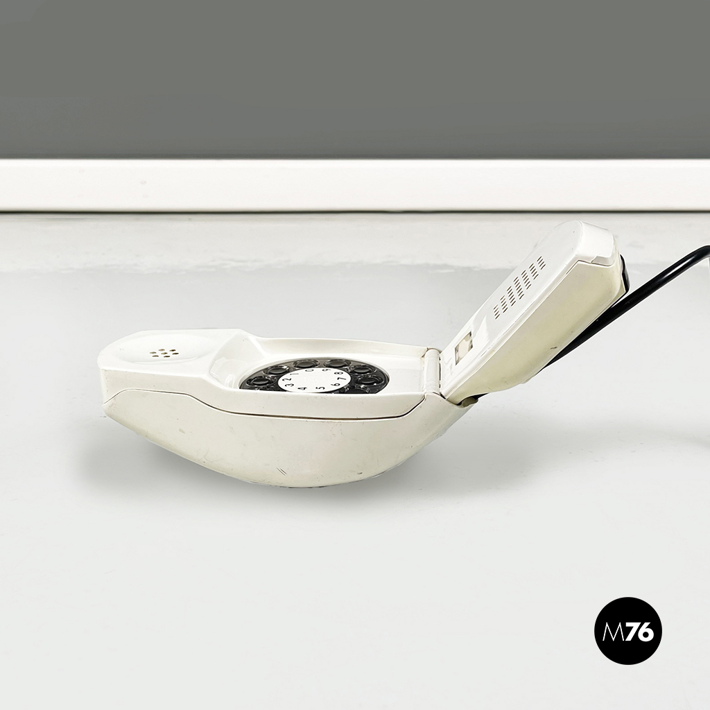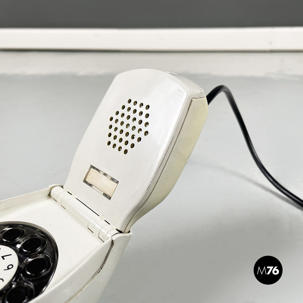 Telefono modello Grillo a forma di “conchiglia” in plastica. La cornetta telefonica è composta da due parti pieghevoli, in plastica bianca con tasti neri.