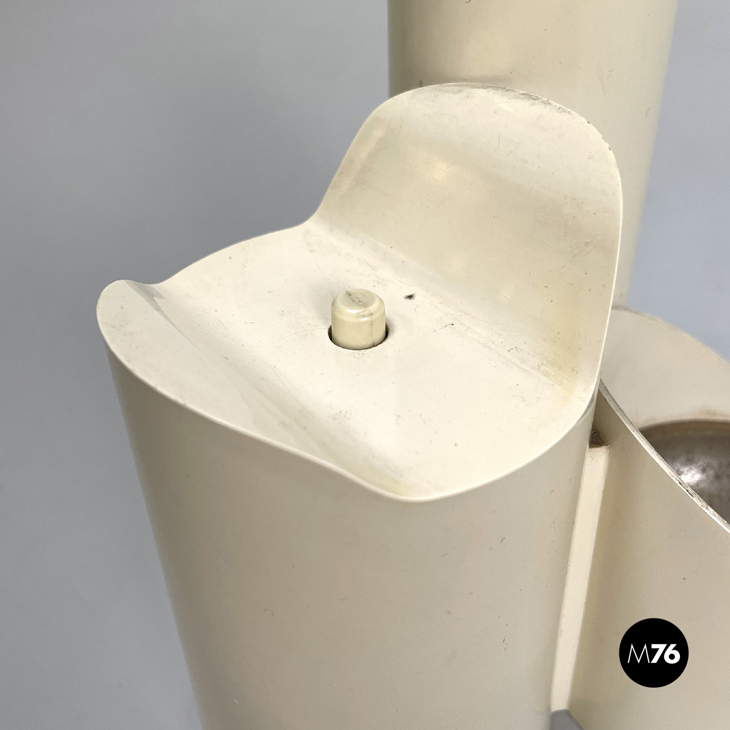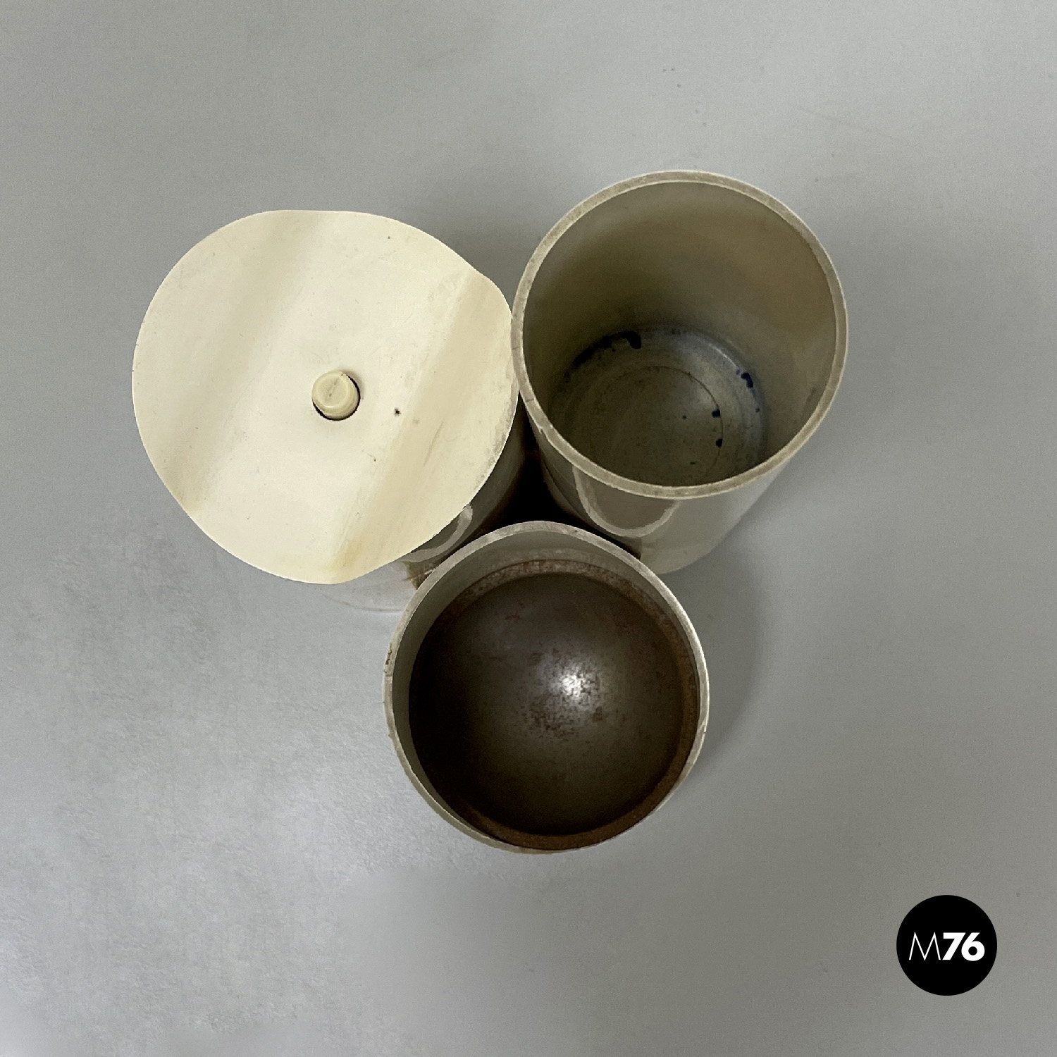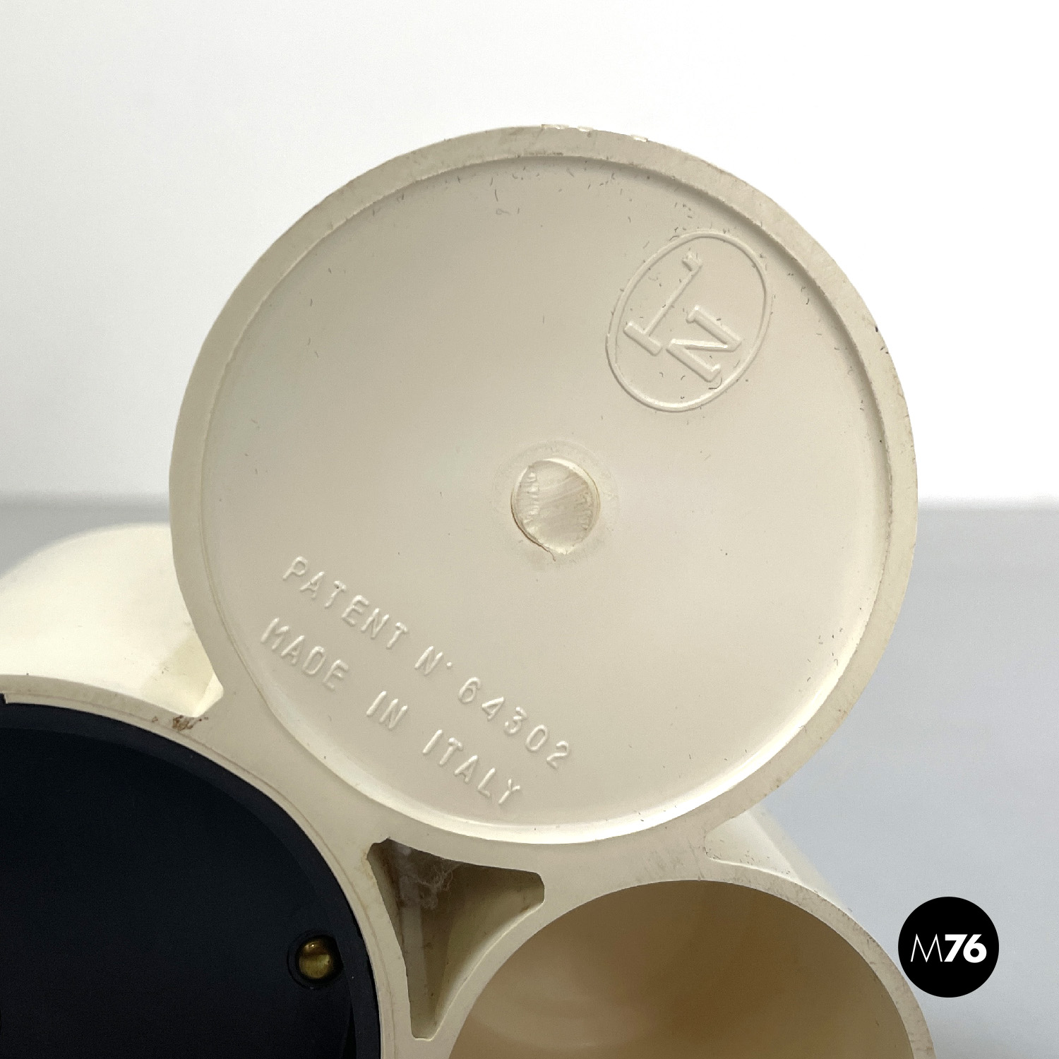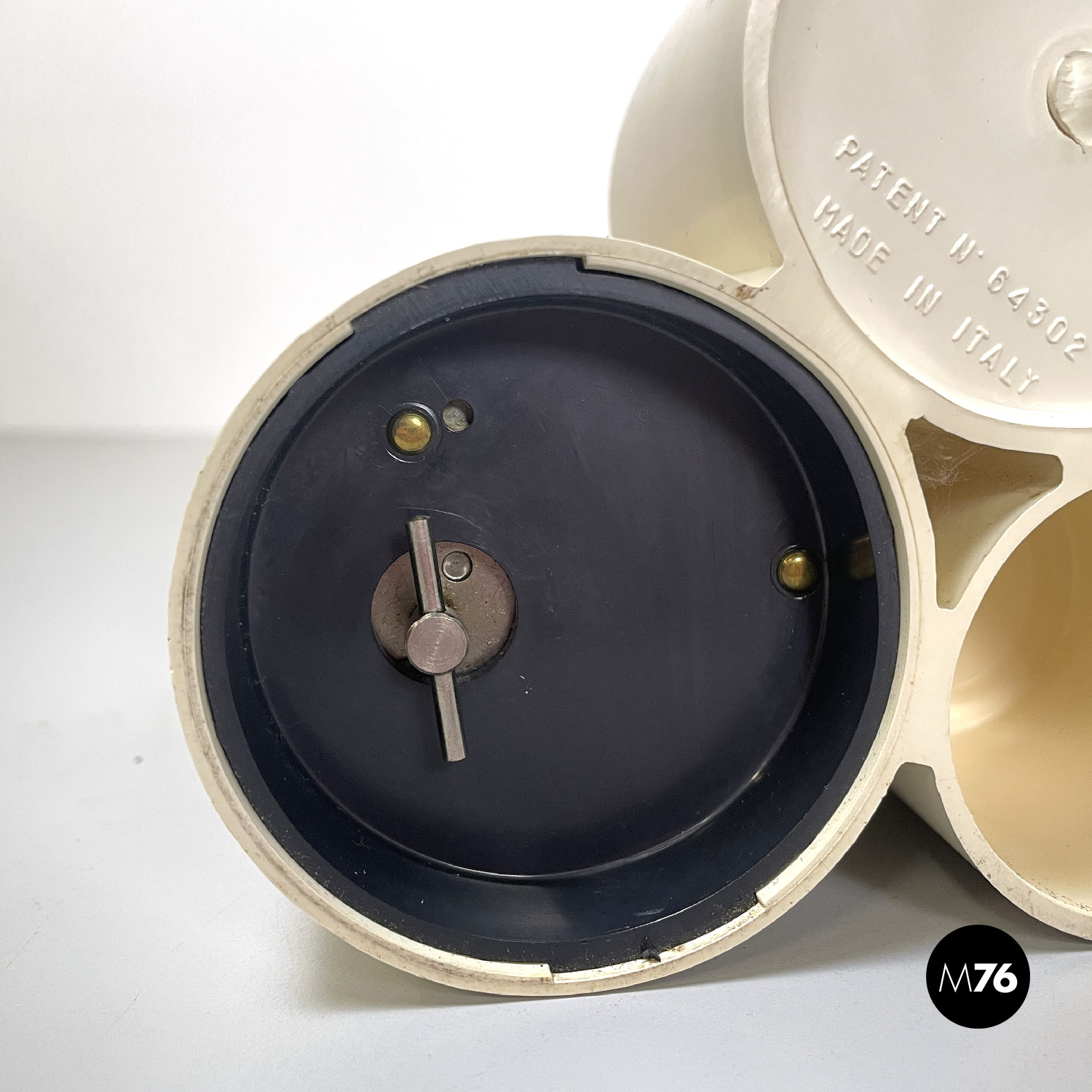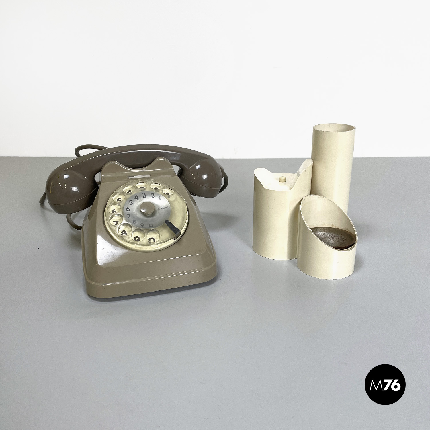Set composto da un telefono fisso con disco rotante e carillon reggi cornetta. Il telefono è in plastica grigia tortora con disco trasparente. Il carillon reggi cornetta è il plastica bianca ed composto da tre elementi cilindrici: Il più basso contiene una mezza sfera in metallo, il più alto ha un foro ed è utilizzabile come porta penne mentre il cilindro centrale è quello con la funzione di reggi cornetta. Il carillon si carica con l’apposita levetta sotto la base e appoggiando la cornetta sul pulsante del cilindro centrale si attiva il suono.