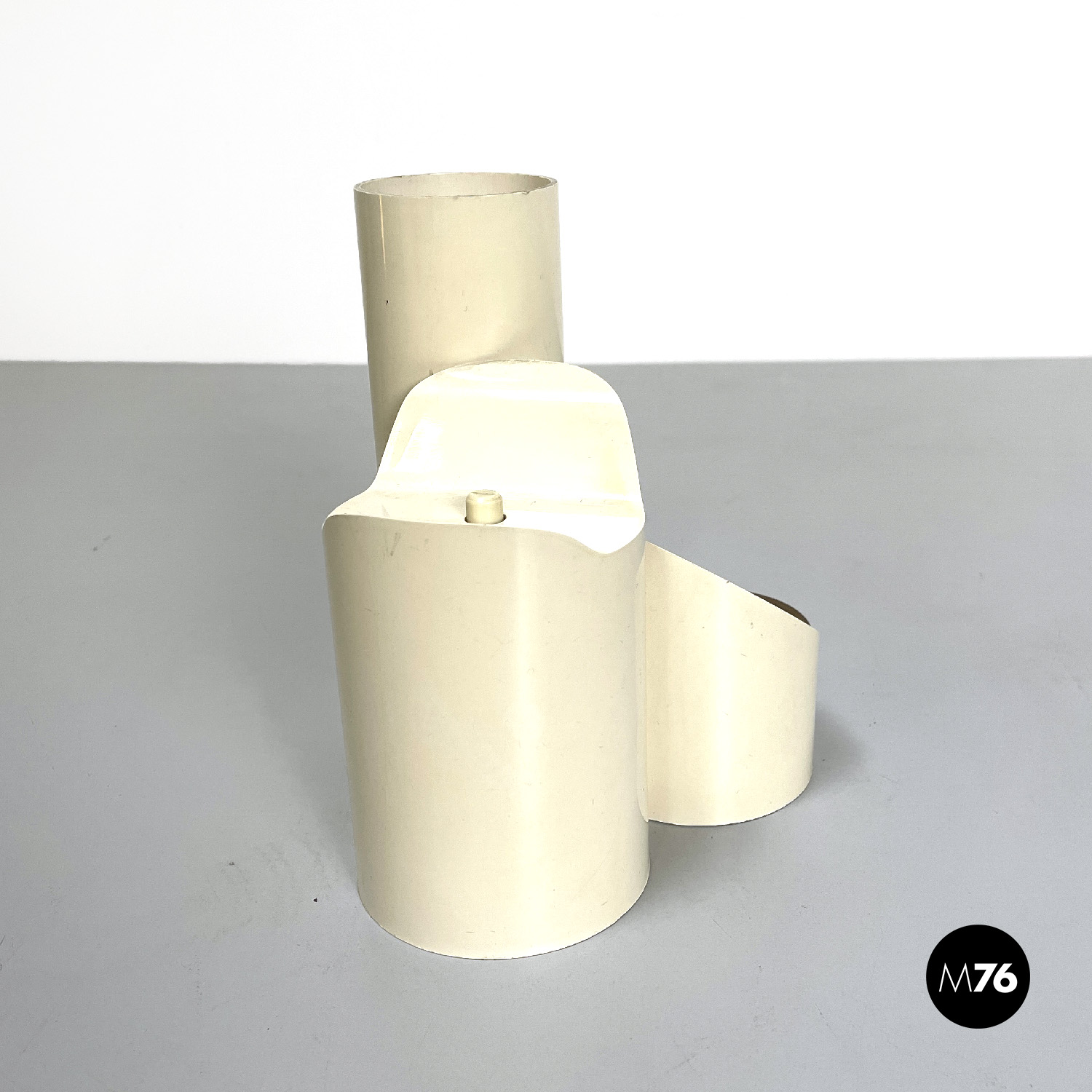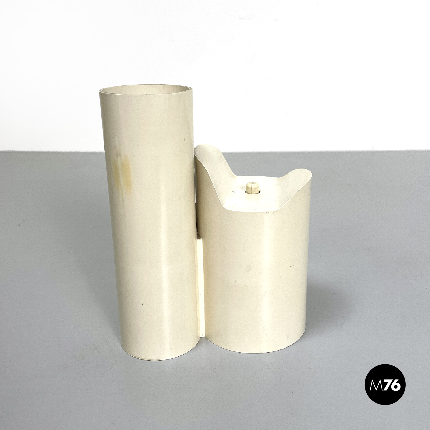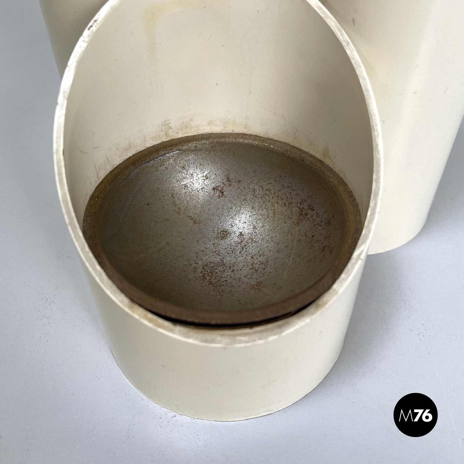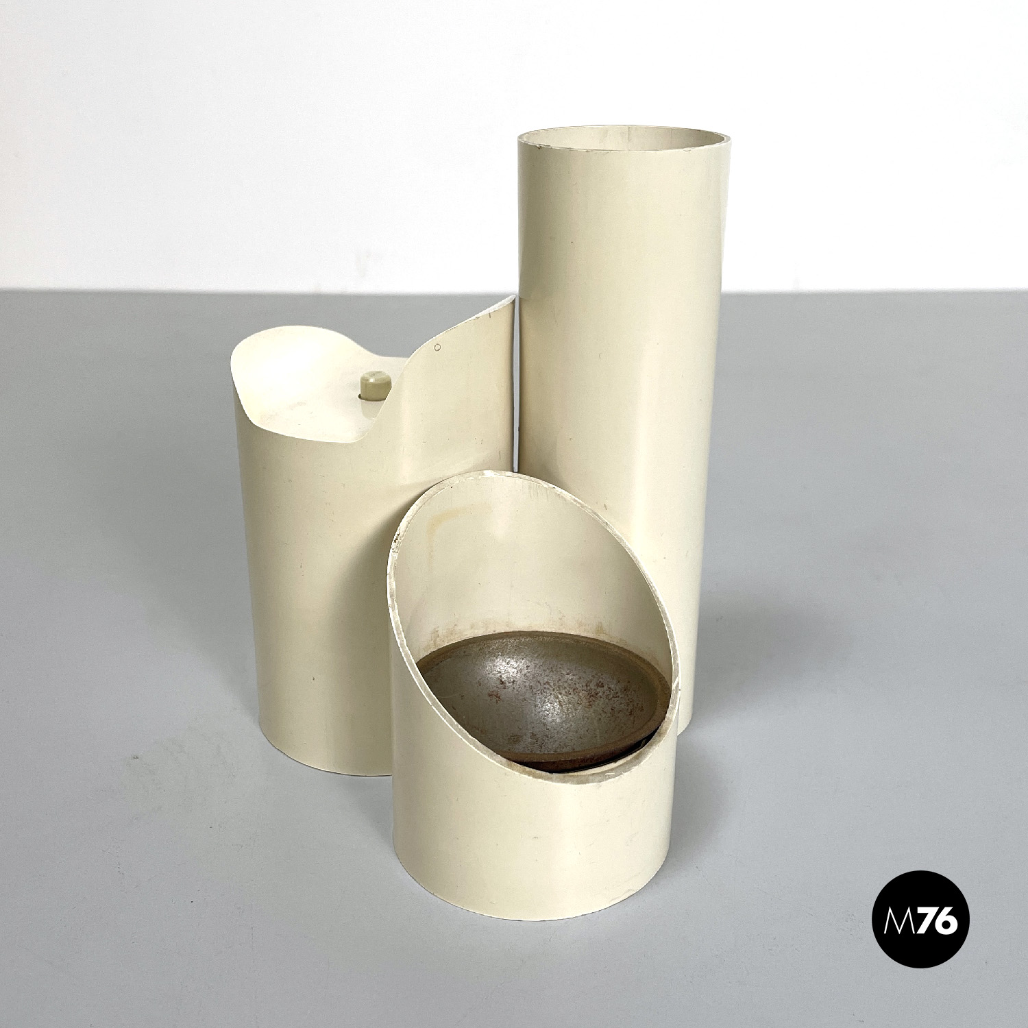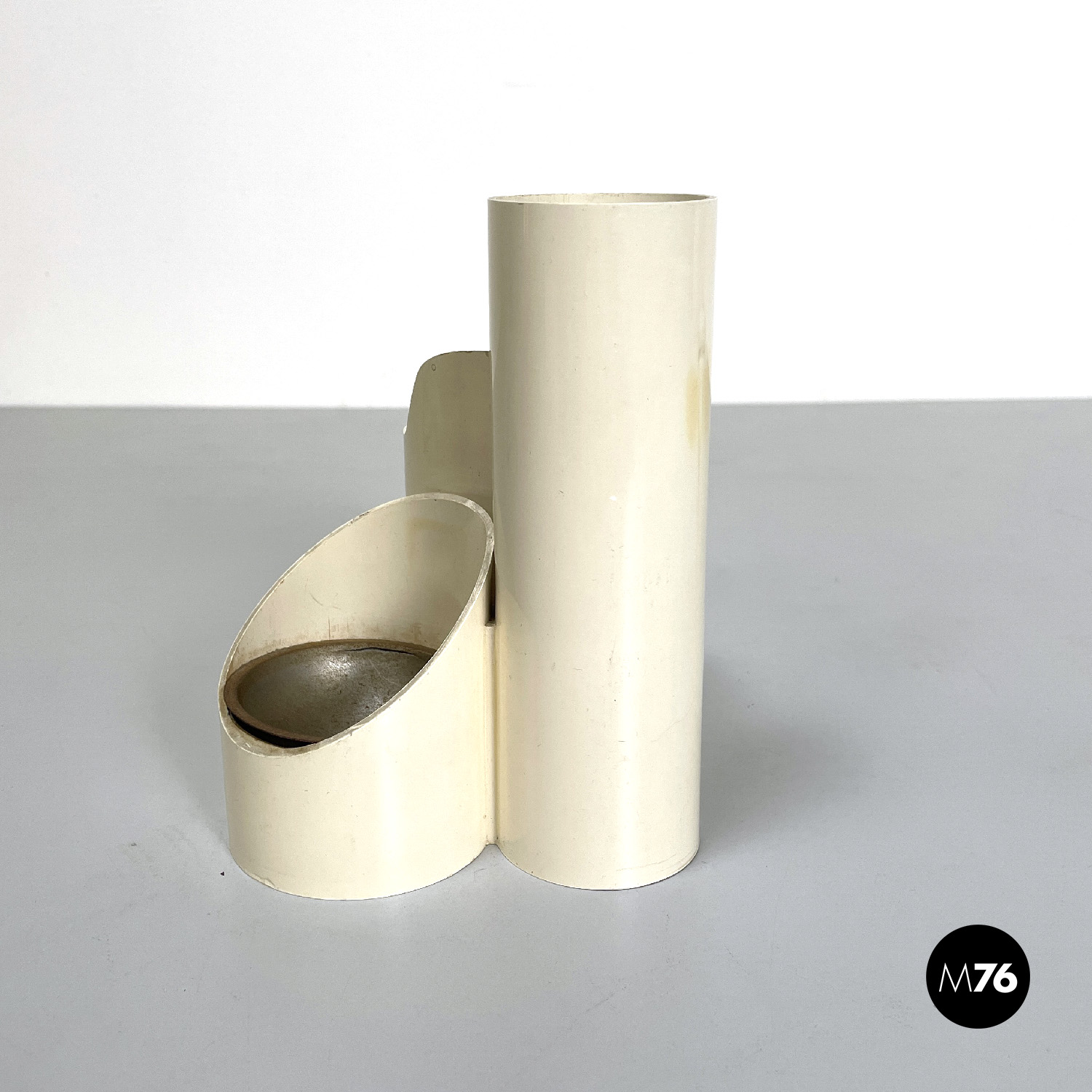 Set composto da un telefono fisso con disco rotante e carillon reggi cornetta. Il telefono è in plastica grigia tortora con disco trasparente. Il carillon reggi cornetta è il plastica bianca ed composto da tre elementi cilindrici: Il più basso contiene una mezza sfera in metallo, il più alto ha un foro ed è utilizzabile come porta penne mentre il cilindro centrale è quello con la funzione di reggi cornetta. Il carillon si carica con l’apposita levetta sotto la base e appoggiando la cornetta sul pulsante del cilindro centrale si attiva il suono.