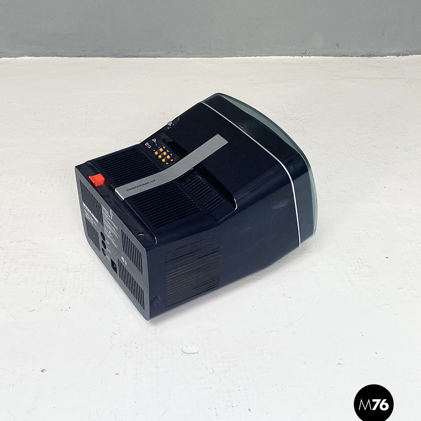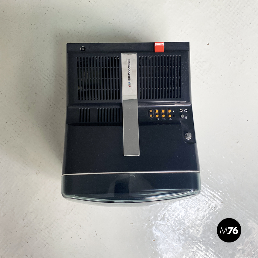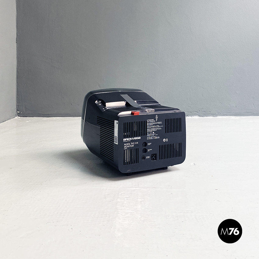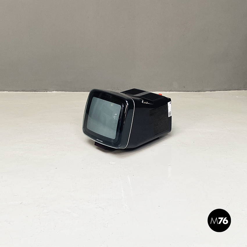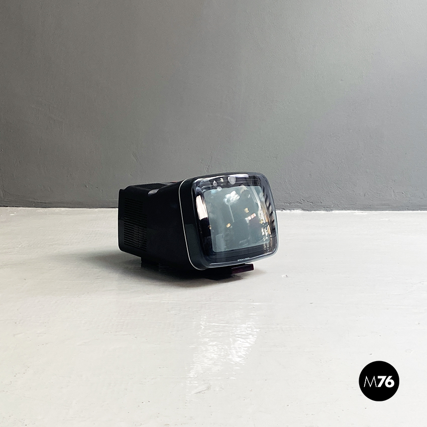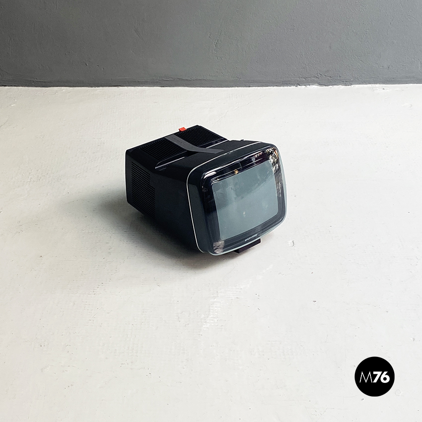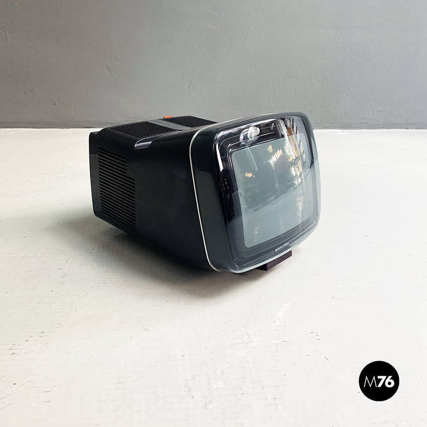 Televisione Brionvega Algol 11 nera, realizzata con materiale plastico colorato (ABS) e con l’utilizzo dei transistor. La parte anteriore della struttura si conclude con lo schermo che permette la visione anche quando l’apparecchio è posato a terra.