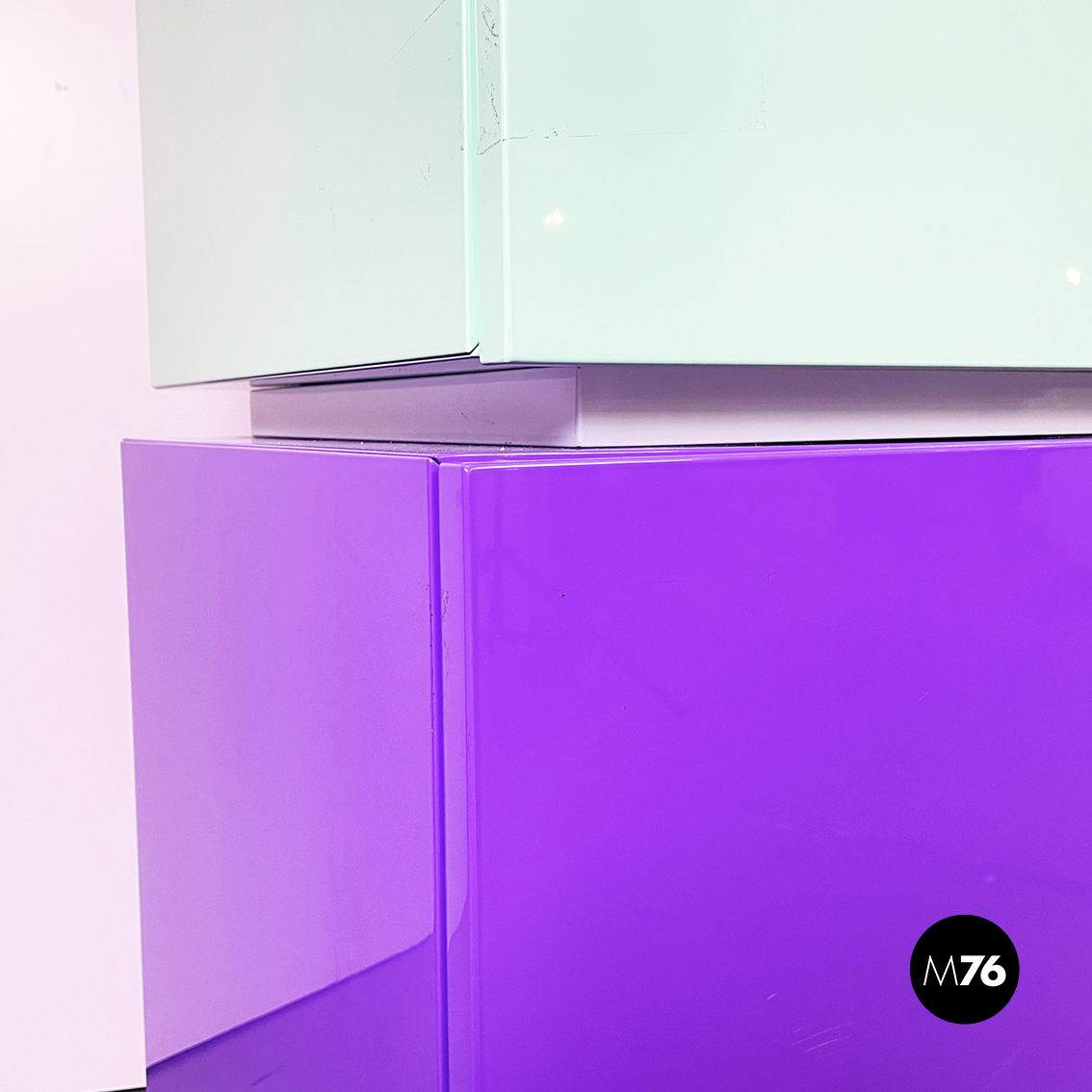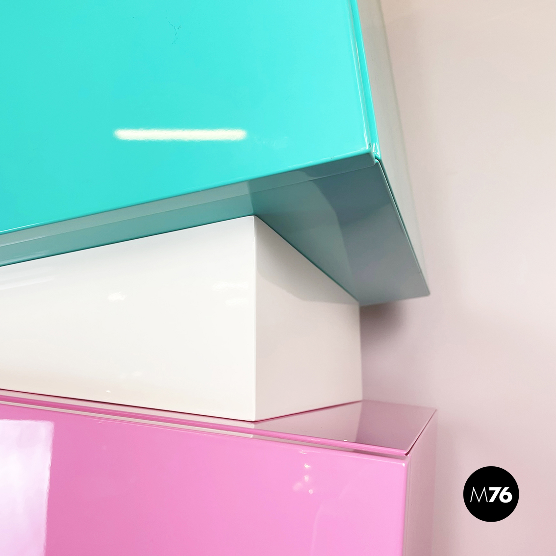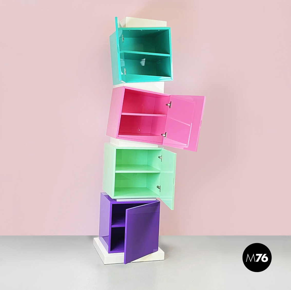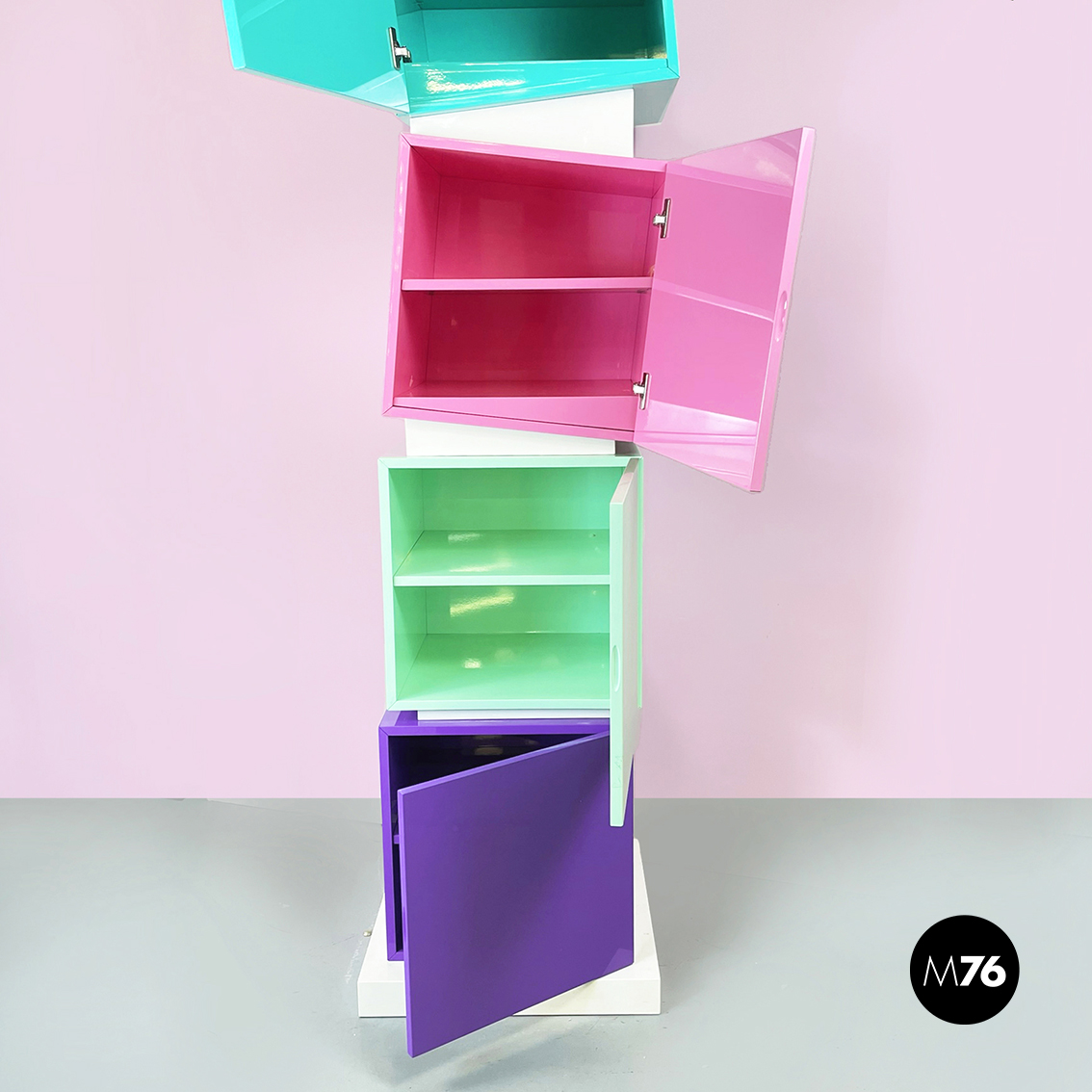 Coppia di totem modello Disordinati, pezzi unici di questa collezione. Il totem presenta una struttura a base quadrata in legno laccato bianco. Sul fronte ha 4 vani sporgenti in legno laccato colorato in azzurro, rosa, verde chiaro e viola. Ogni vano presenta un anta a battente e una mensola interna. Ogni vano presenta un’inclinazione differente. Utilizzabili come credenza.