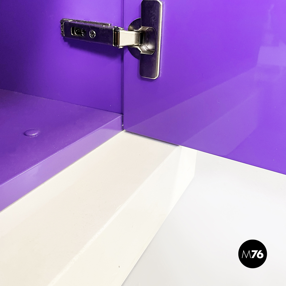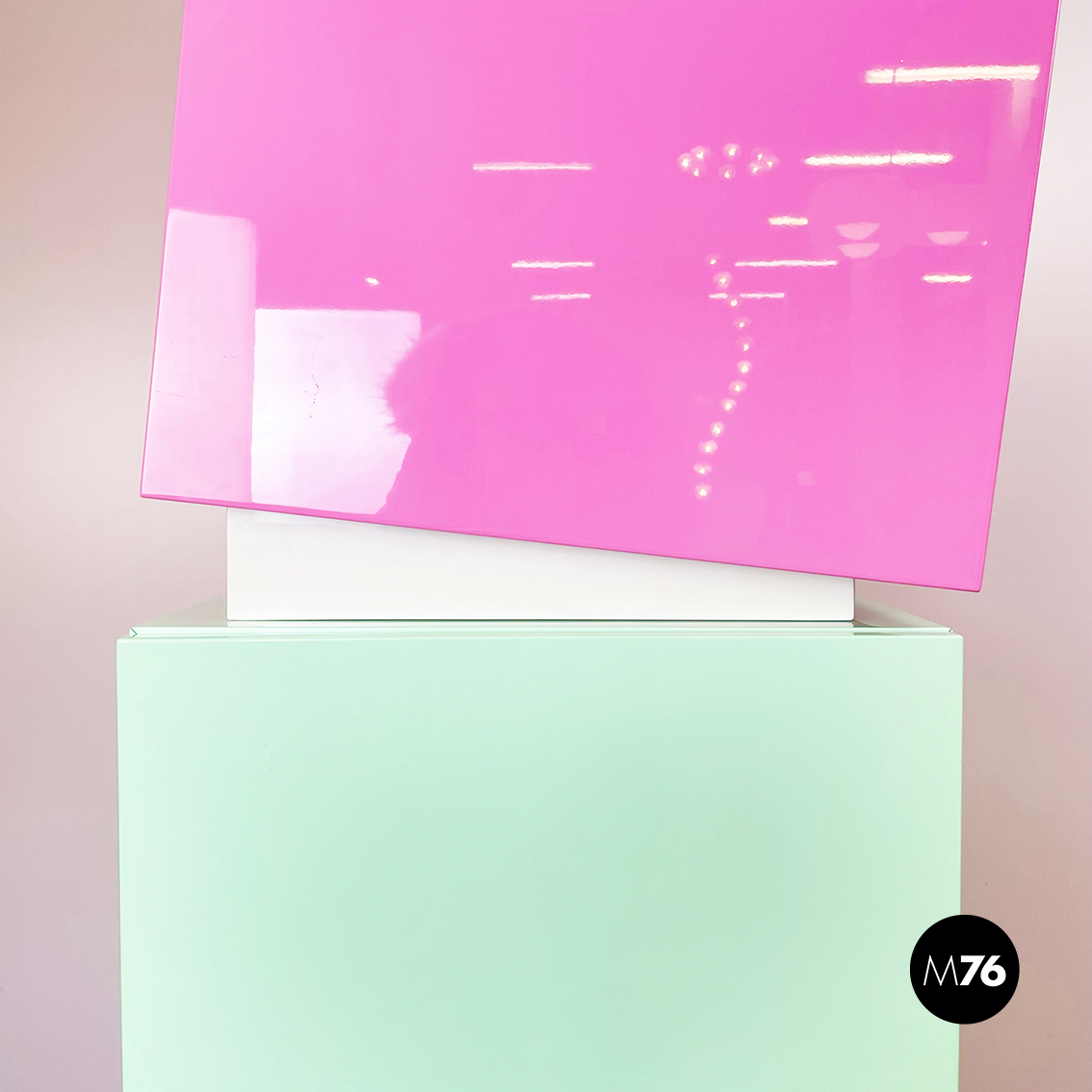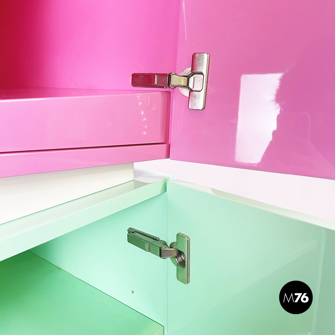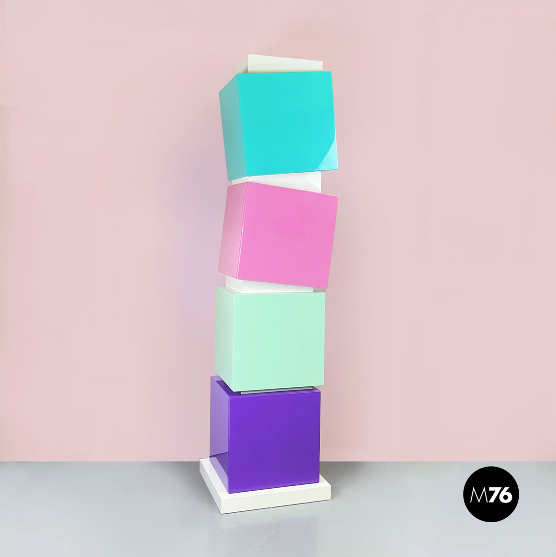 Coppia di totem modello Disordinati, pezzi unici di questa collezione. Il totem presenta una struttura a base quadrata in legno laccato bianco. Sul fronte ha 4 vani sporgenti in legno laccato colorato in azzurro, rosa, verde chiaro e viola. Ogni vano presenta un anta a battente e una mensola interna. Ogni vano presenta un’inclinazione differente. Utilizzabili come credenza.