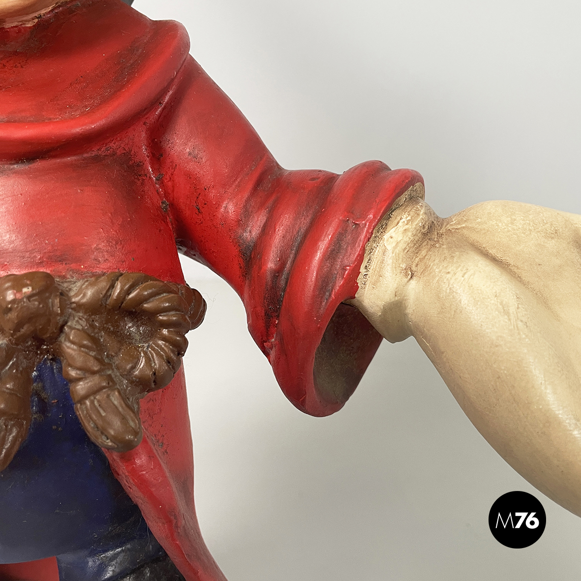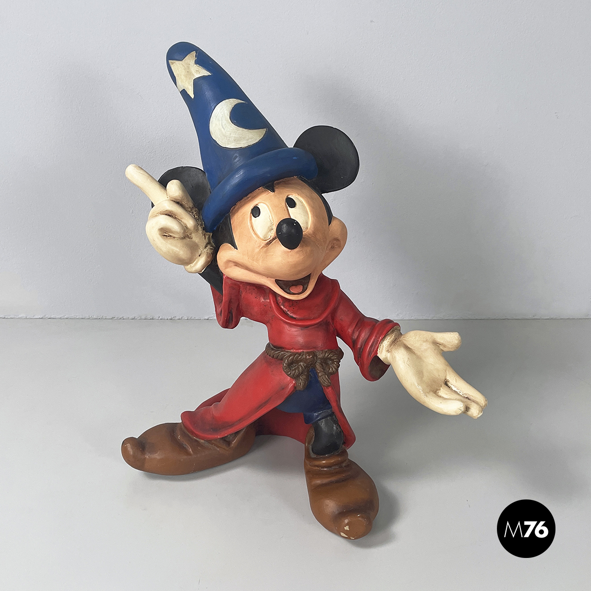 Scultura di Topolino apprendista stregone, proveniente dall’iconico film Fantasia. Il personaggio, vestito con un mantello rosso, il cappello blu con luna e stelle bianche e guanti bianchi, è in piedi con un dito rivolto verso l’alto. La statua è interamente in resina policroma dipinta.