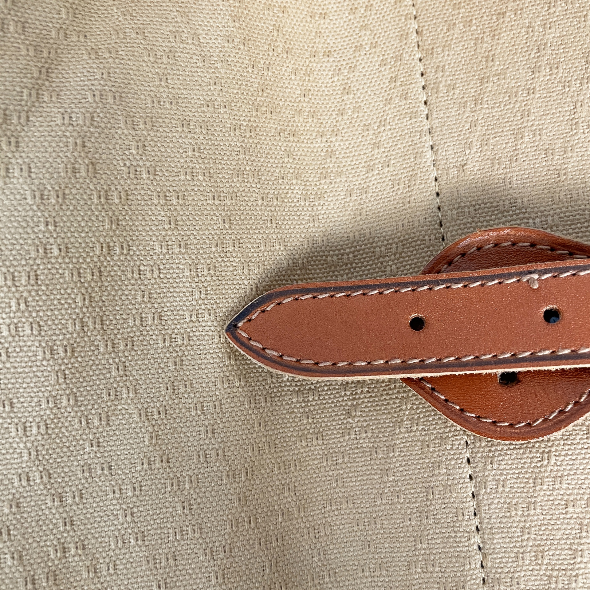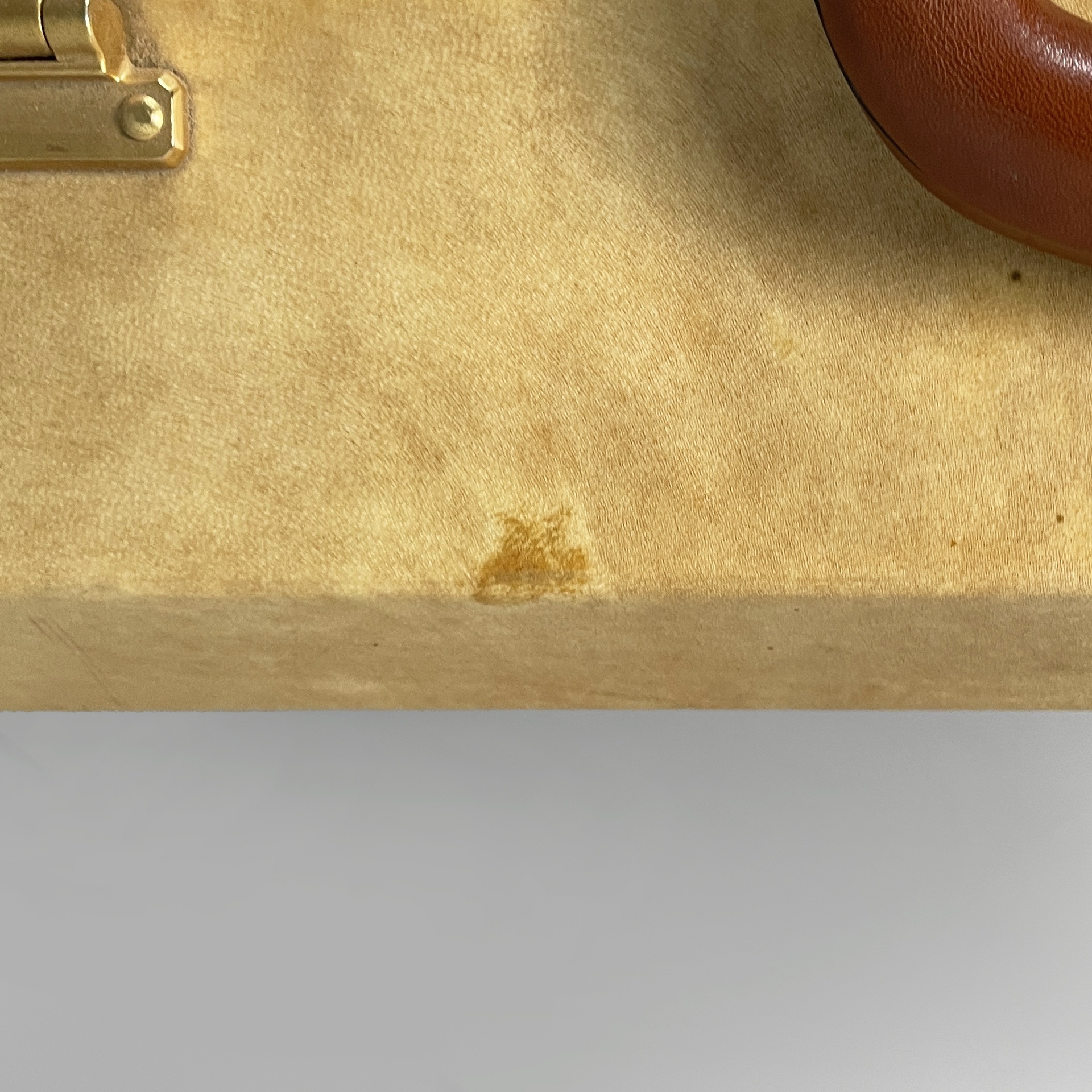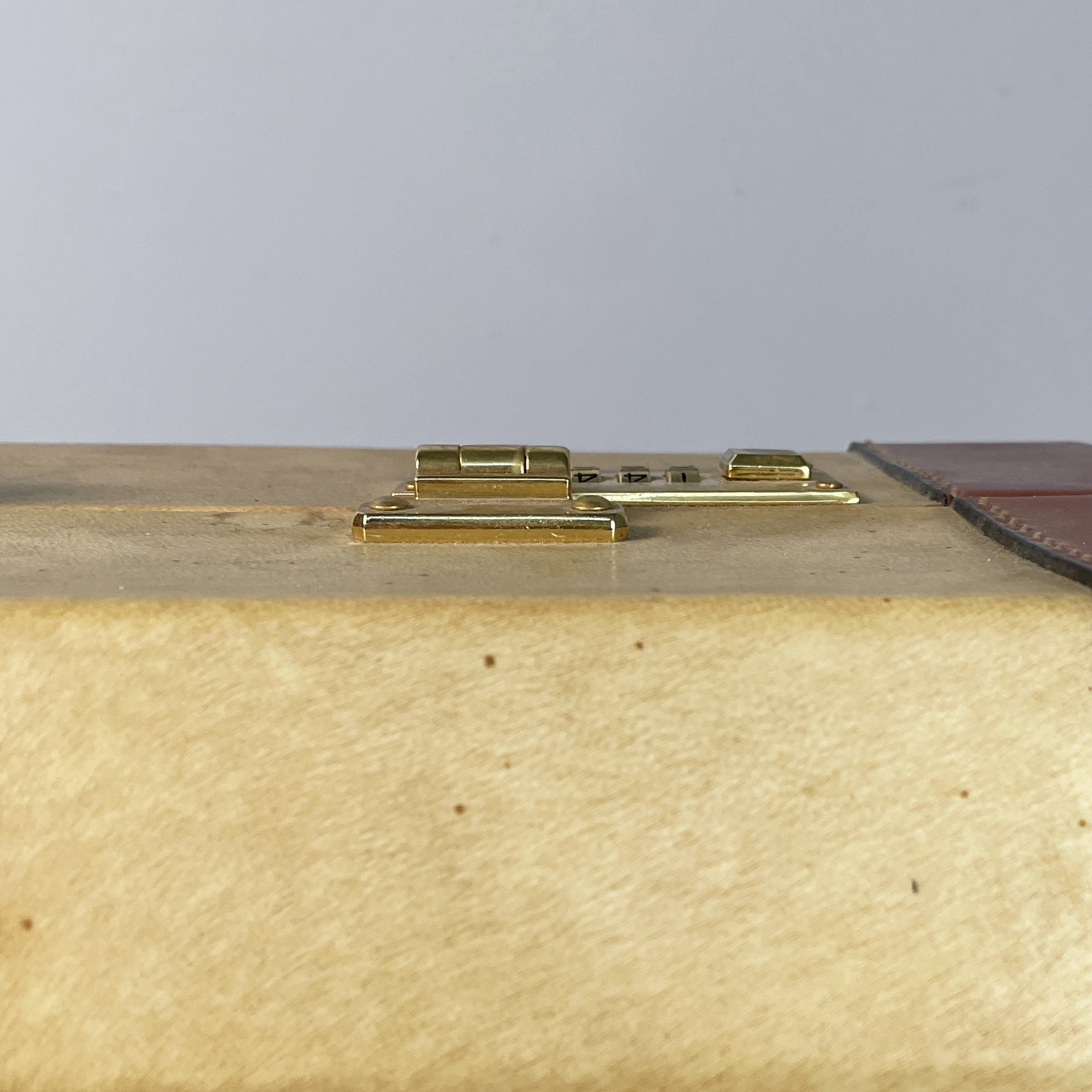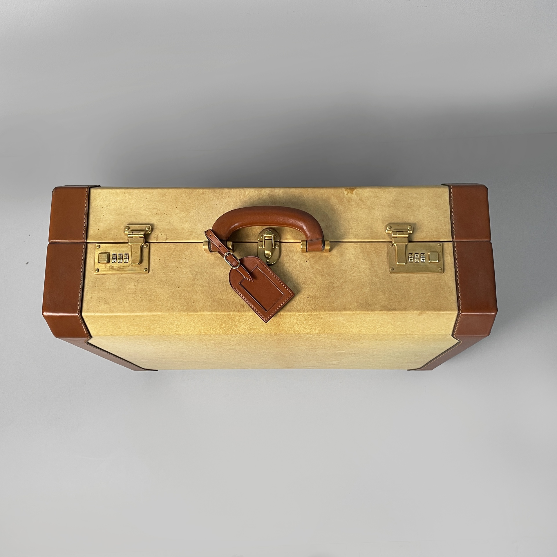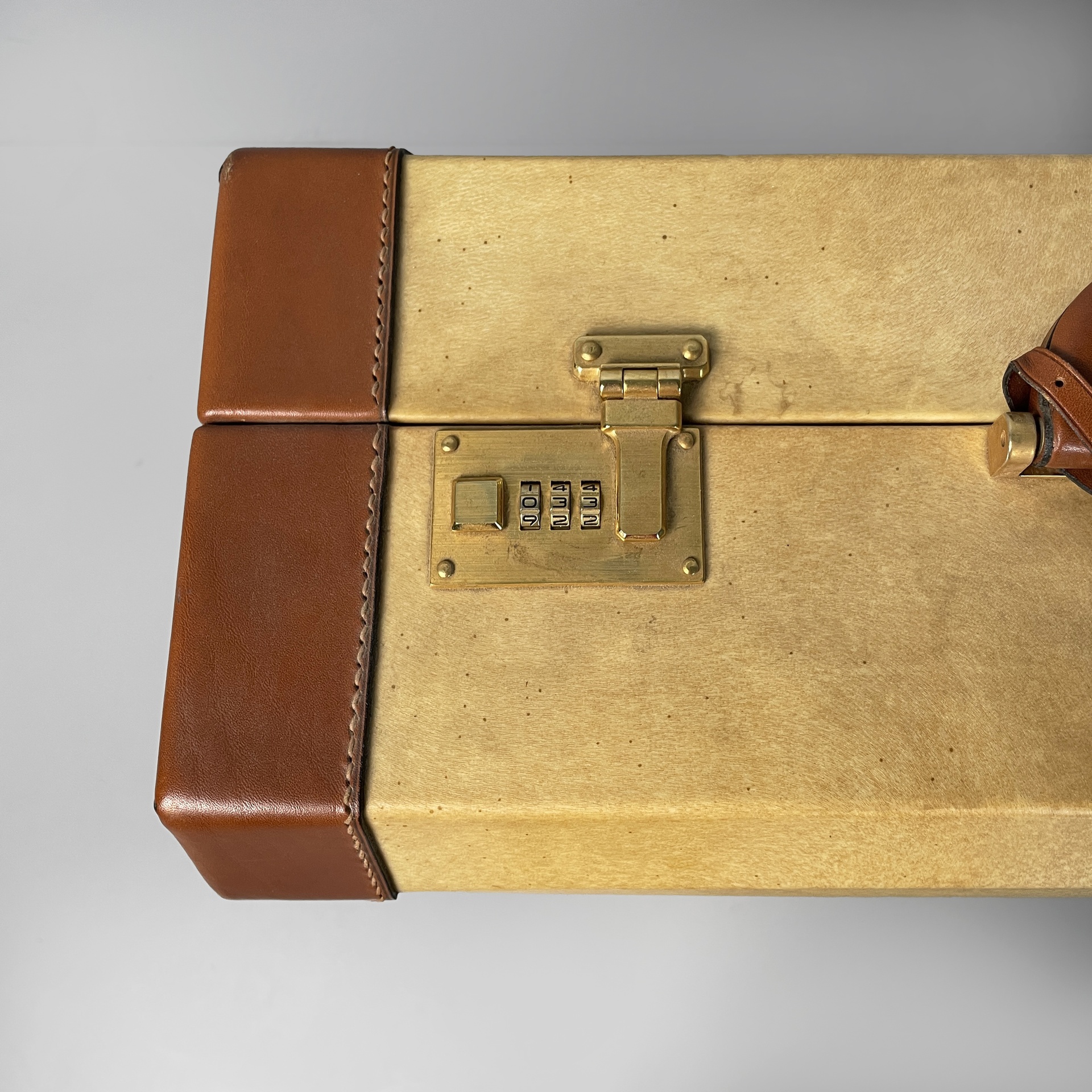 Valigia rettangolare in pelle beige con rifiniture in pelle marrone sui profili e sugli angoli. Maniglia in pelle marrone con porta-tessera in pelle. Chiusura in ottone con combinazione. All’interno sono presenti cinghie in pelle marrone.