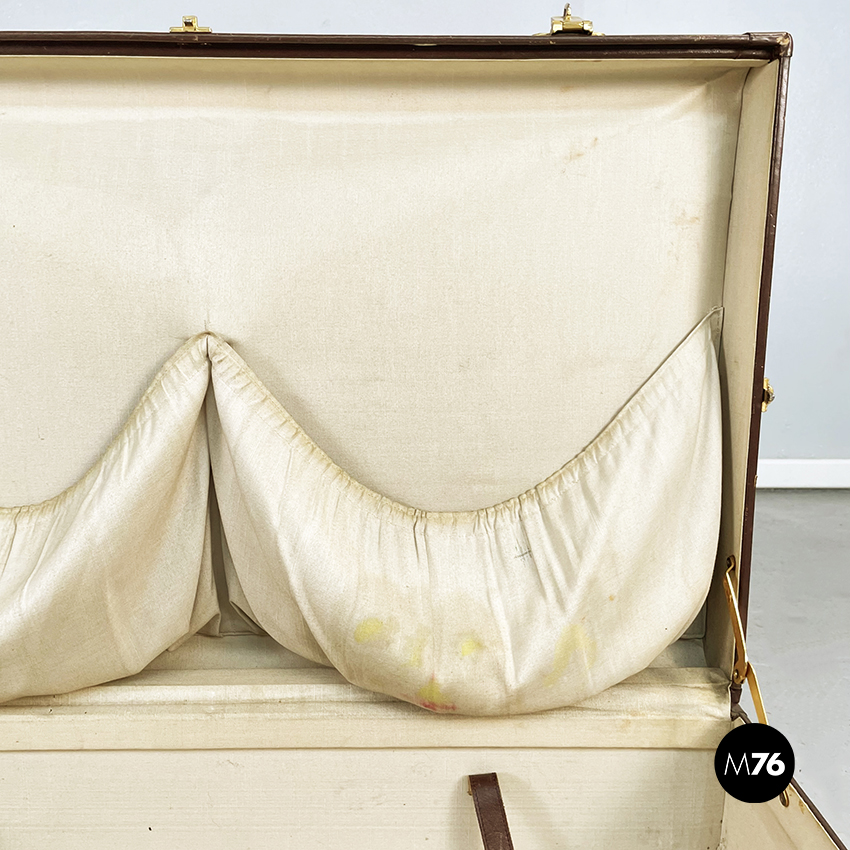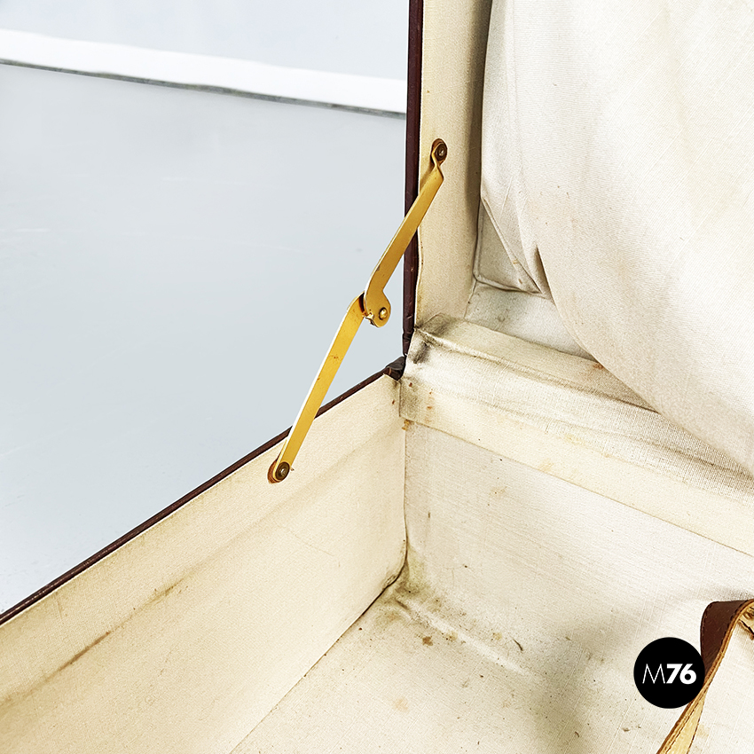 Valigia rettangolare in cuoio marrone . Chiusura in ottone, manico presente. Interni in tessuto beige con due tasche elastiche e delle sottili cinghie in pelle marrone. Utilizzabile come contenitore in casa.