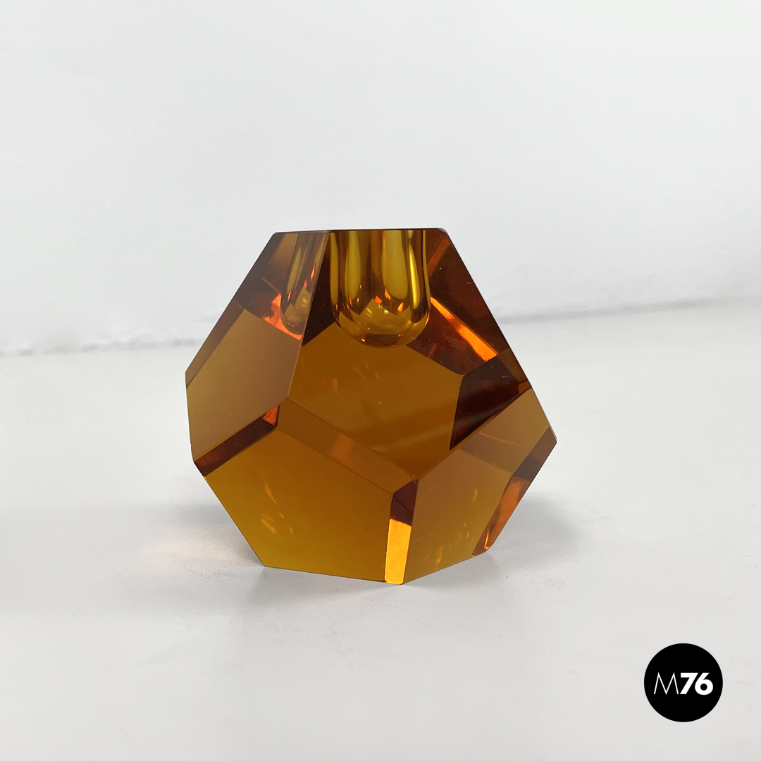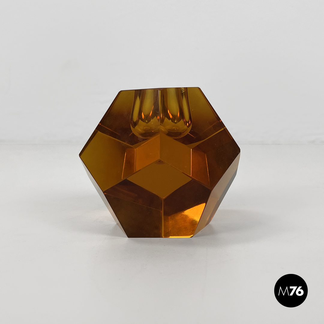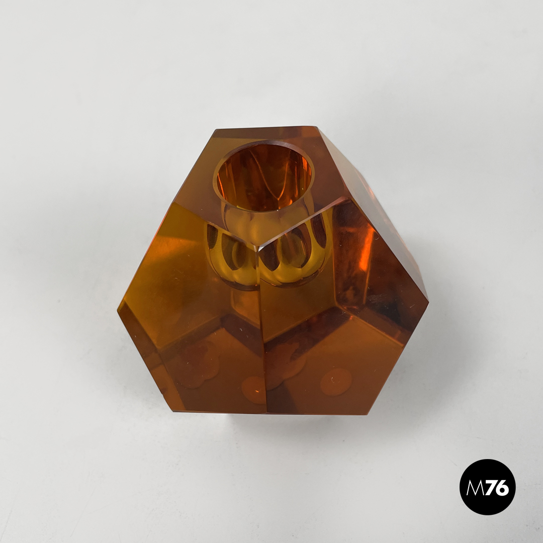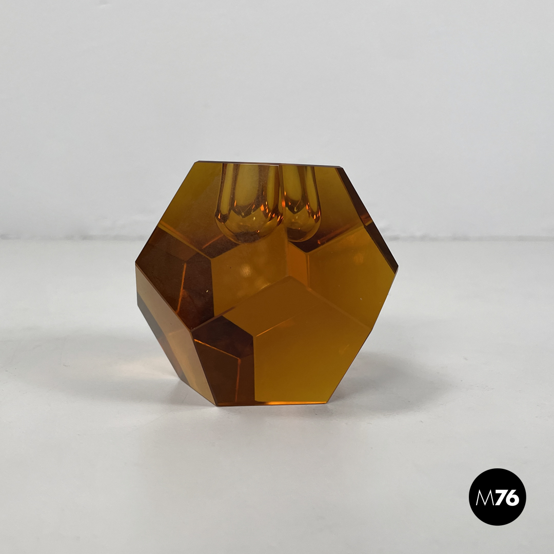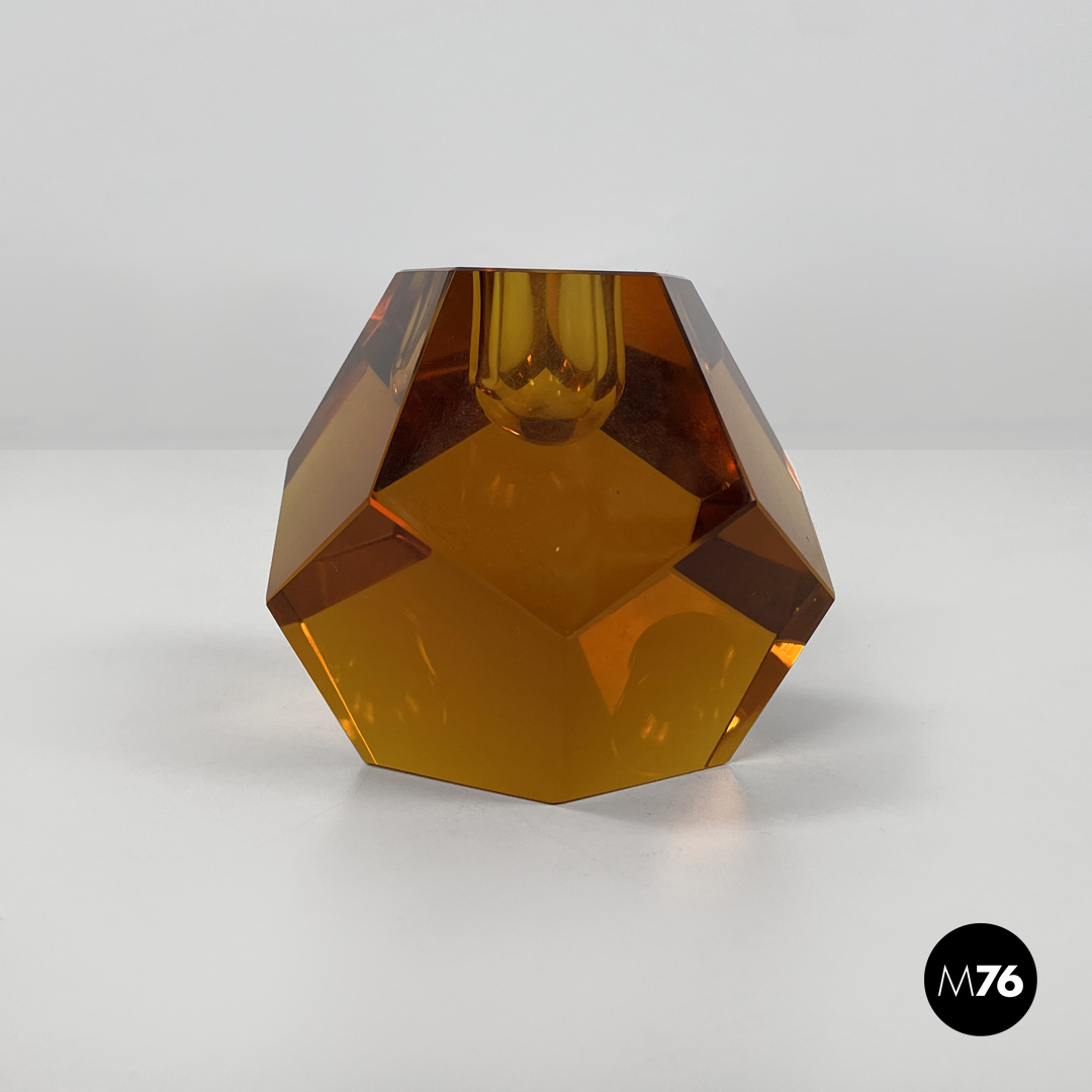 Piccoli vasi in vetro arancione ambrato. La struttura sfaccettata presenta linee geometriche. Sulla parte alta è presente un foro con fondo stondato. Utilizzabili anche come portacandele.
