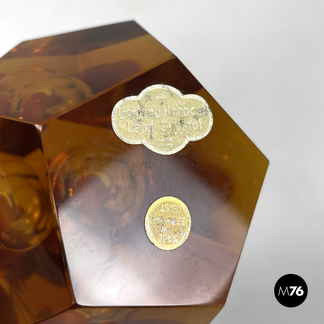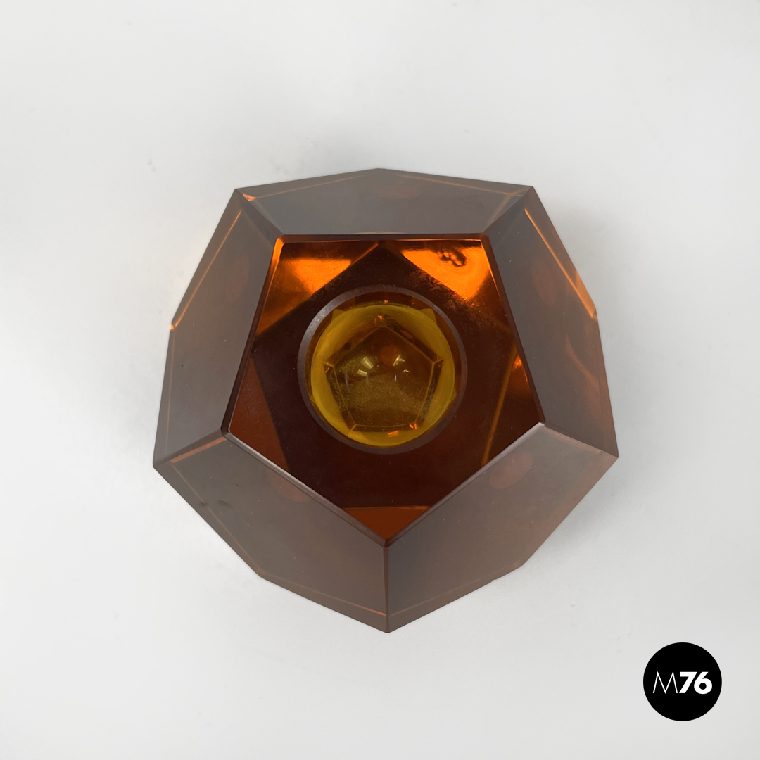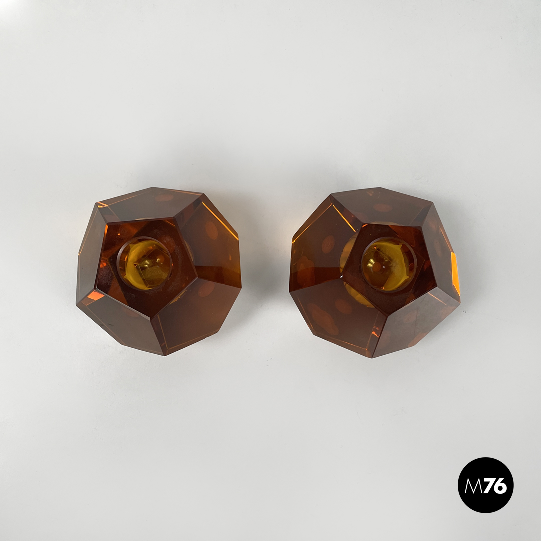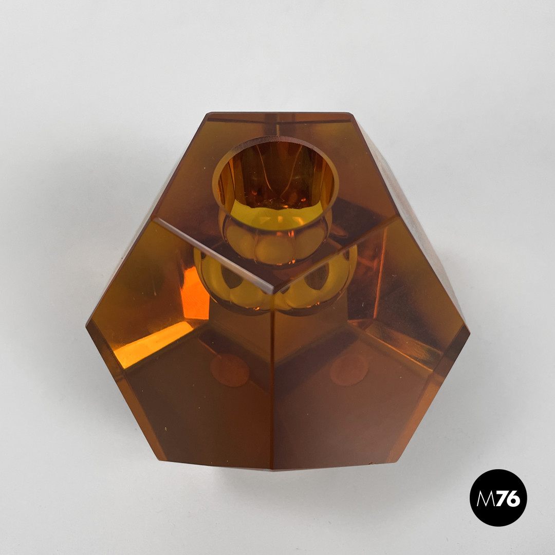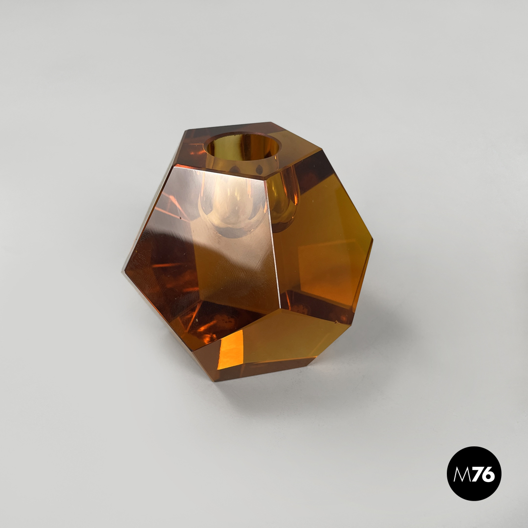 Piccoli vasi in vetro arancione ambrato. La struttura sfaccettata presenta linee geometriche. Sulla parte alta è presente un foro con fondo stondato. Utilizzabili anche come portacandele.