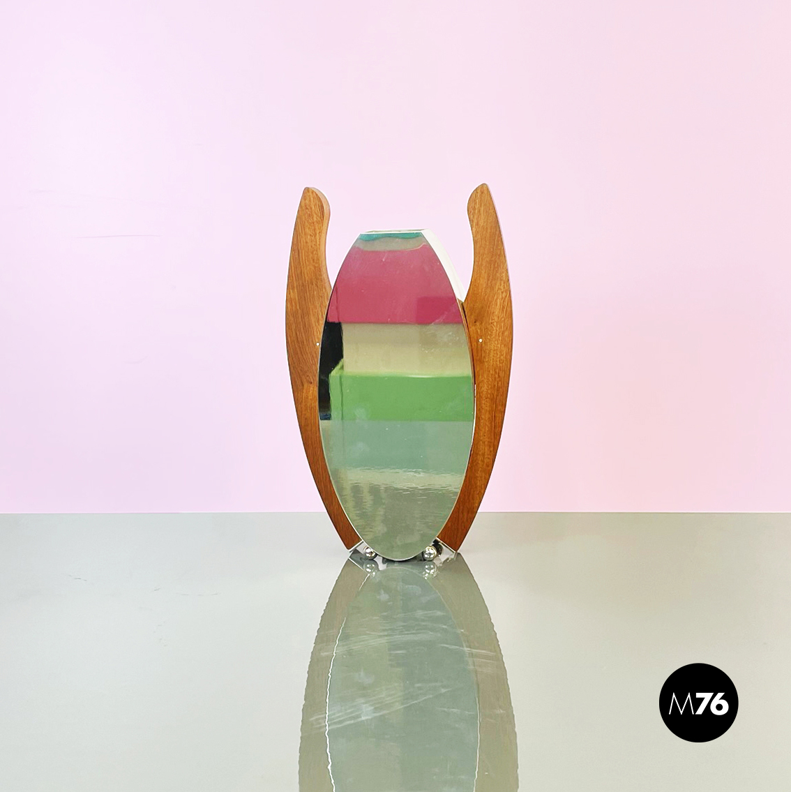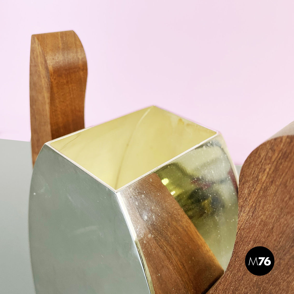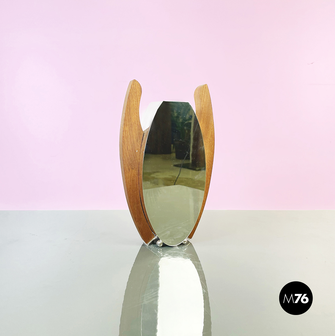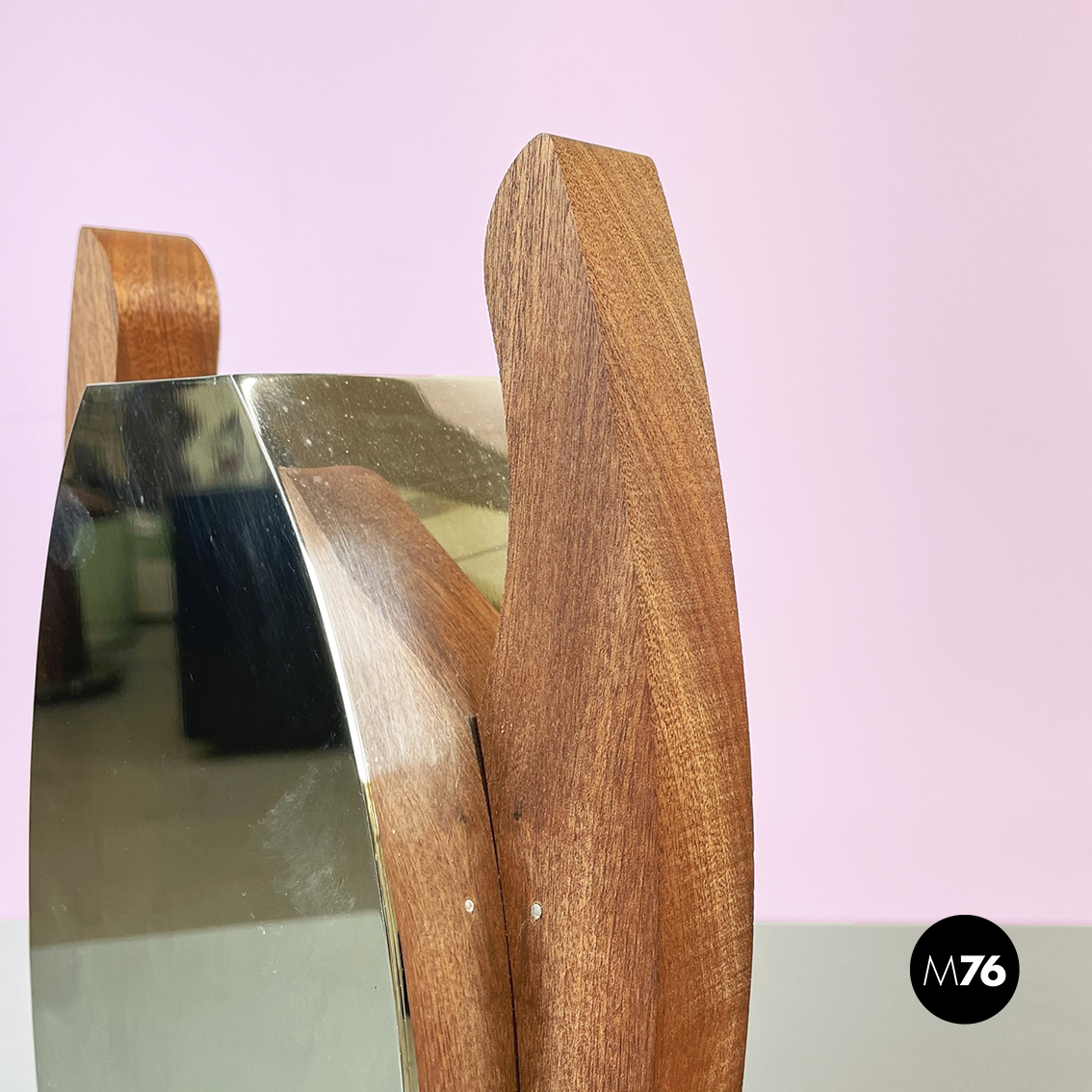 Vaso con struttura centrale ovale in specchio. Nella parte alta presenta l’apertura. Ai lati presenta due manici dalla forma tondeggiante in legno. Alla base ha dei piedini sferici.