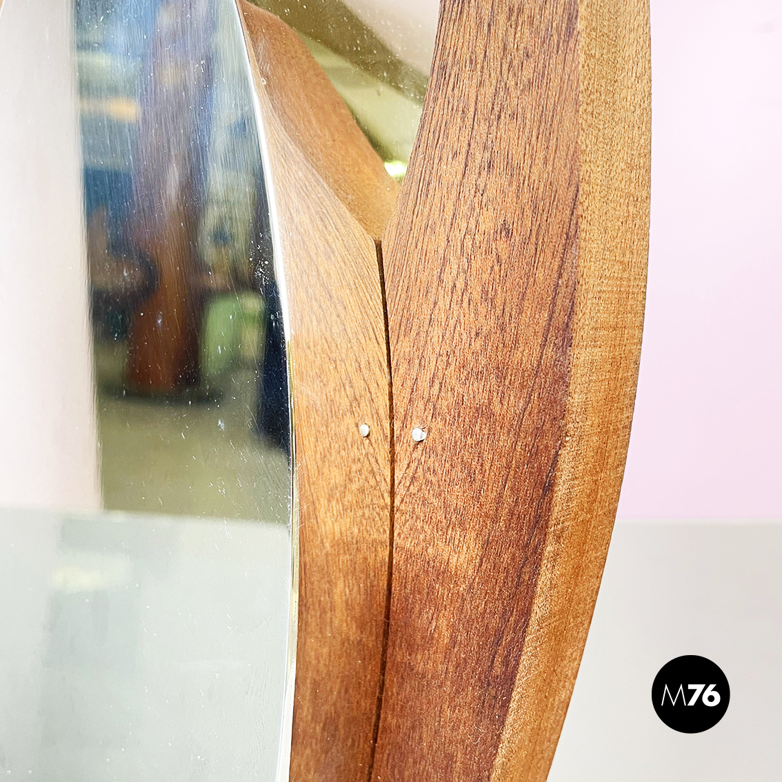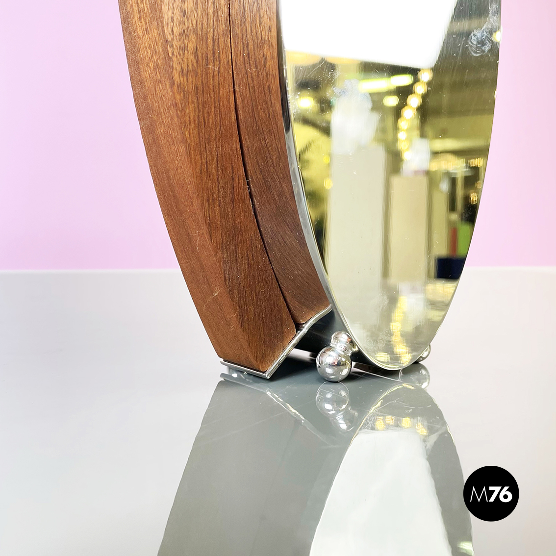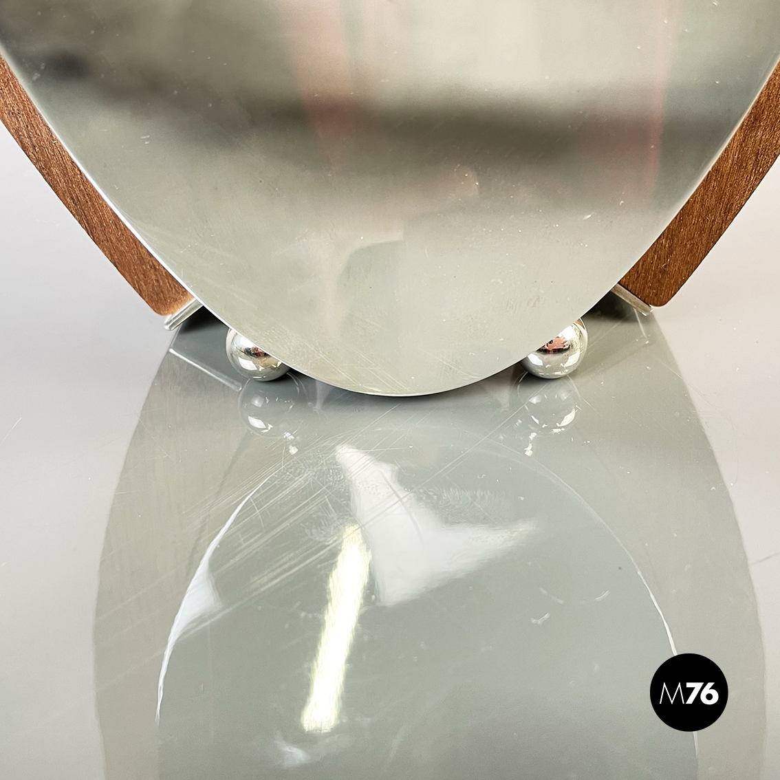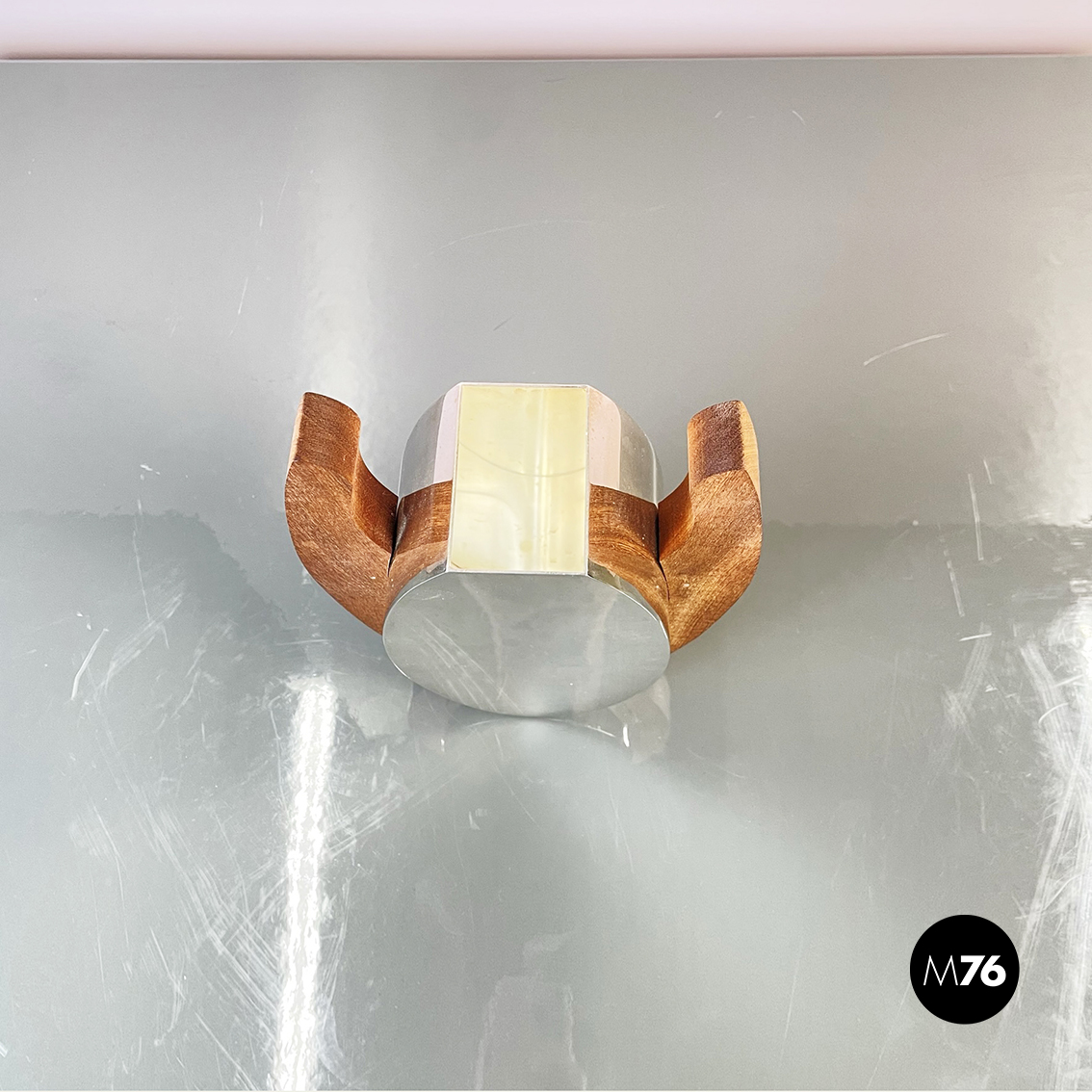 Vaso con struttura centrale ovale in specchio. Nella parte alta presenta l’apertura. Ai lati presenta due manici dalla forma tondeggiante in legno. Alla base ha dei piedini sferici.