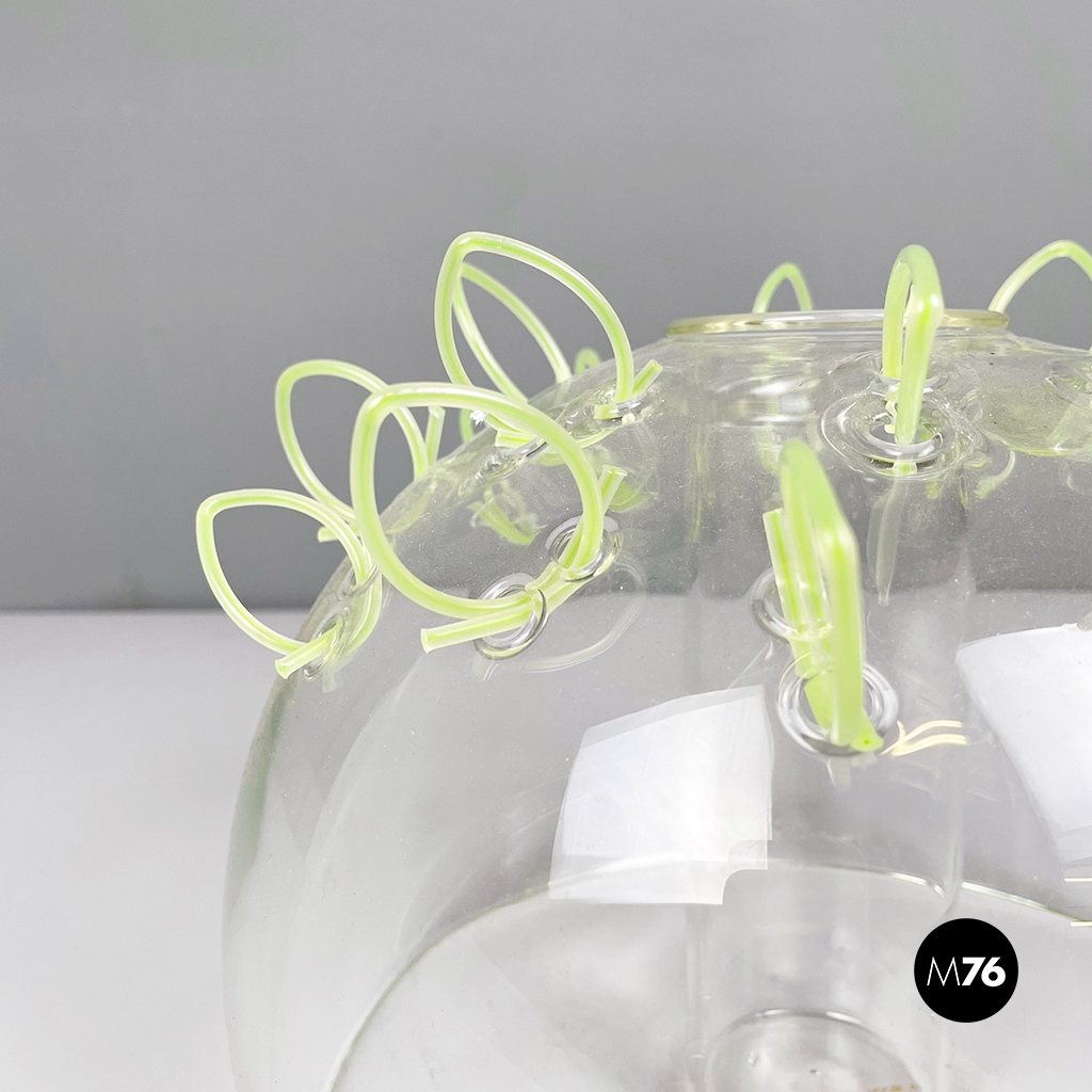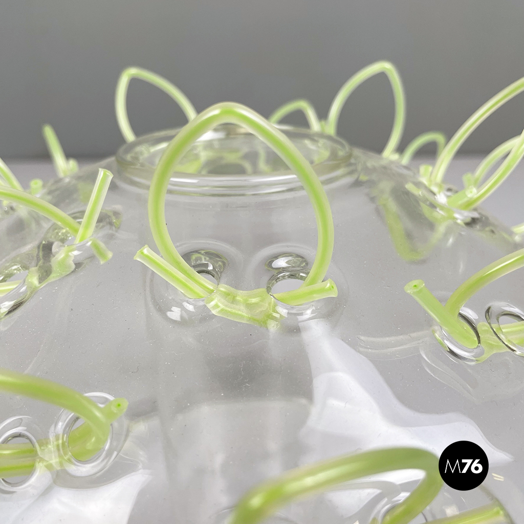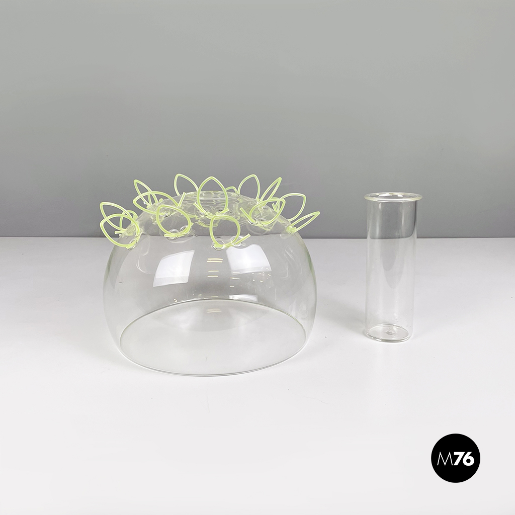 Vaso a forma semisferica in vetro forato. Nei fori sono presenti piccoli fili di plastica verde chiaro. Presenta una struttura interna cilindrica dove posizionare i fiori.