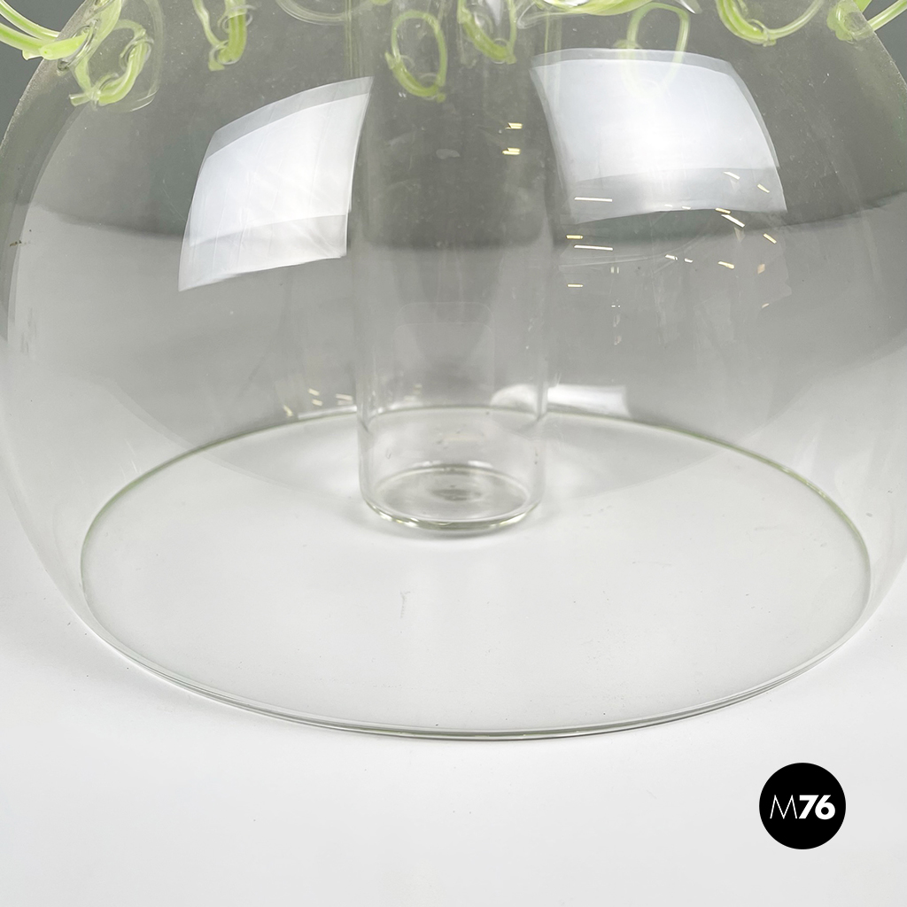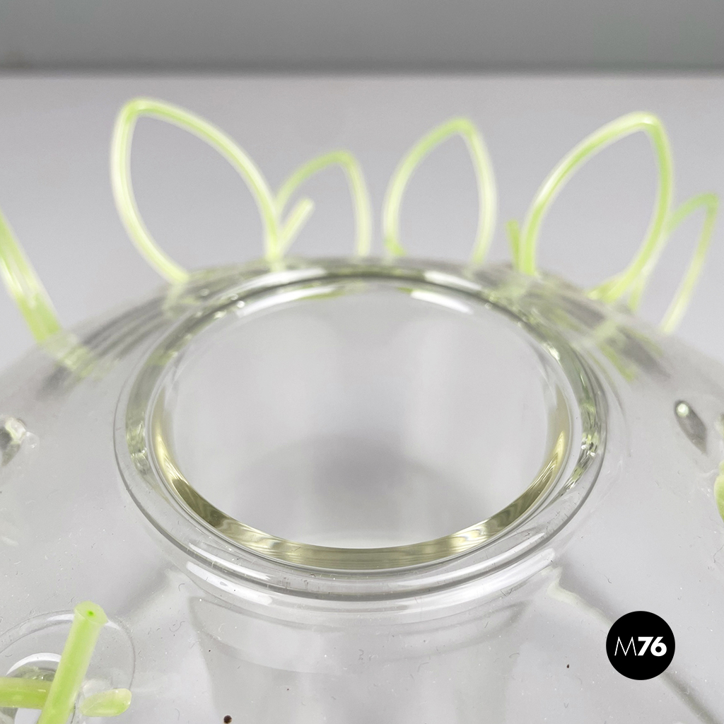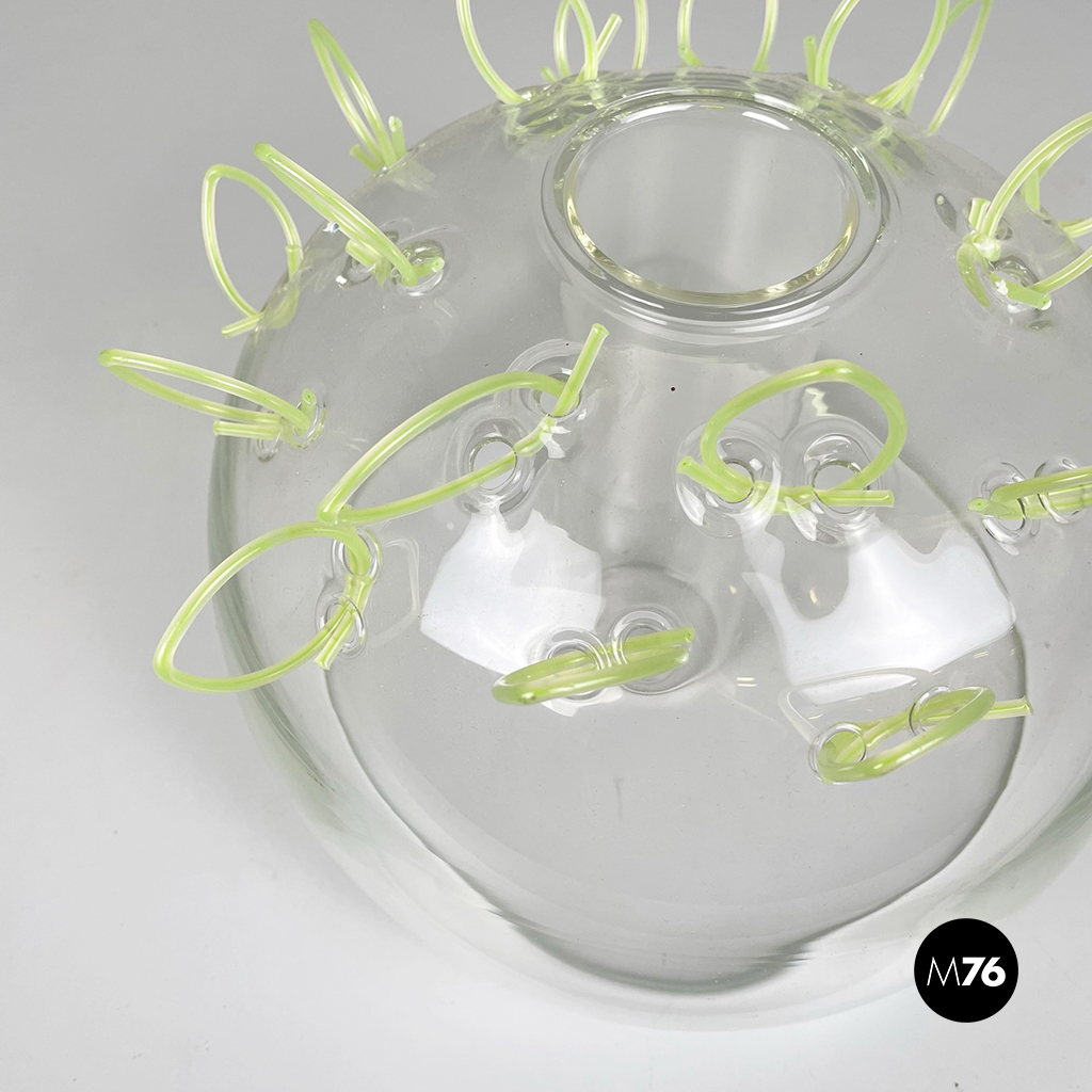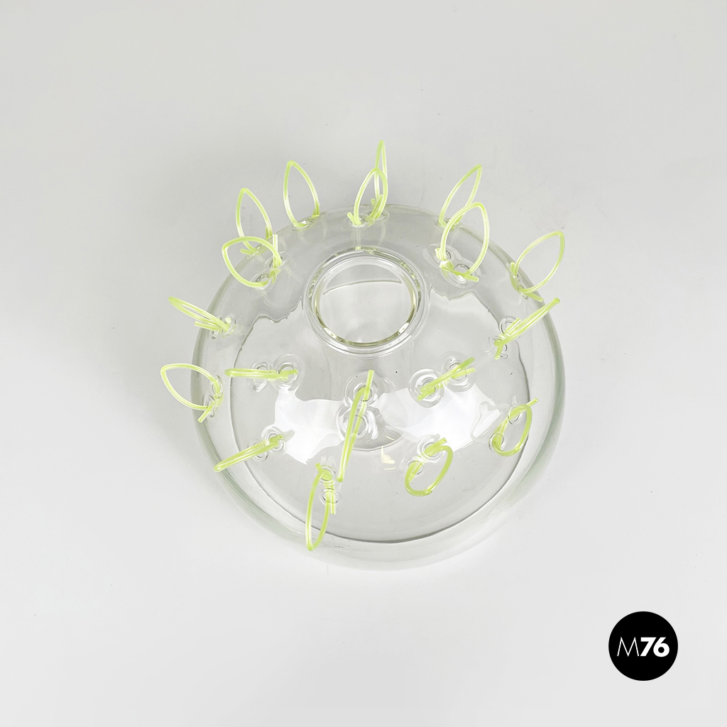 Vaso a forma semisferica in vetro forato. Nei fori sono presenti piccoli fili di plastica verde chiaro. Presenta una struttura interna cilindrica dove posizionare i fiori.