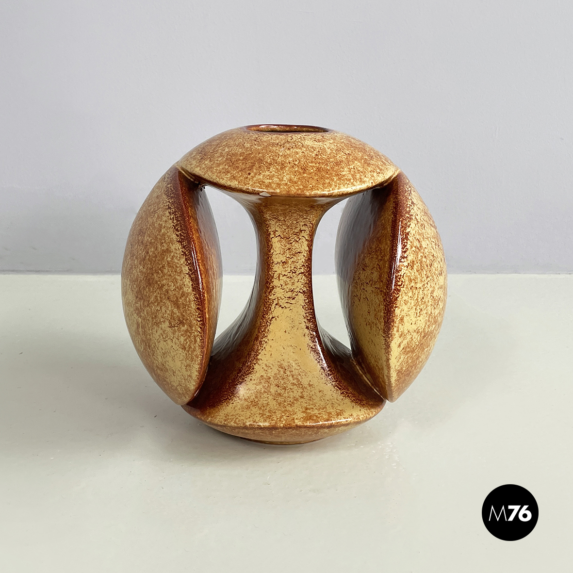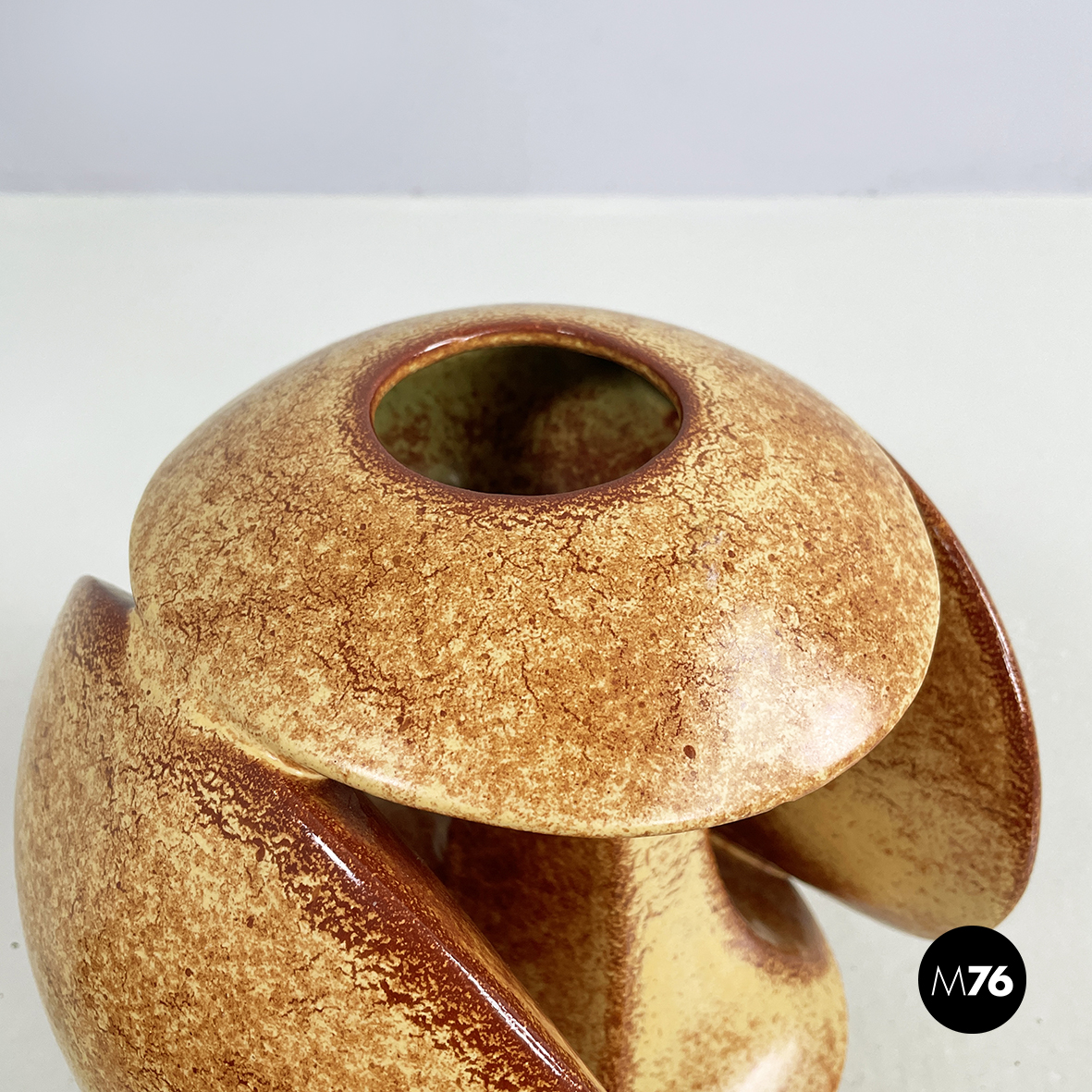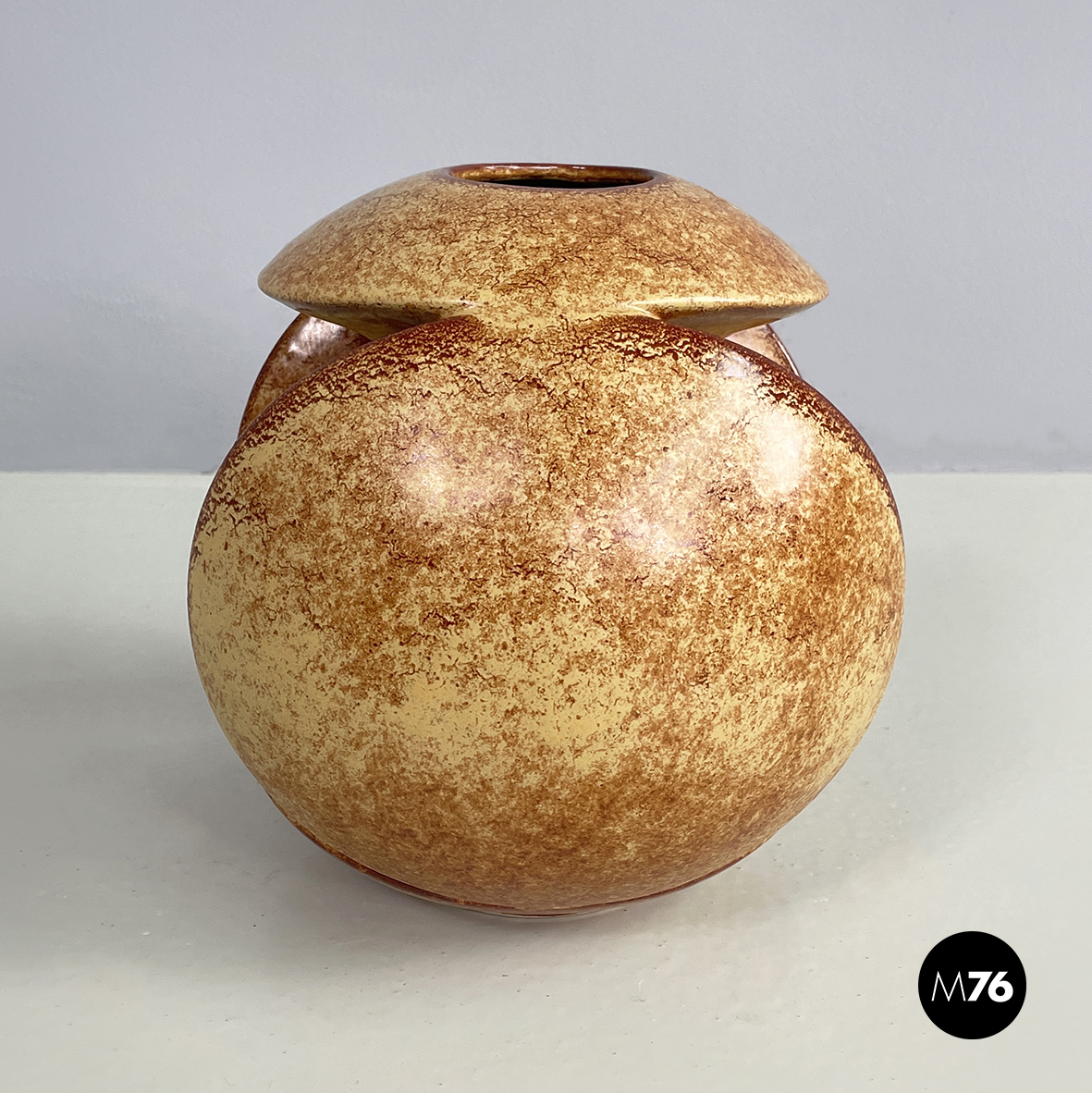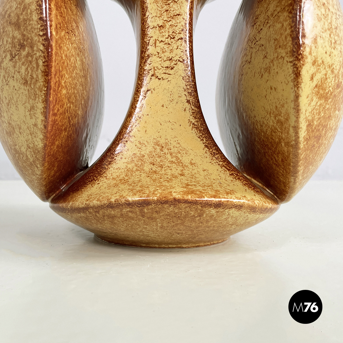 Vaso scultoreo in ceramica dipinta tra i toni del marrone e del beige. Il vaso è composto da 4 forme tonde, le quali creano spazi tra le forme organiche. Nella parte superiore presenta il foro tondo.