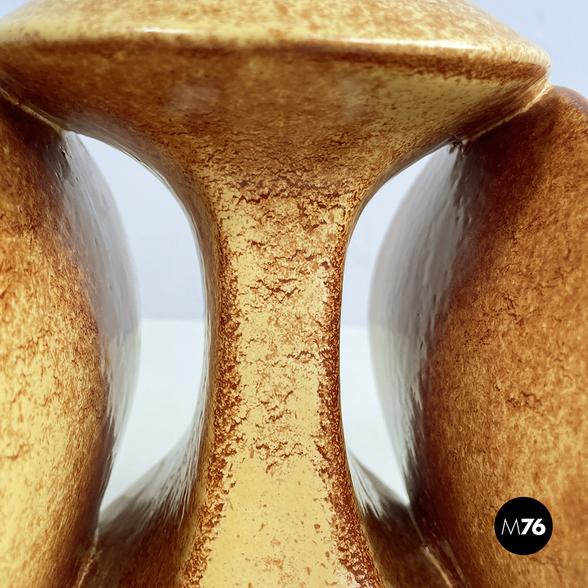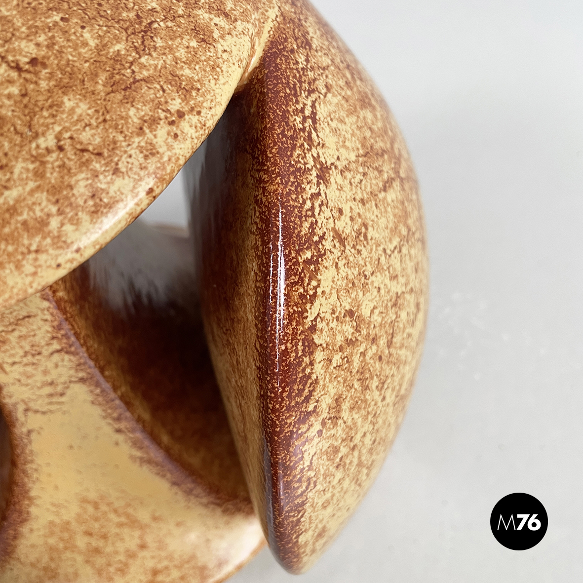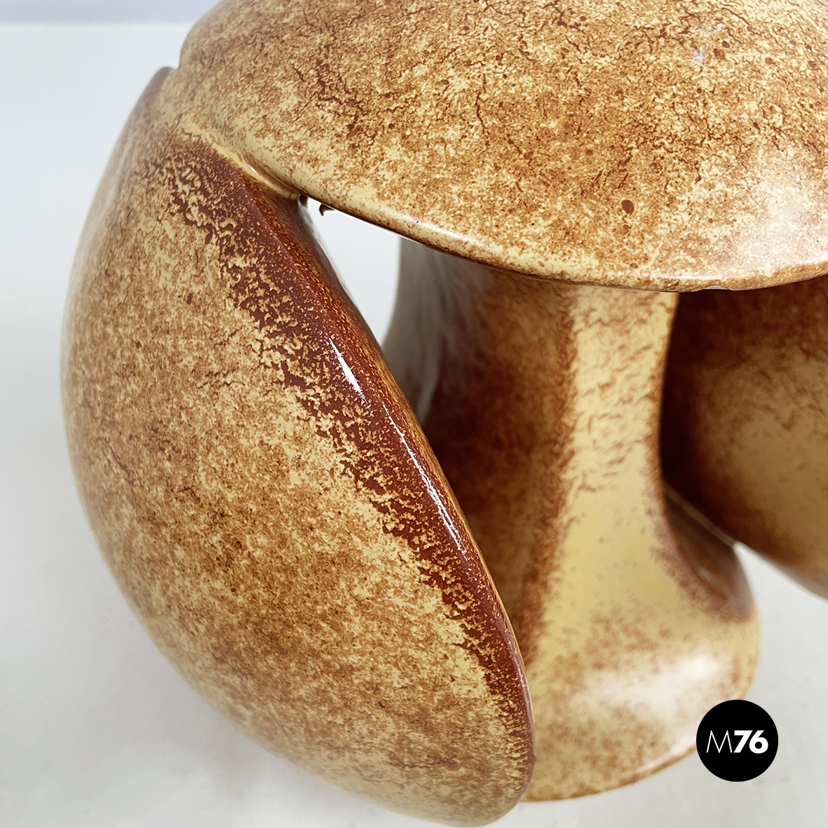 Vaso scultoreo in ceramica dipinta tra i toni del marrone e del beige. Il vaso è composto da 4 forme tonde, le quali creano spazi tra le forme organiche. Nella parte superiore presenta il foro tondo.