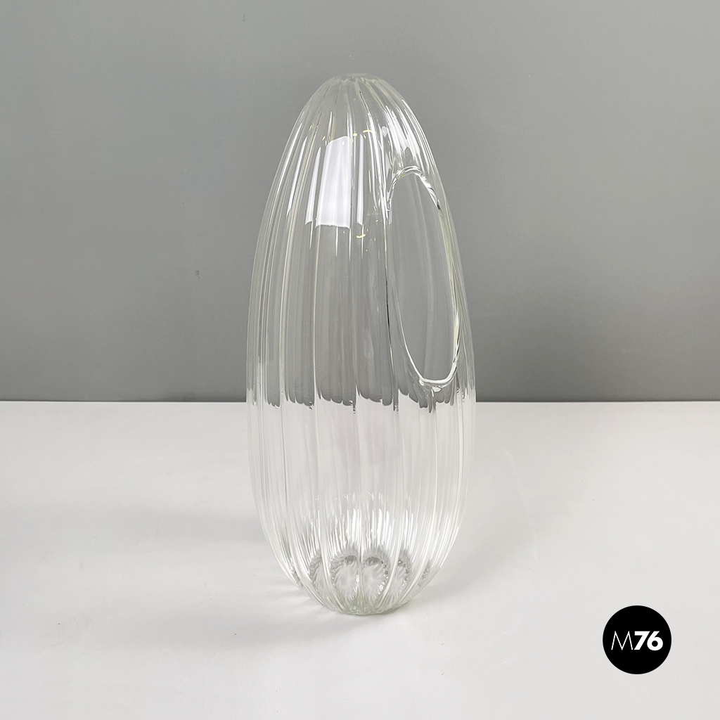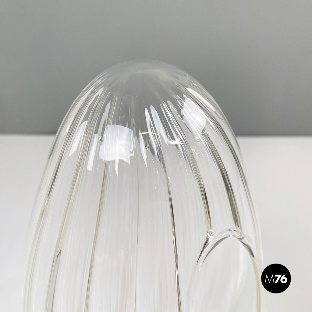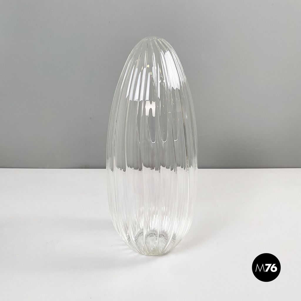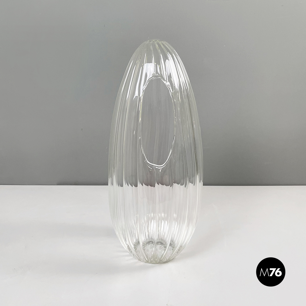 Vaso a base tonda in vetro finemente lavorato a mano. La struttura ovale ricorda la forma di un seme. Il vaso presenta il foro sul lato.