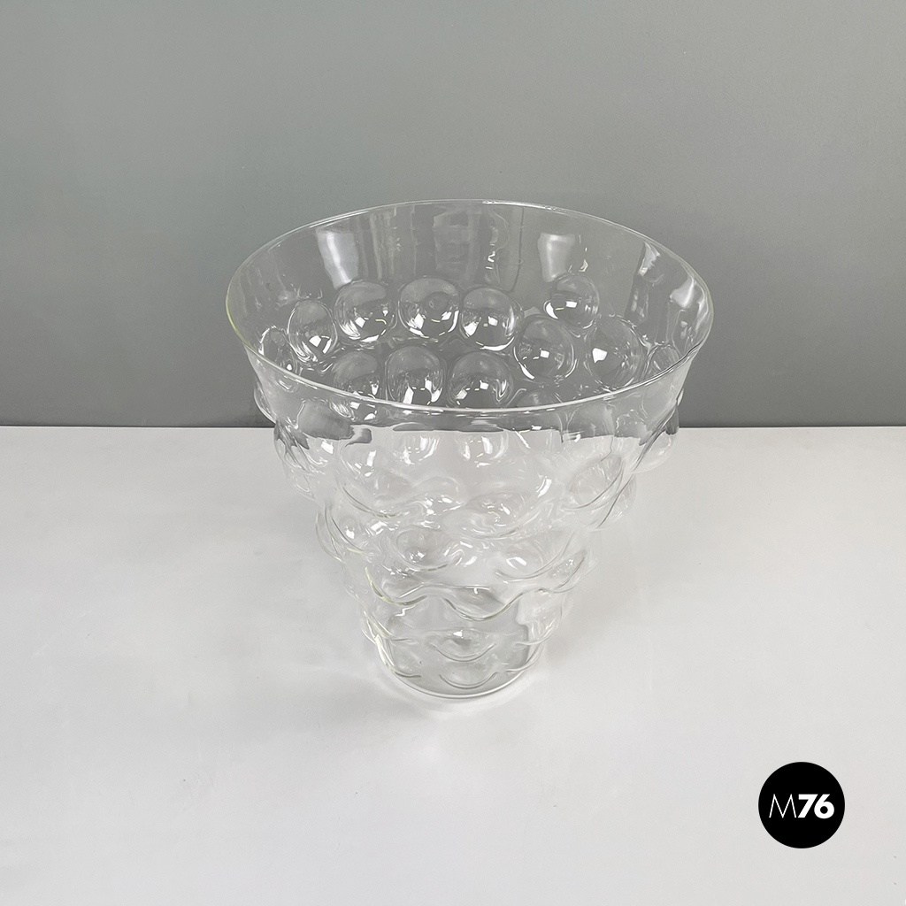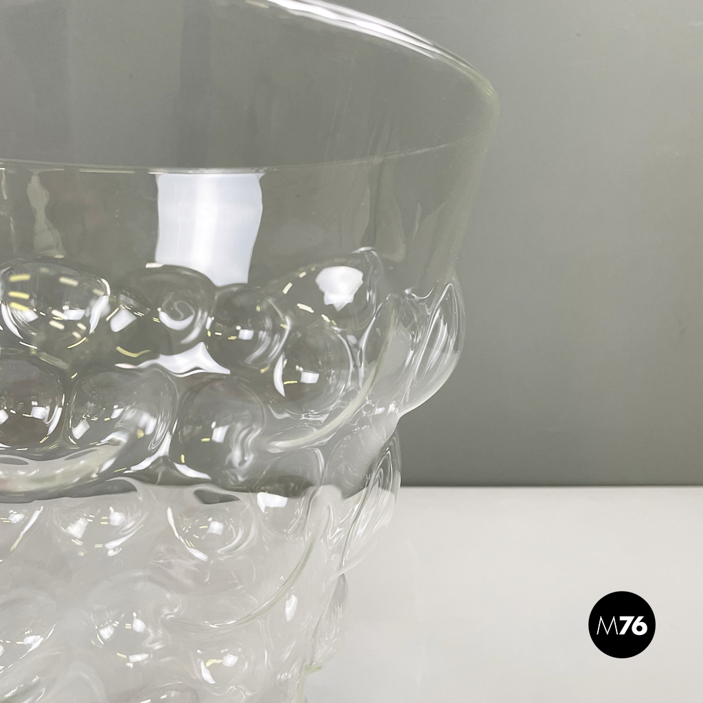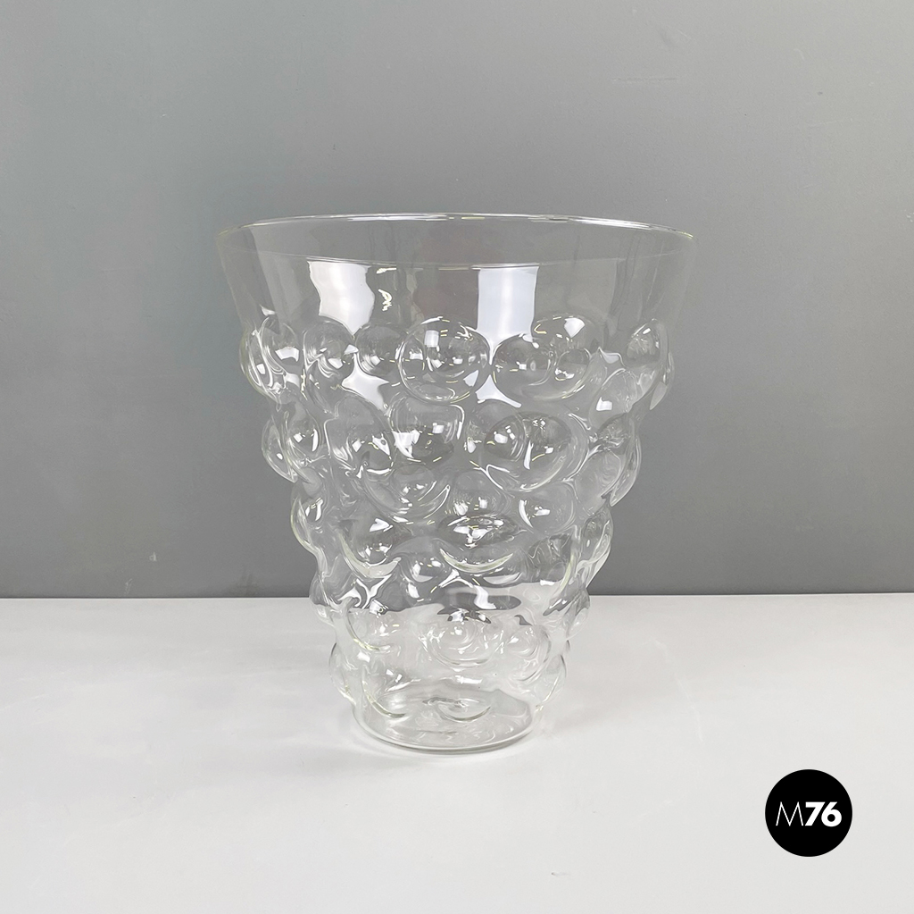 Vaso a base tonda in vetro finemente lavorato a mano. La struttura tende a stringersi verso la base e su tutta la superficie presenta una serie di semisfere sporgenti.