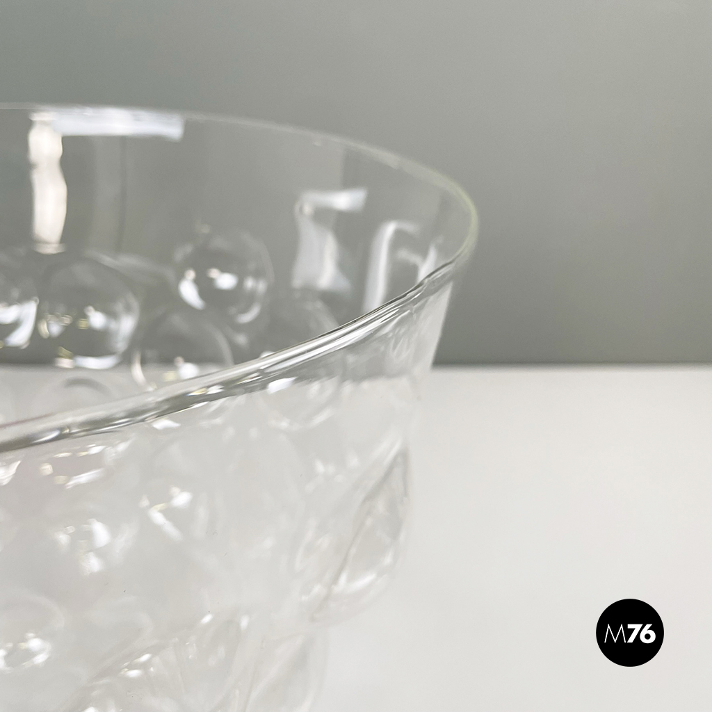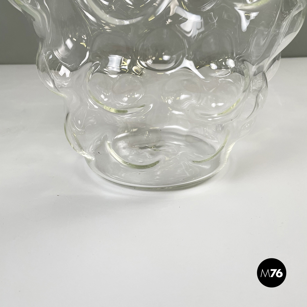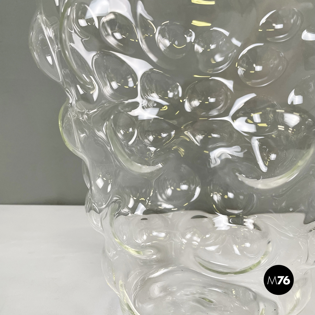 Vaso a base tonda in vetro finemente lavorato a mano. La struttura tende a stringersi verso la base e su tutta la superficie presenta una serie di semisfere sporgenti.