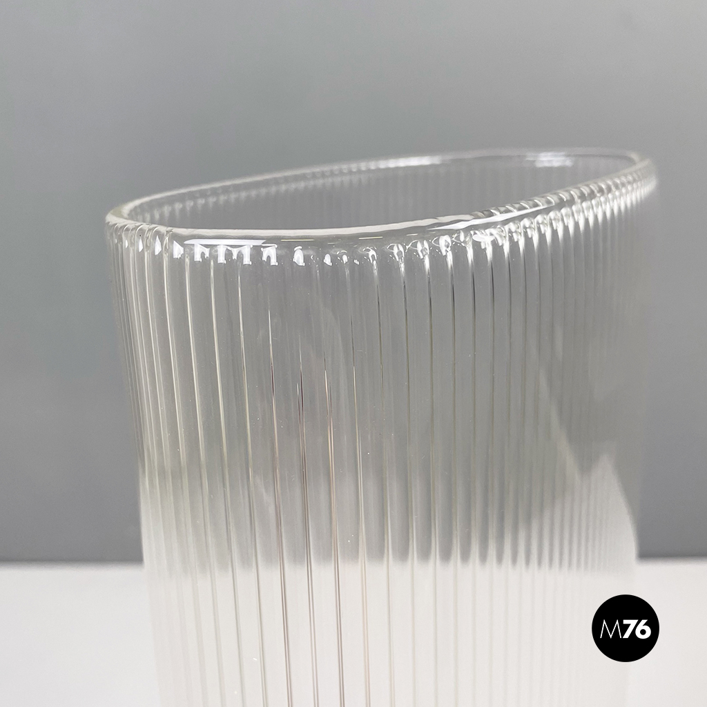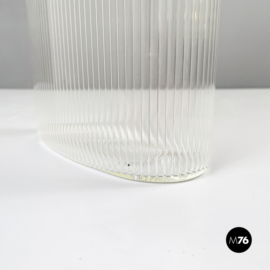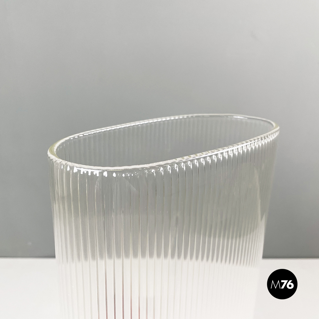 Vaso a base ovale in vetro finemente lavorato a mano. La struttura presenta delle sottili righe verticale decorative.