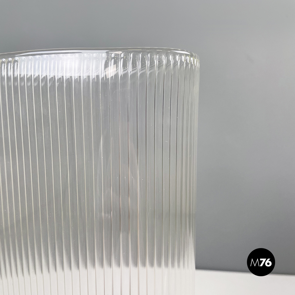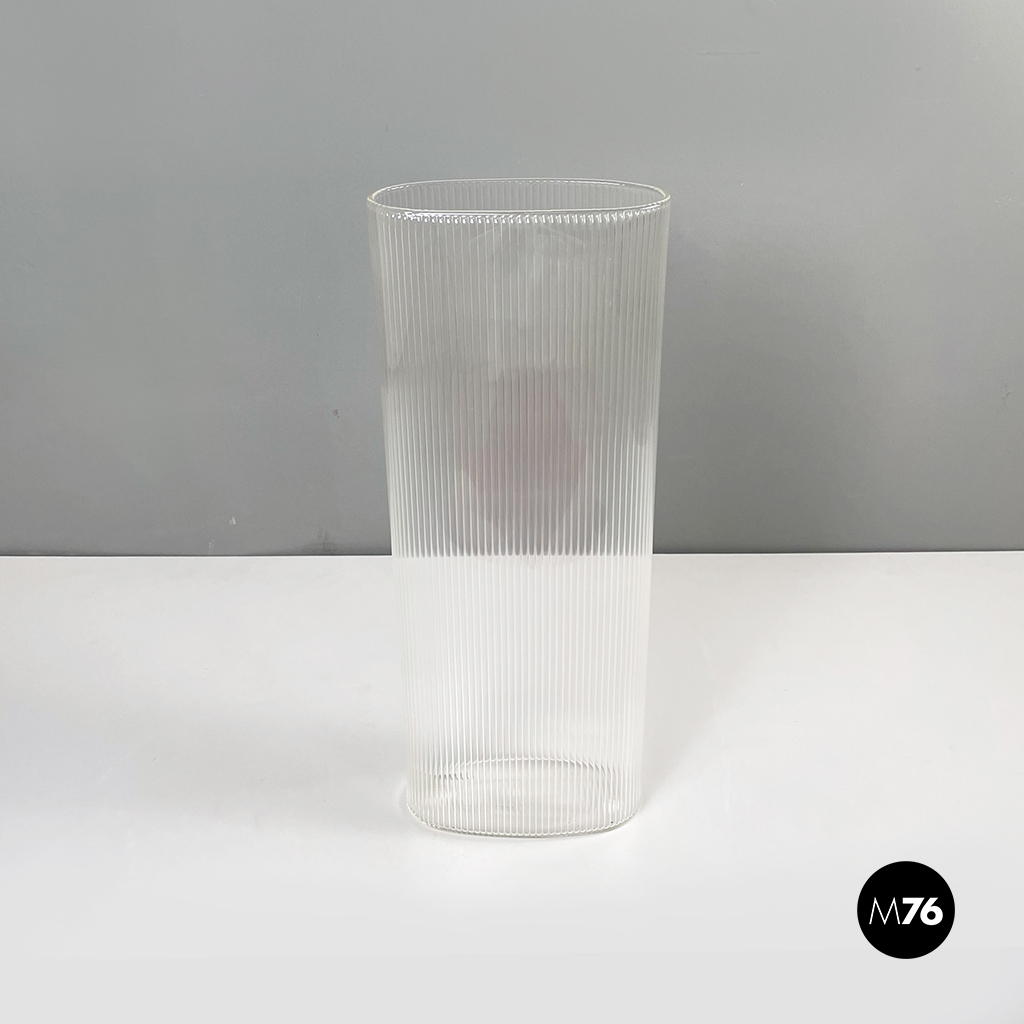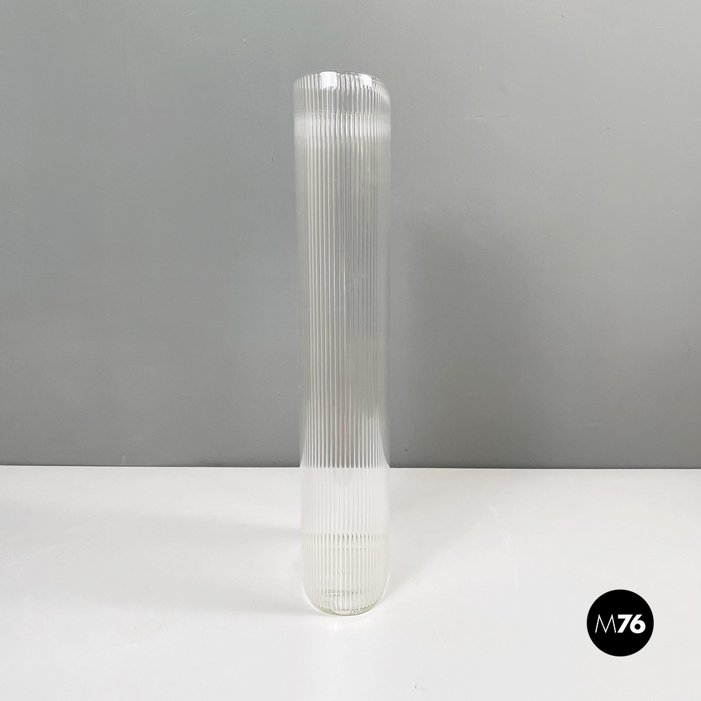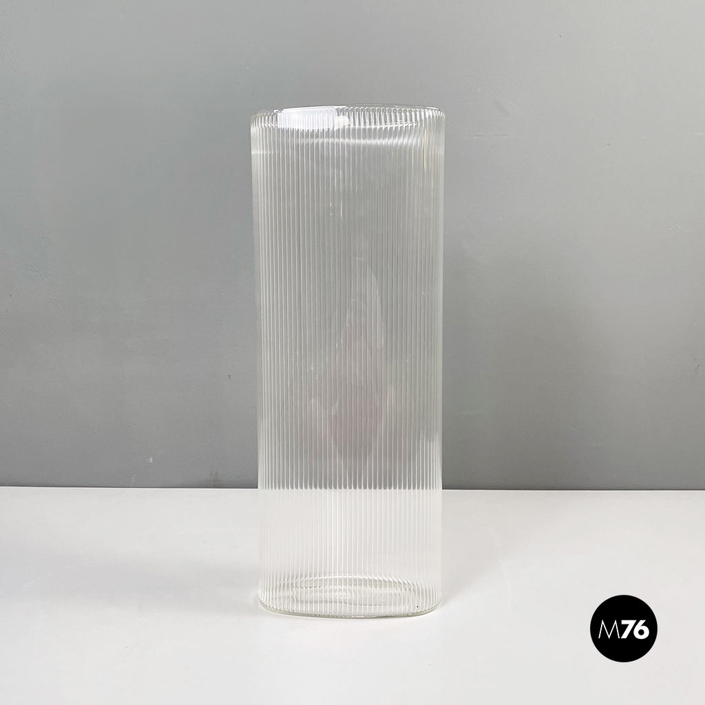 Vaso a base ovale in vetro finemente lavorato a mano. La struttura presenta delle sottili righe verticale decorative.