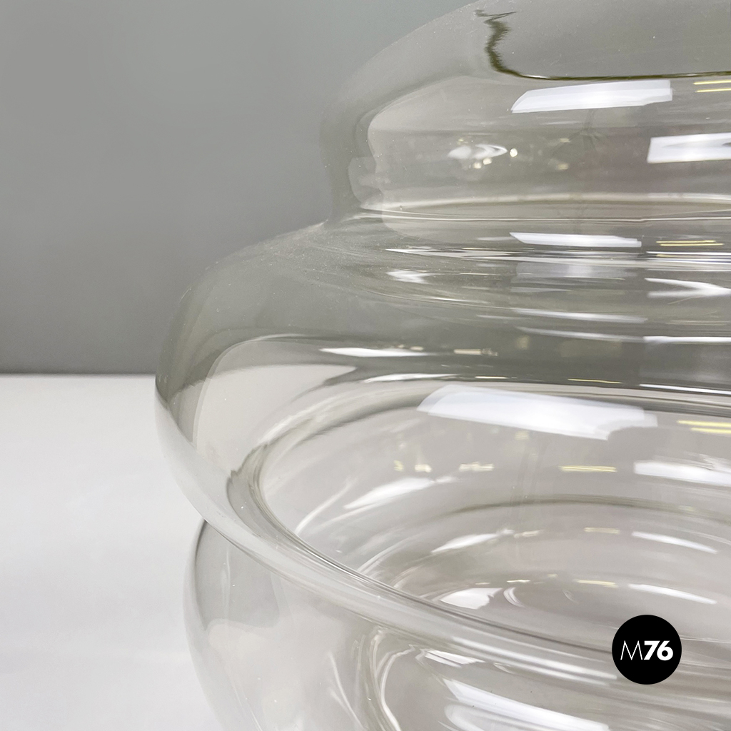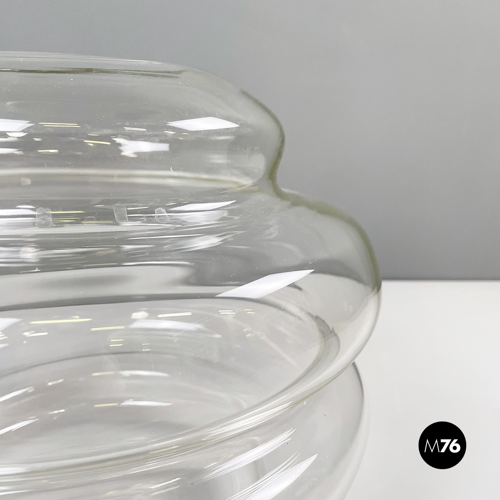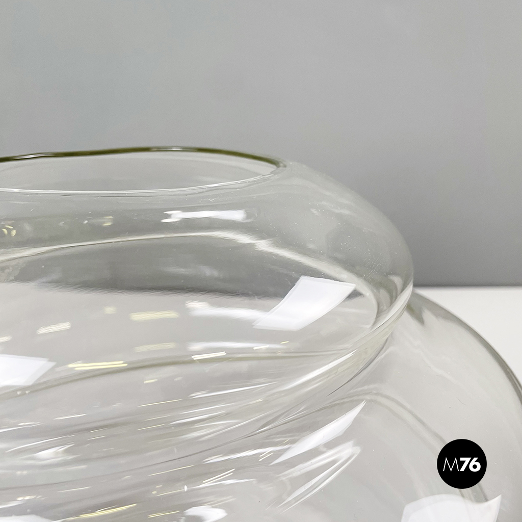 Vaso a base tonda in vetro finemente lavorato a mano. La struttura tende a stringersi verso gli estremi e allargarsi al centro.