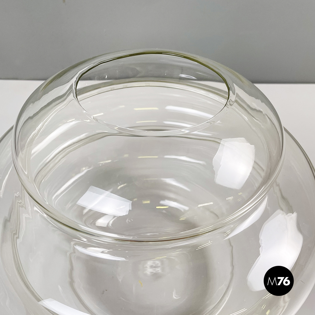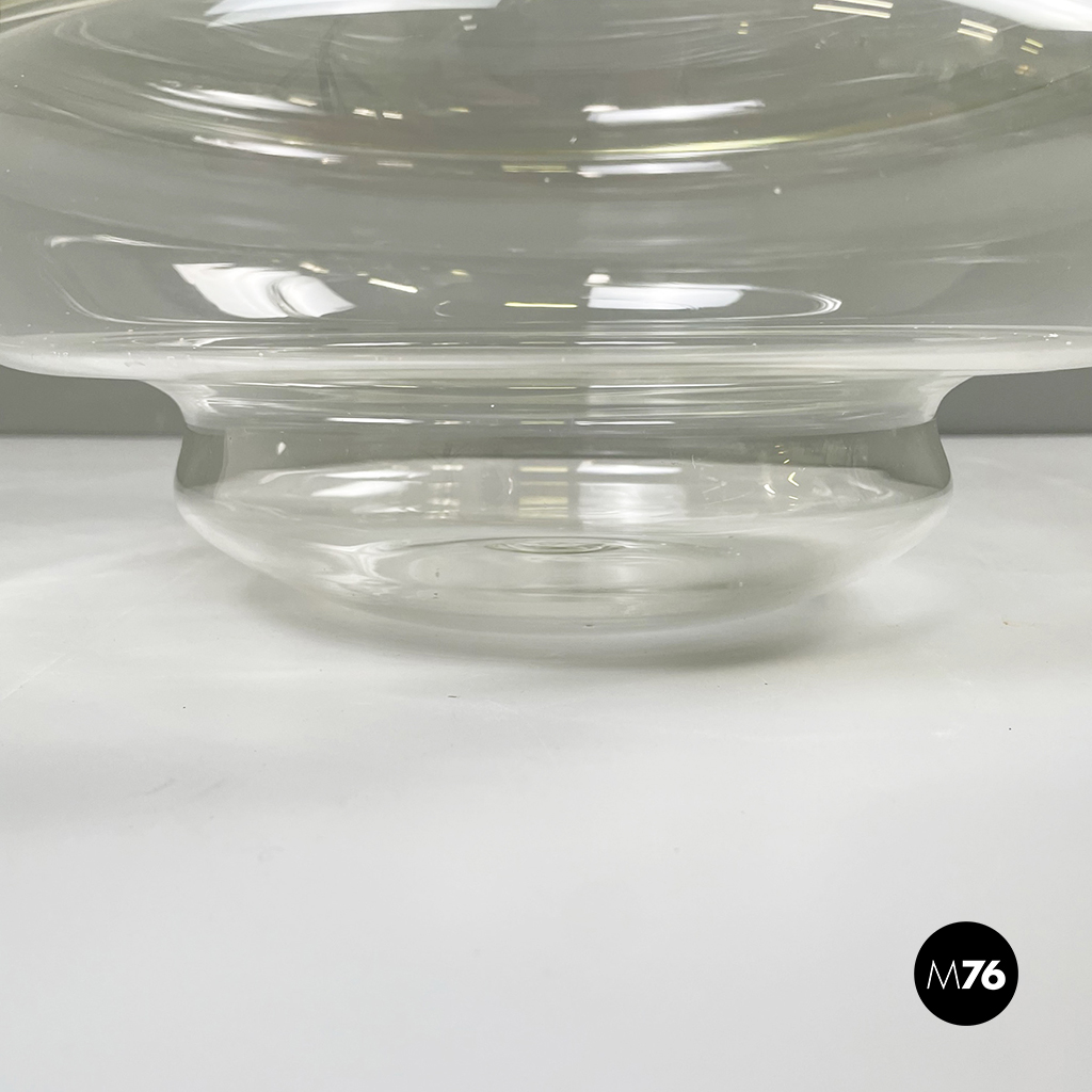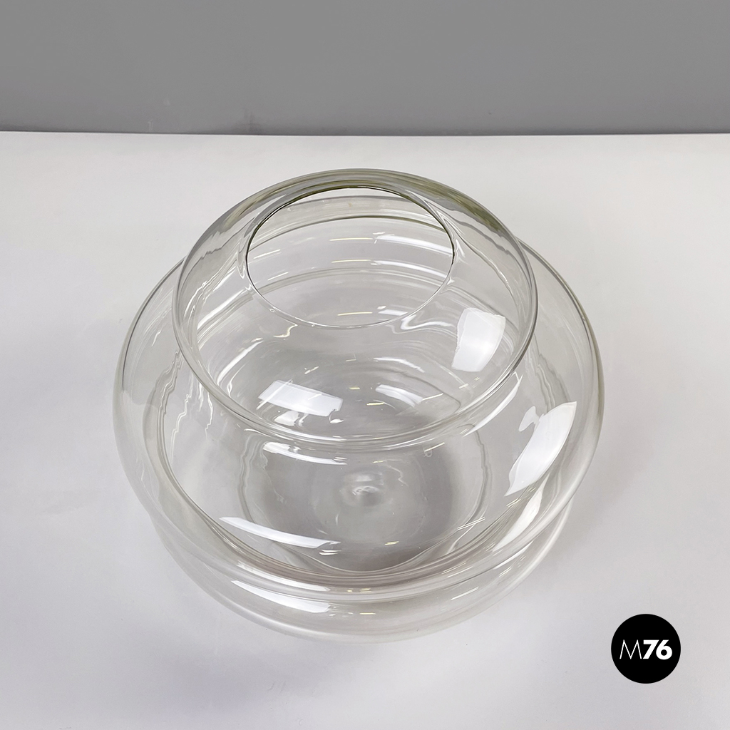Vaso a base tonda in vetro finemente lavorato a mano. La struttura tende a stringersi verso gli estremi e allargarsi al centro.