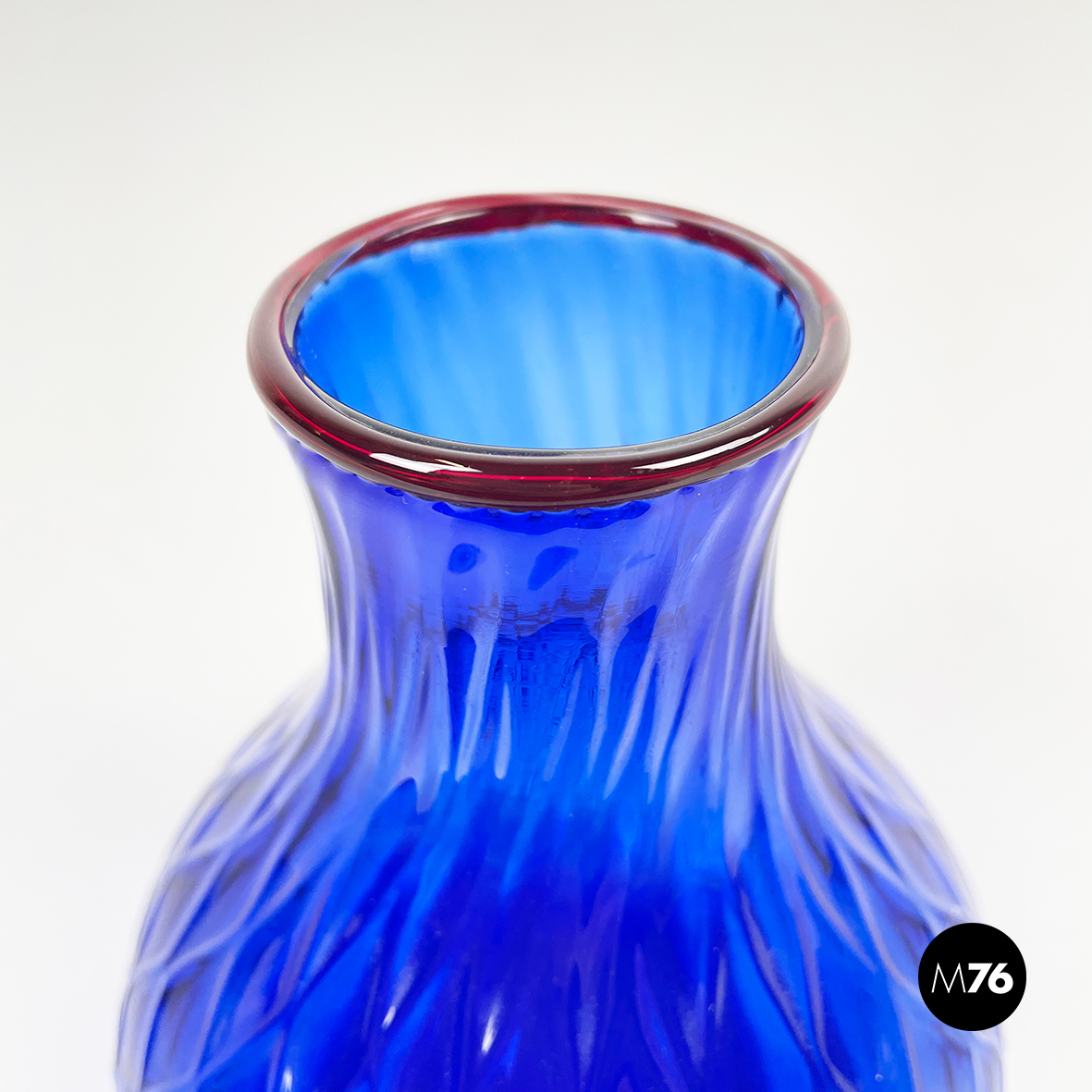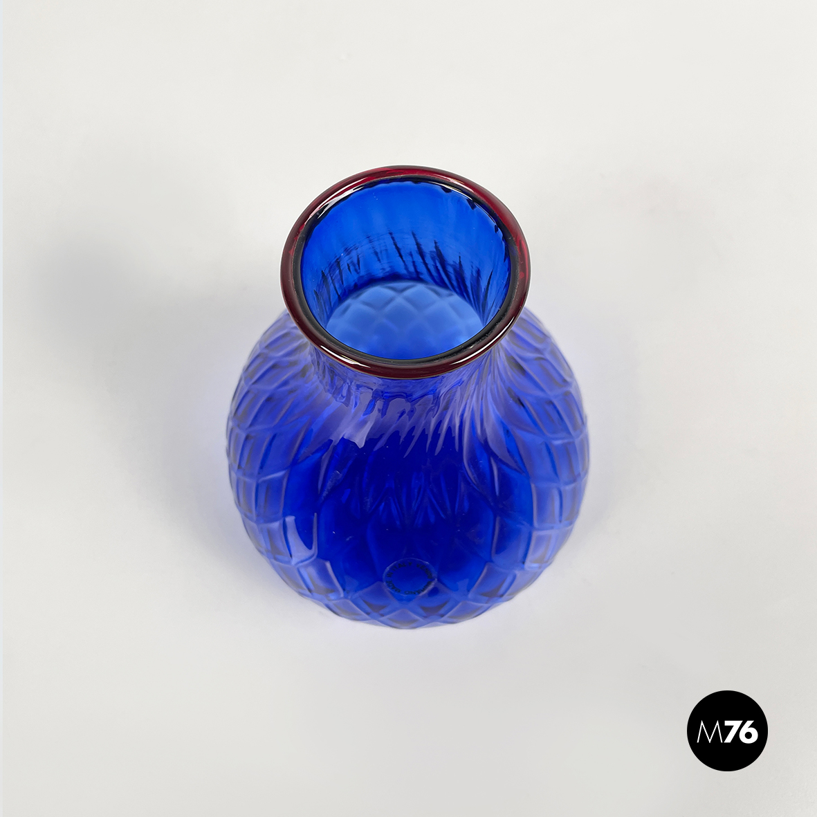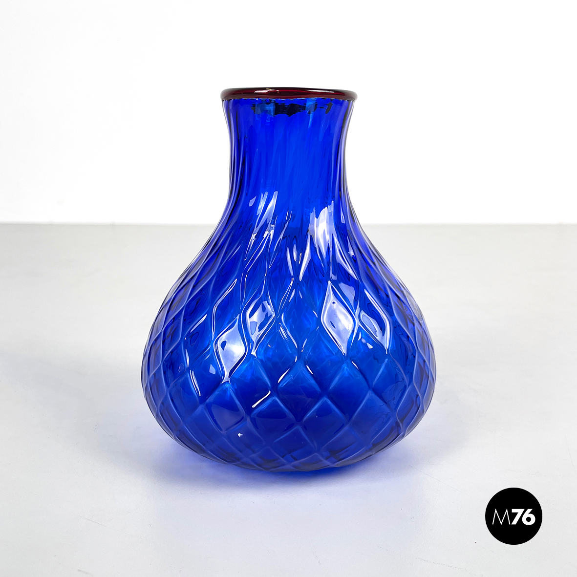 Vaso a base tonda in vetro di Murano blu, texturizzato con rombi. Nella parte superiore presenta un foro tondo con profilo in vetro rosso. La struttura si allarga al centro e poi si stringe verso il fondo.