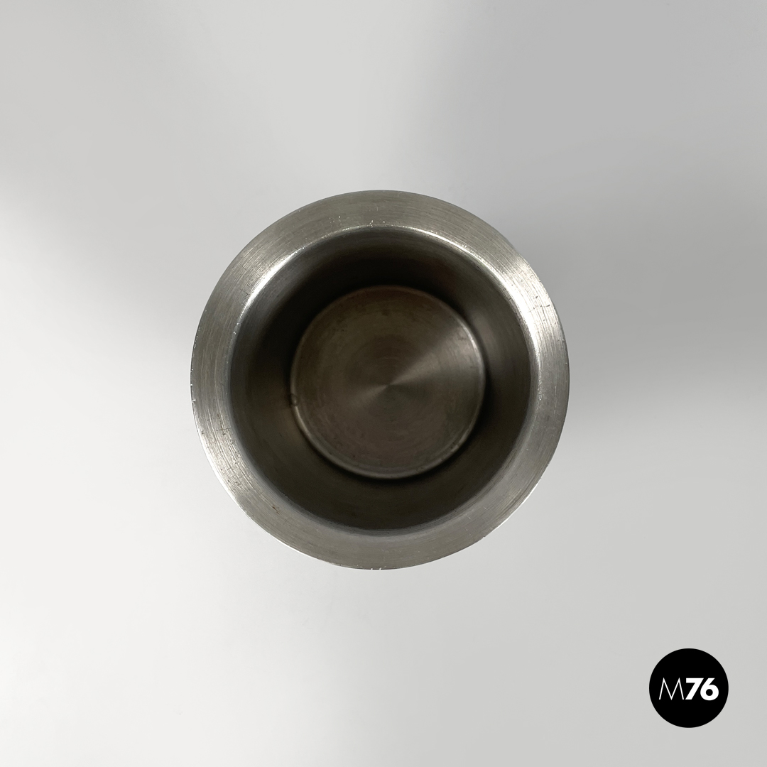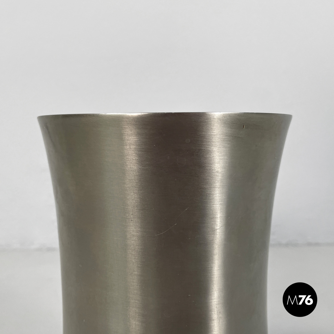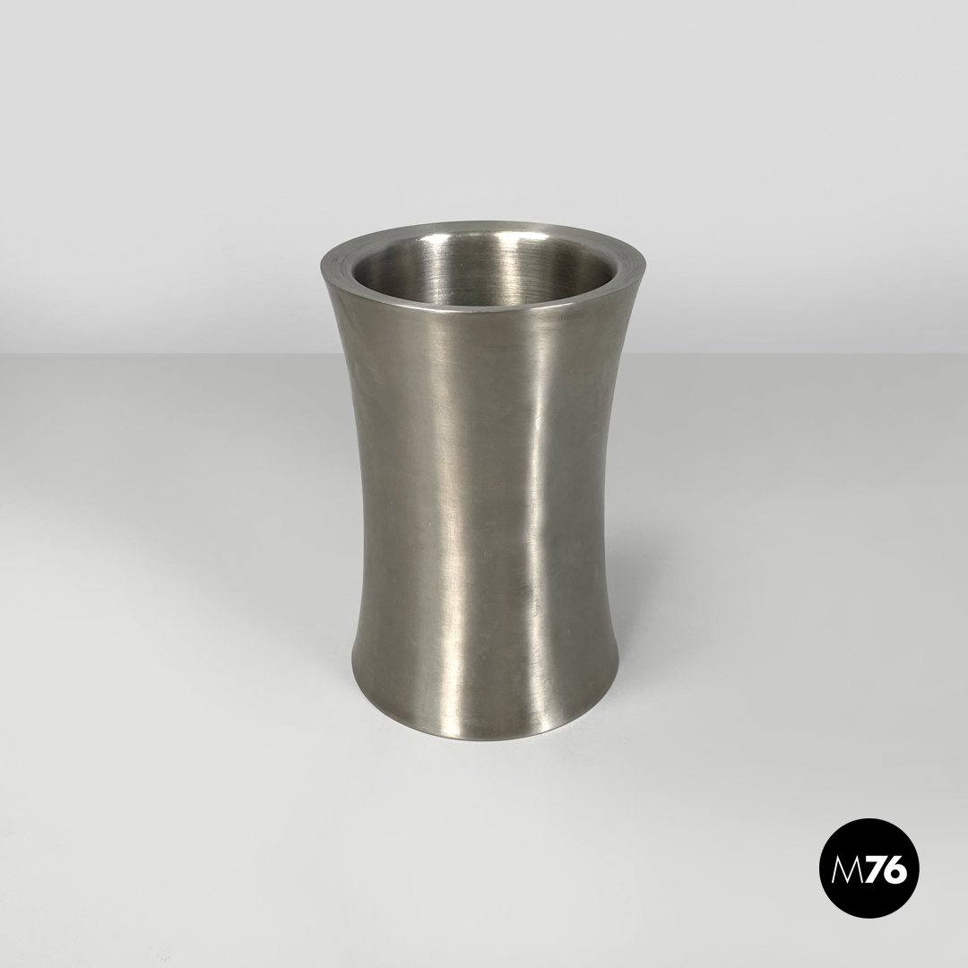 Vaso argentato in acciaio Inox a base tonda. I profili seguono linee curve e tondeggianti.