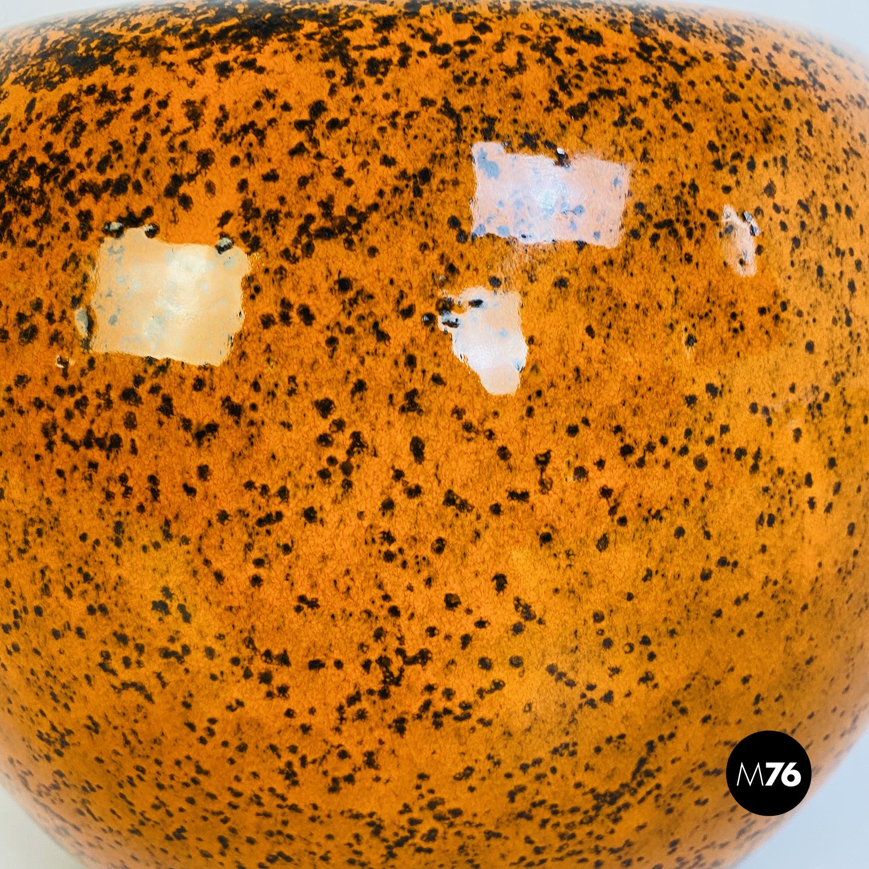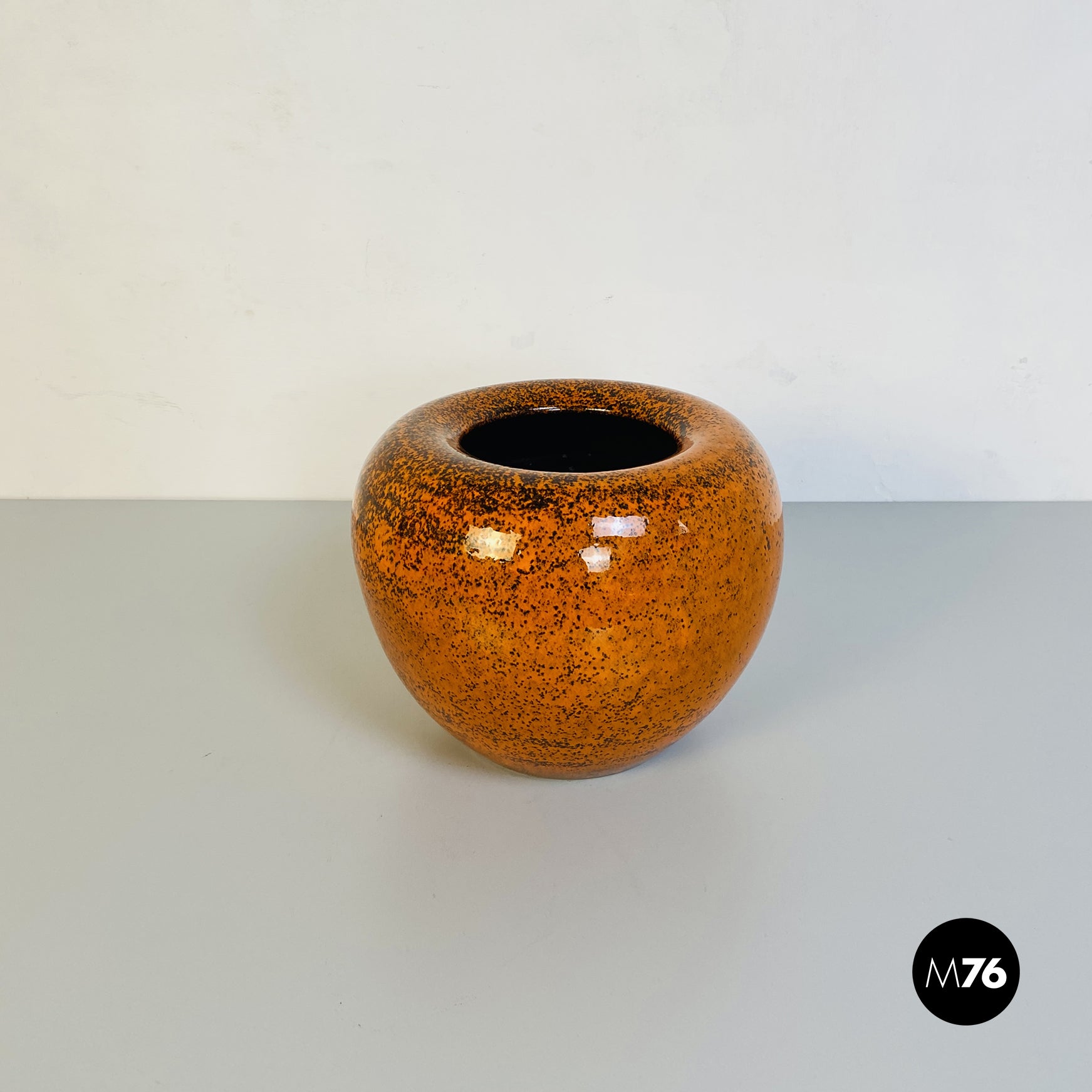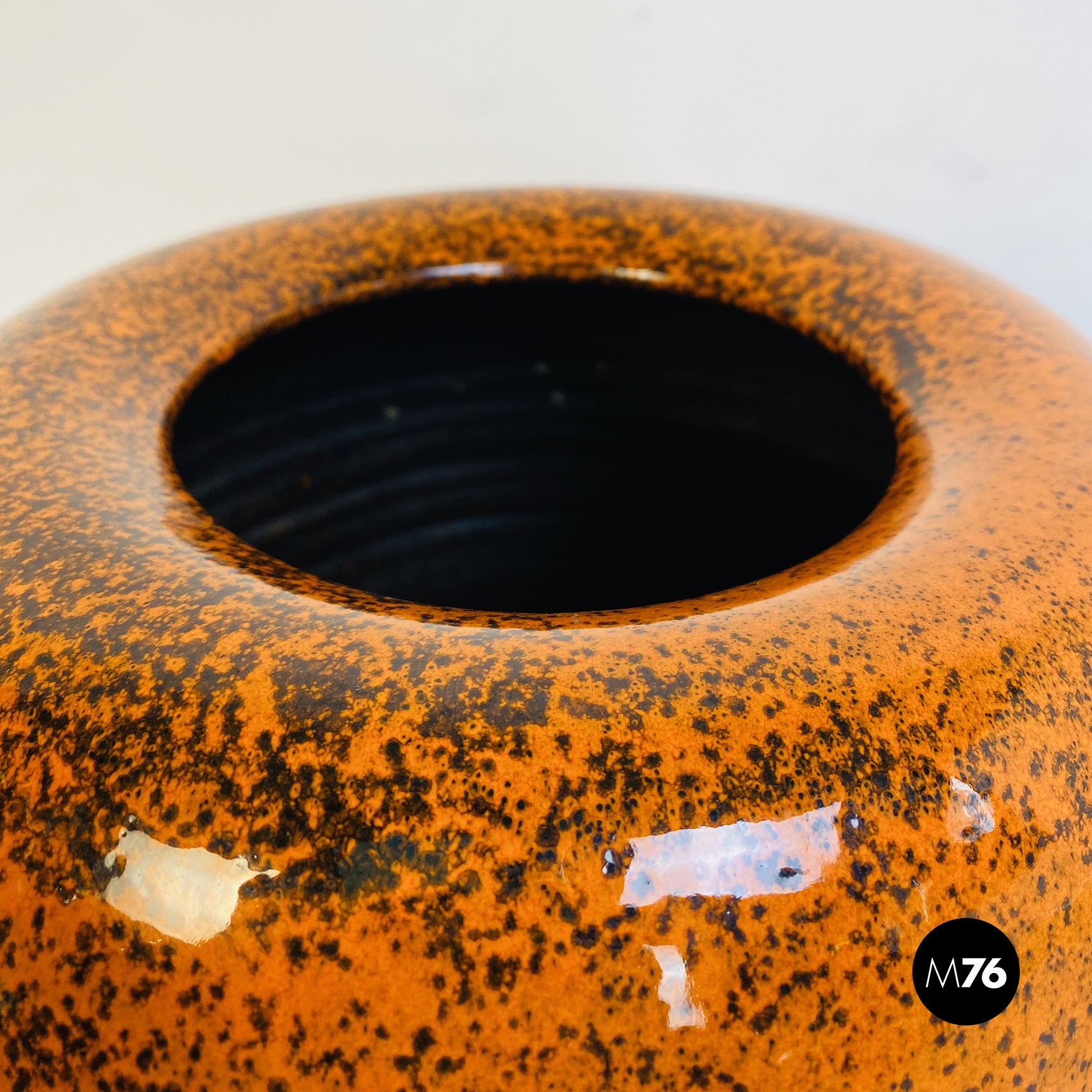 Vaso dalla forma tonda in ceramica smaltata arancione e decorazione astratta in marrone.