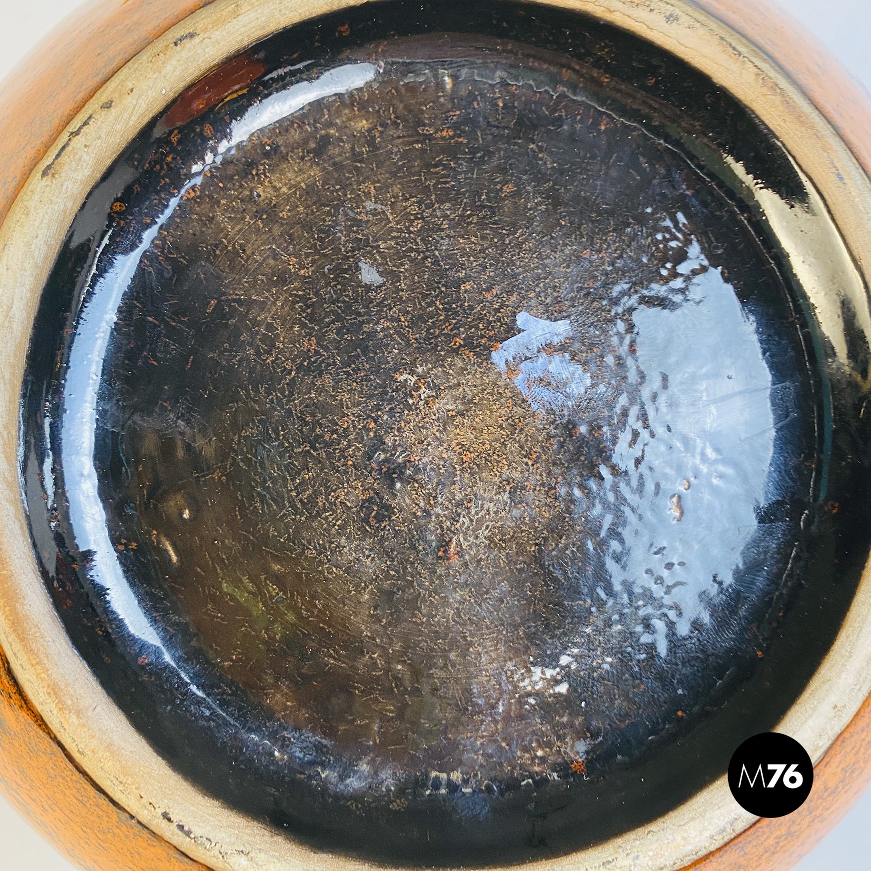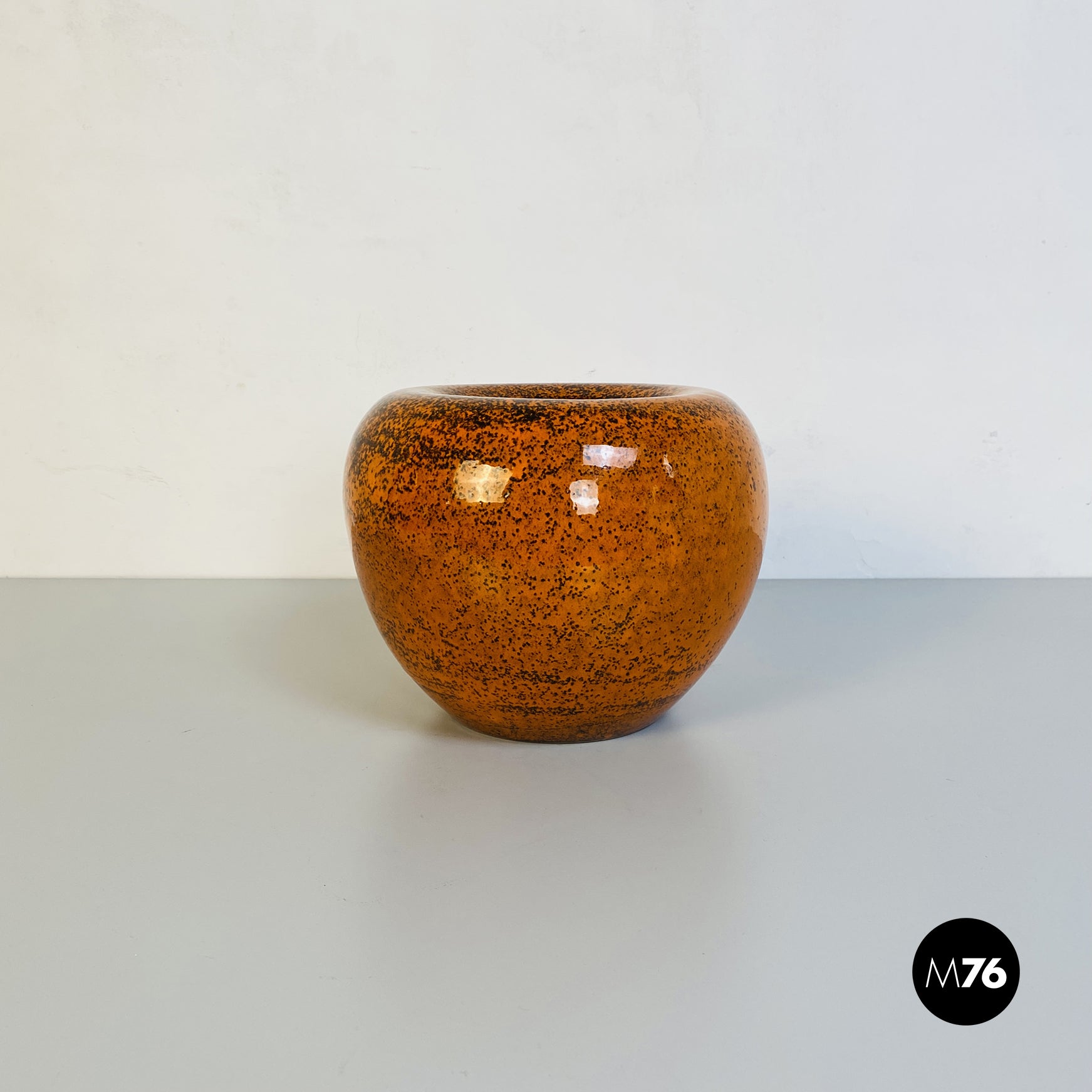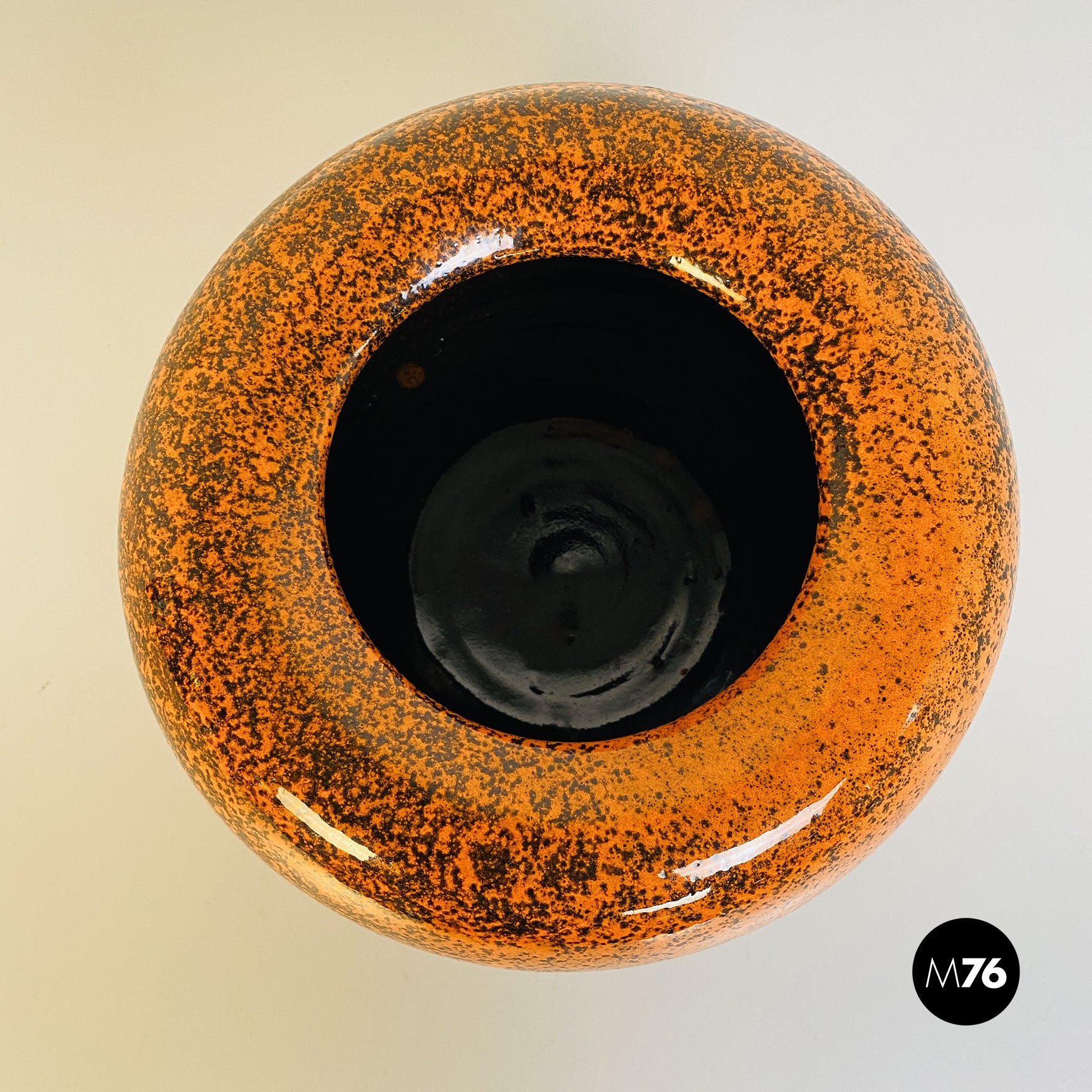 Vaso dalla forma tonda in ceramica smaltata arancione e decorazione astratta in marrone.