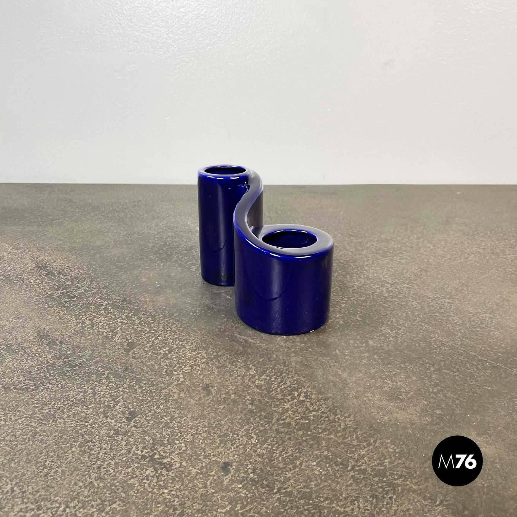 Vaso a forma di doppia spirale in ceramica blu lucida con i due fori le due parti che lo compongono di grandezze e altezze diverse a creare movimento e continuità nella spirale.