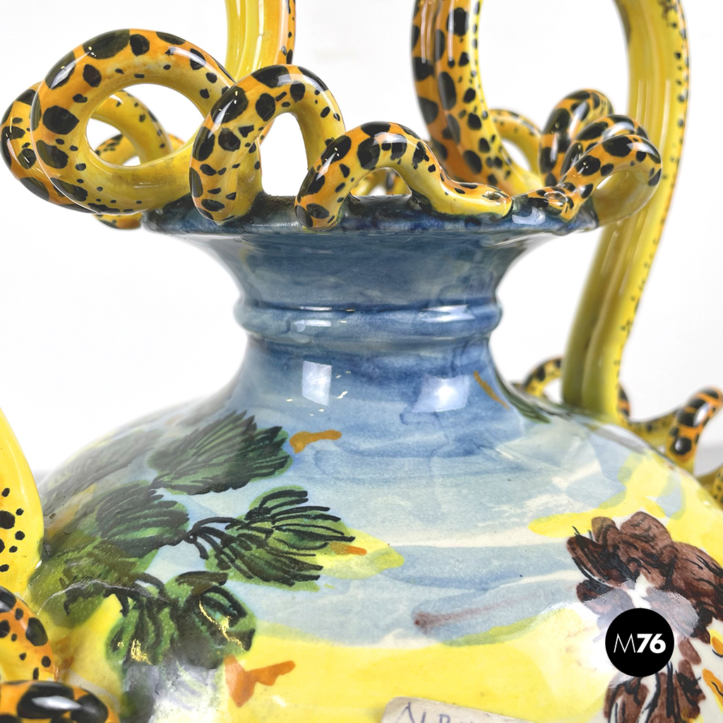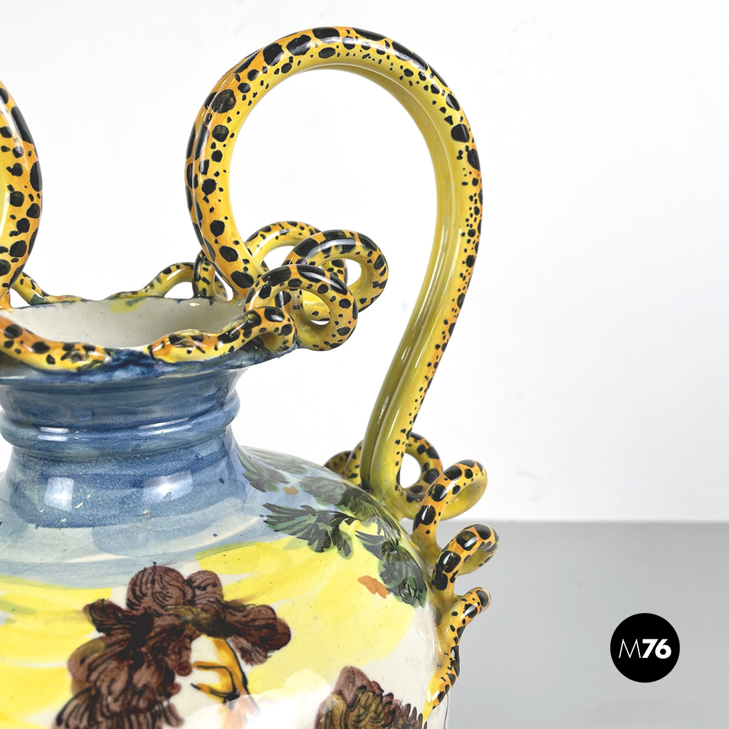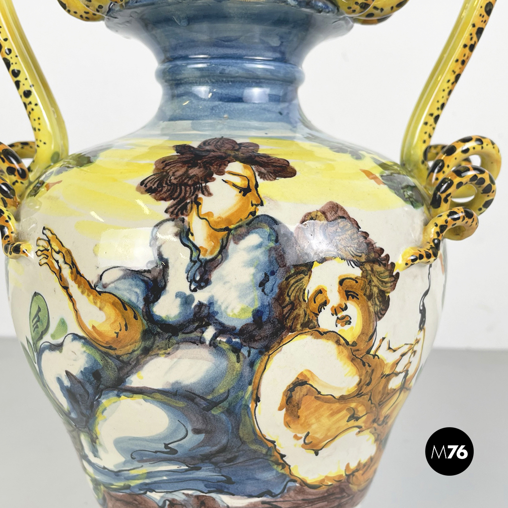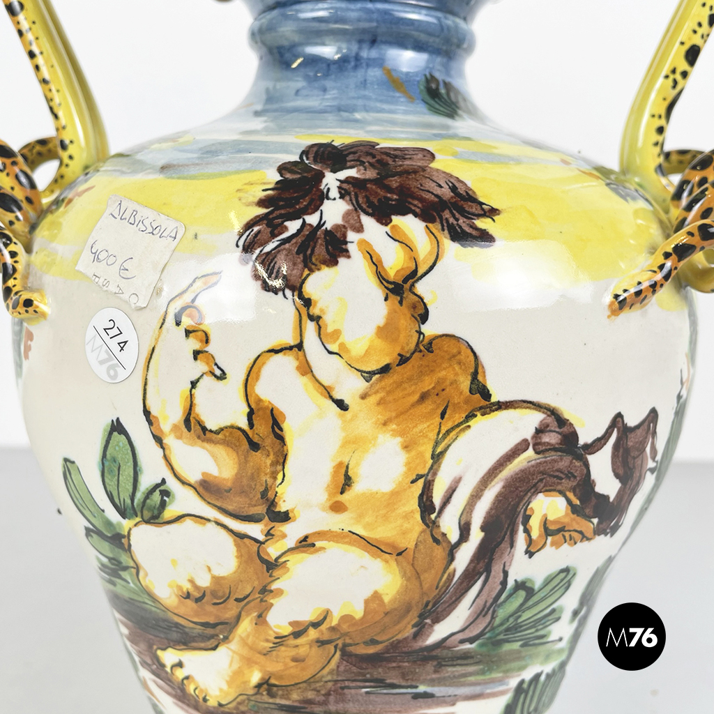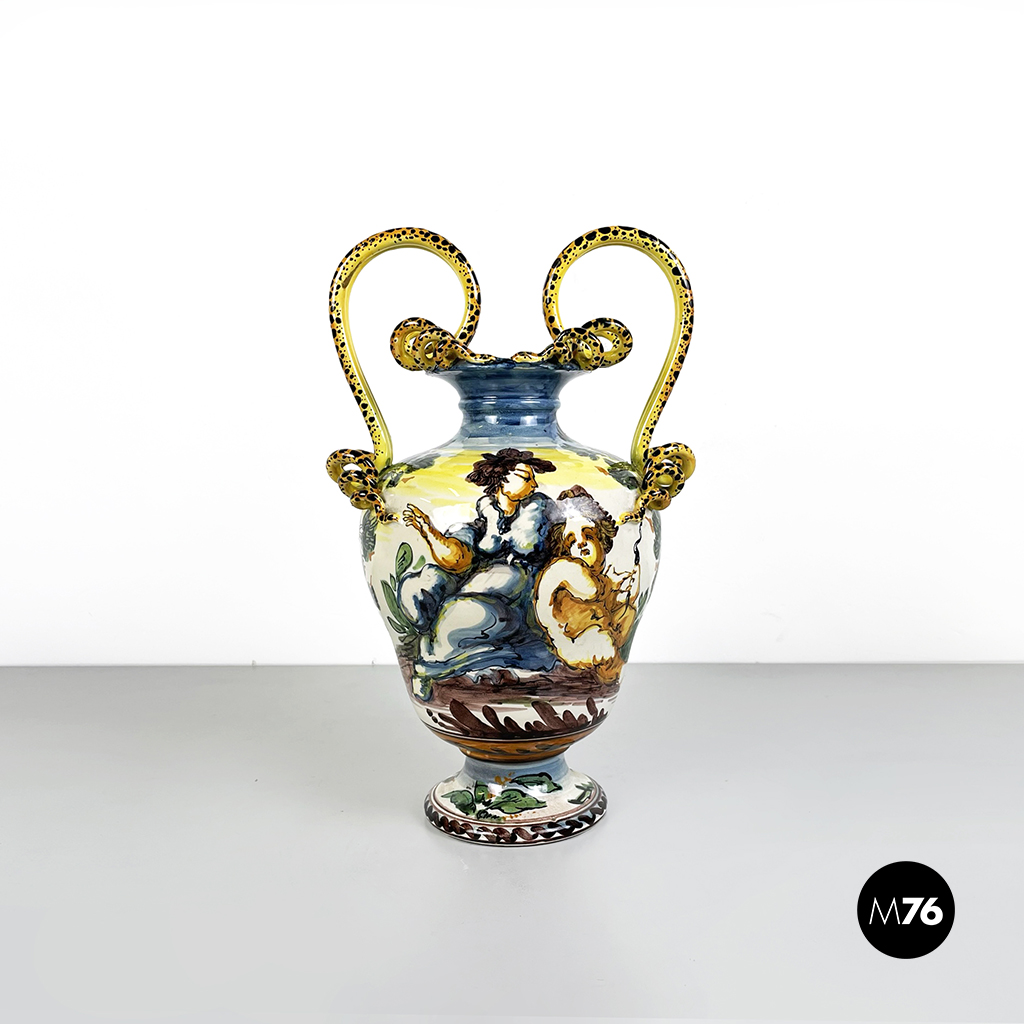 Vaso Albissola, completamente artigianale, i colori predominanti del vaso sono il verde acqua, il marrone e il giallo. Sono raffigurati una donna e un bambino nudo. I manici di questo splendido vaso lo rendono davvero originale e unico. La lavorazione dell’argilla ad Albissola è millenaria e questa tradizione si tramanda fino ad oggi.
