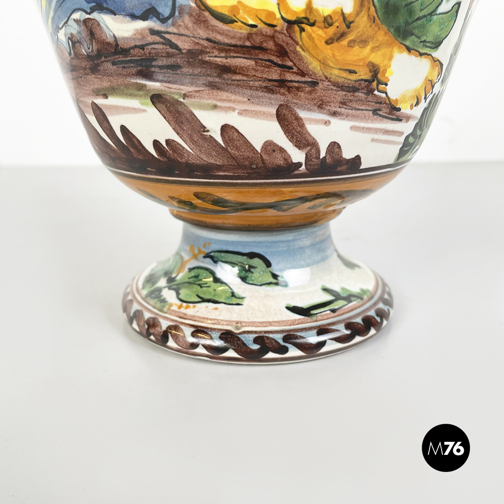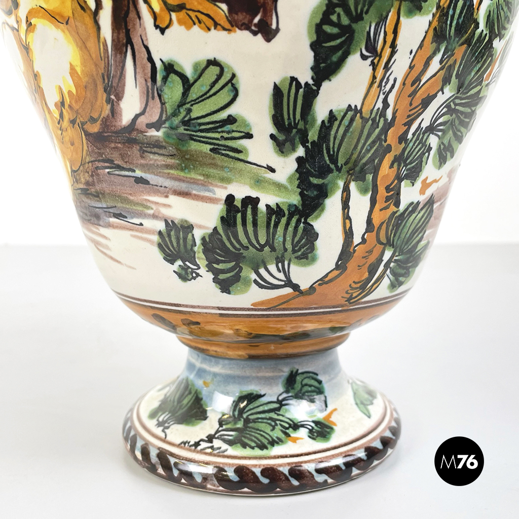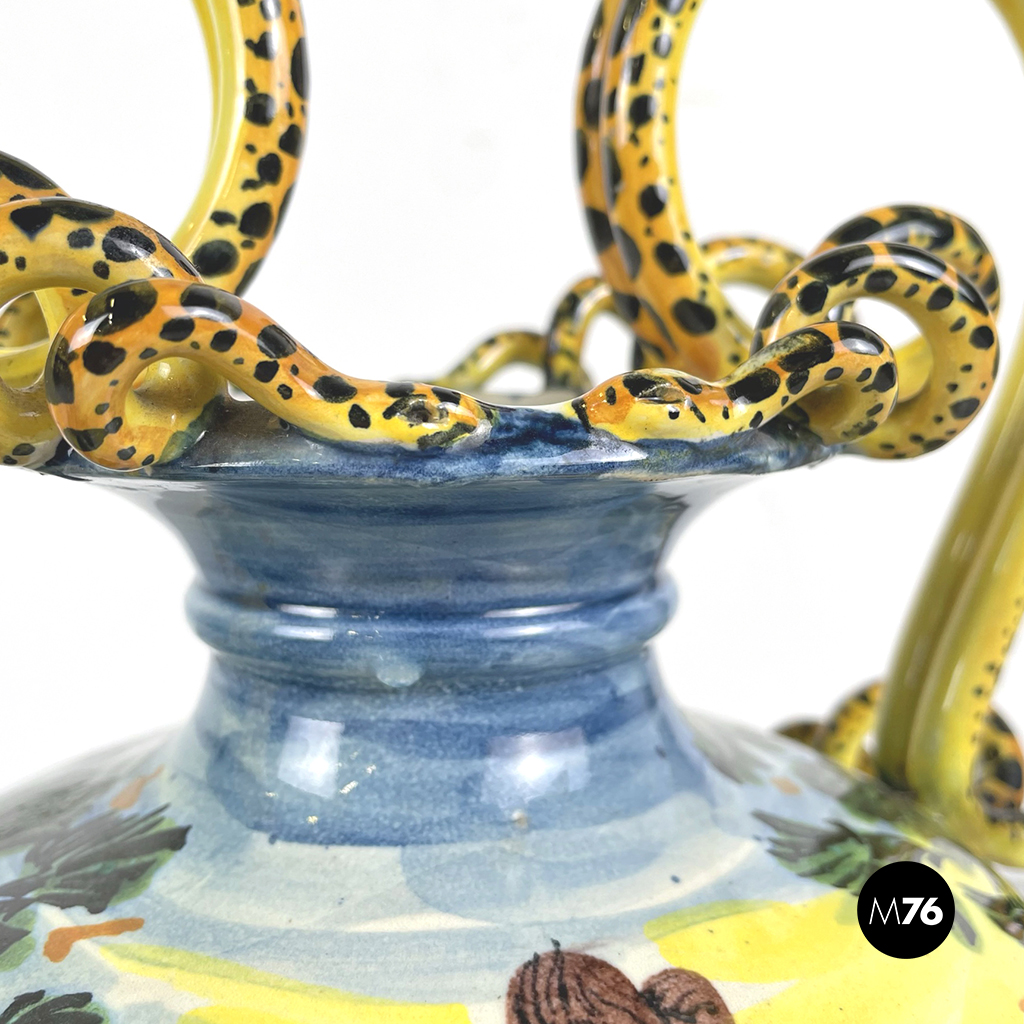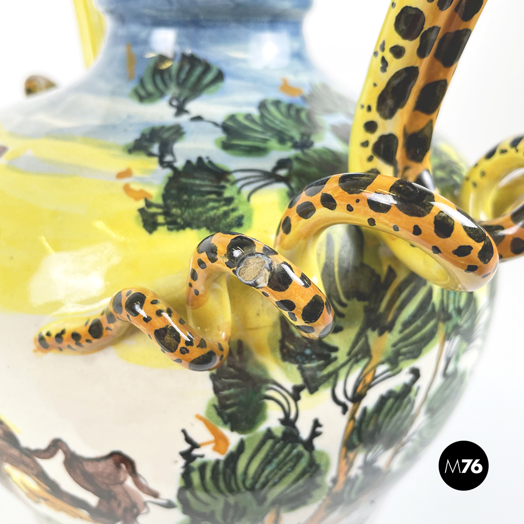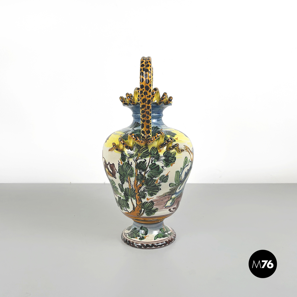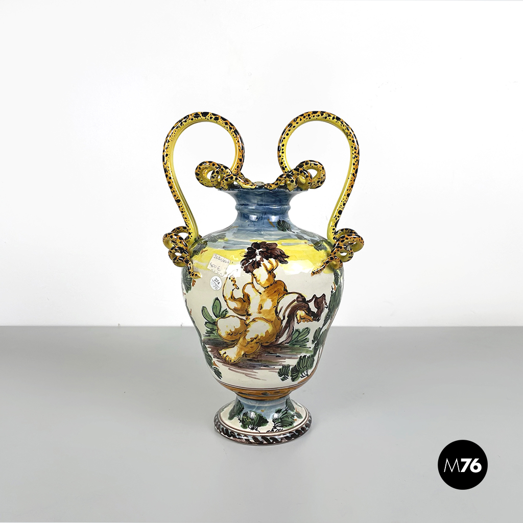 Vaso Albissola, completamente artigianale, i colori predominanti del vaso sono il verde acqua, il marrone e il giallo. Sono raffigurati una donna e un bambino nudo. I manici di questo splendido vaso lo rendono davvero originale e unico. La lavorazione dell’argilla ad Albissola è millenaria e questa tradizione si tramanda fino ad oggi.