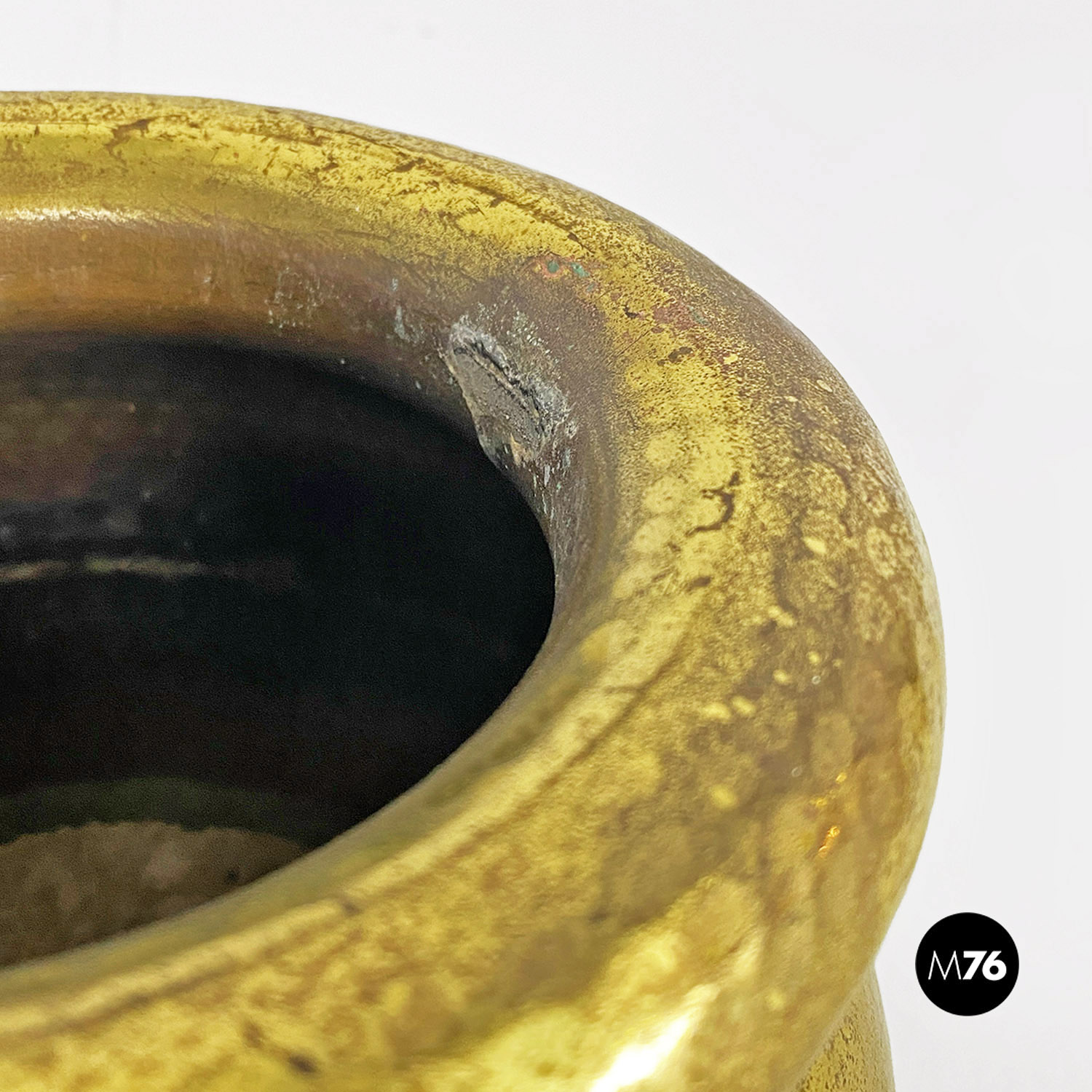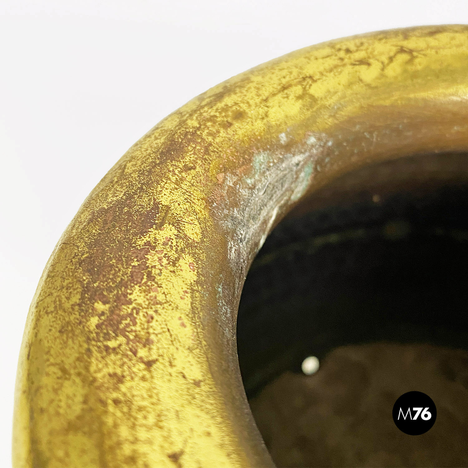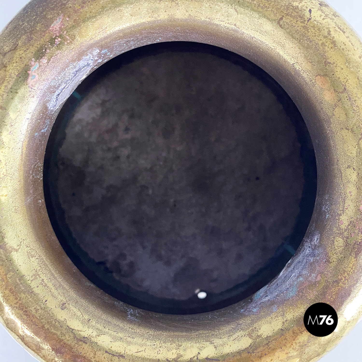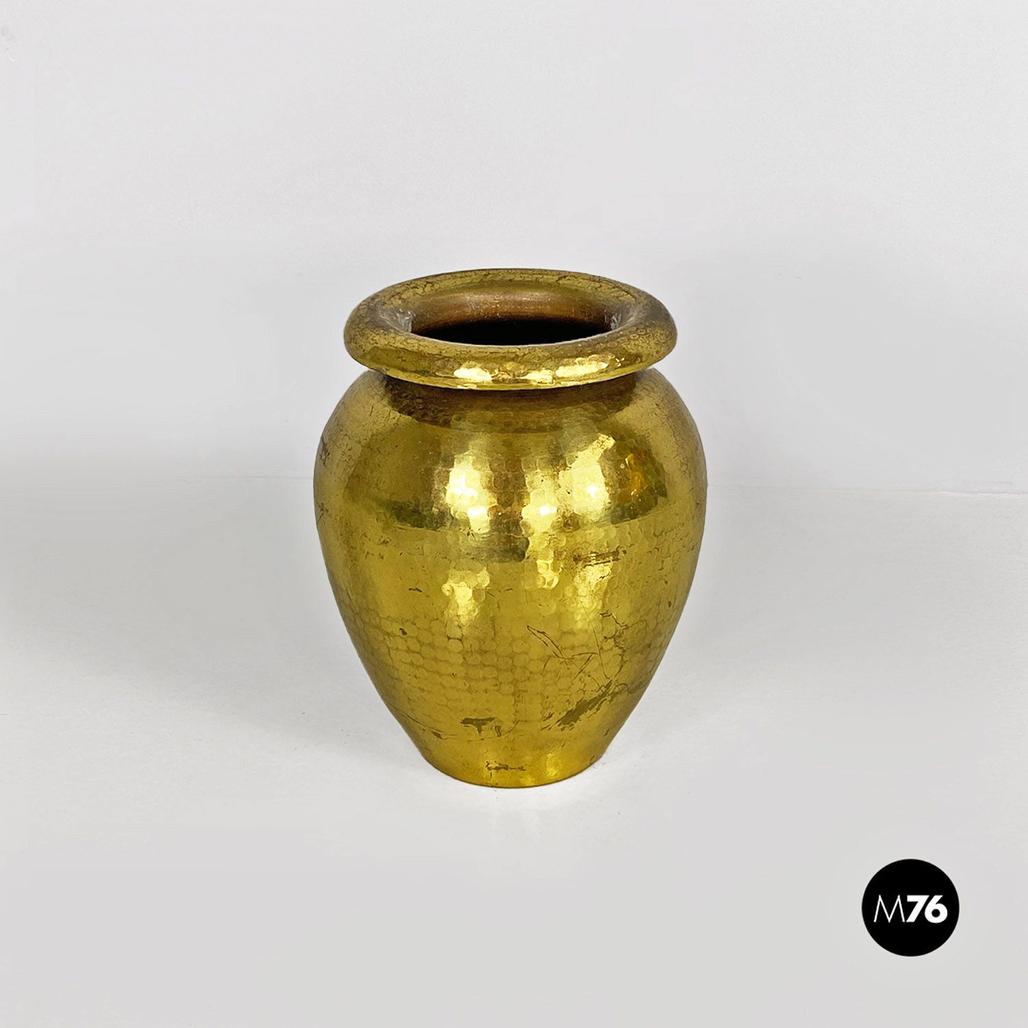 Vaso interamente realizzato in metallo con finitura dorata, dalla forma stondata, che ricorda un’anfora. La struttura è in ottone con una finitura a nido d’ape e un foro di forma tonda al centro della parte alta, con bordo ricurvo.