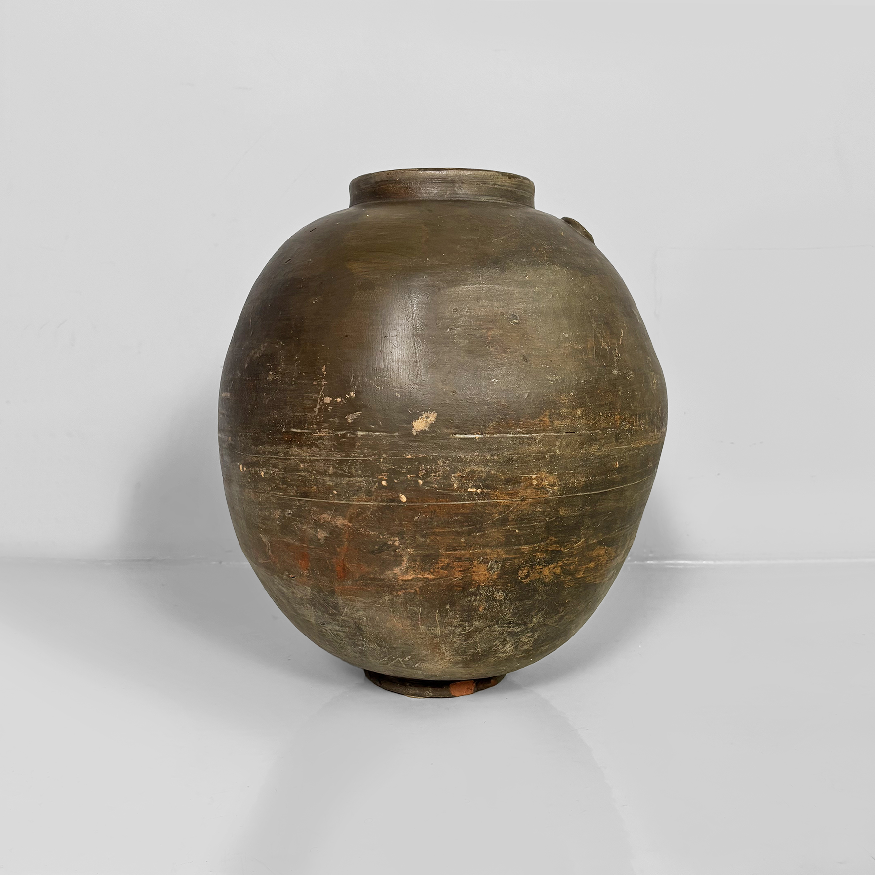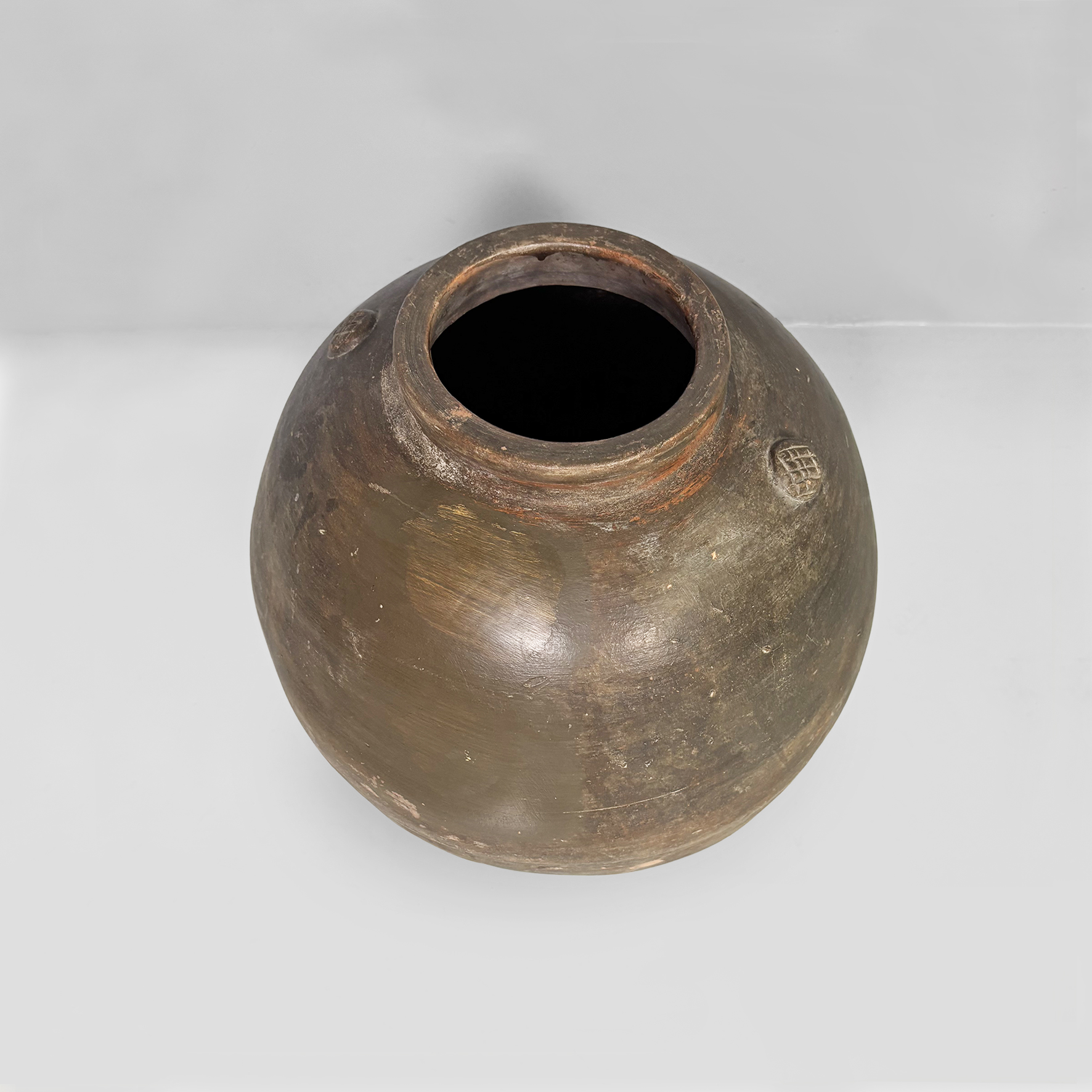 Vaso in terracotta di medie dimensioni, con forma stondata, in stile orientalista. Contenitore dalla forma ovaloide con colletto ed apertura di forma rotonda, così come la base d’appoggio. Superficie di colore prevalentemente grigio e verde scuro, con due punzoni tondi sui due lati, riportanti un piccolo reticolato irregolare. Colorazione varia per manifattura e per il tempo, con segni sui toni del marrone e del giallo.