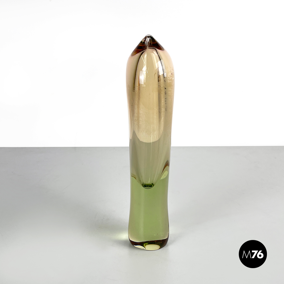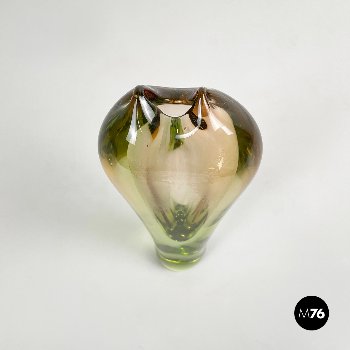 Vaso a base ovale interamente in vetro di grosso spessore di Murano. Il vetro presenta diverse sfumatura tra i toni del rosa-arancio e del verde chiaro. La forma del vaso è tondeggiante ed asimmetrica: tende ad assottigliarsi verso la base. Accanto al foro ovale superiore sono presenti due sporgenze.