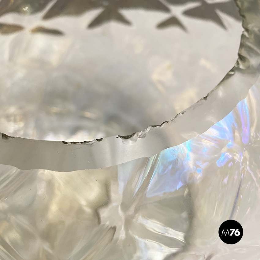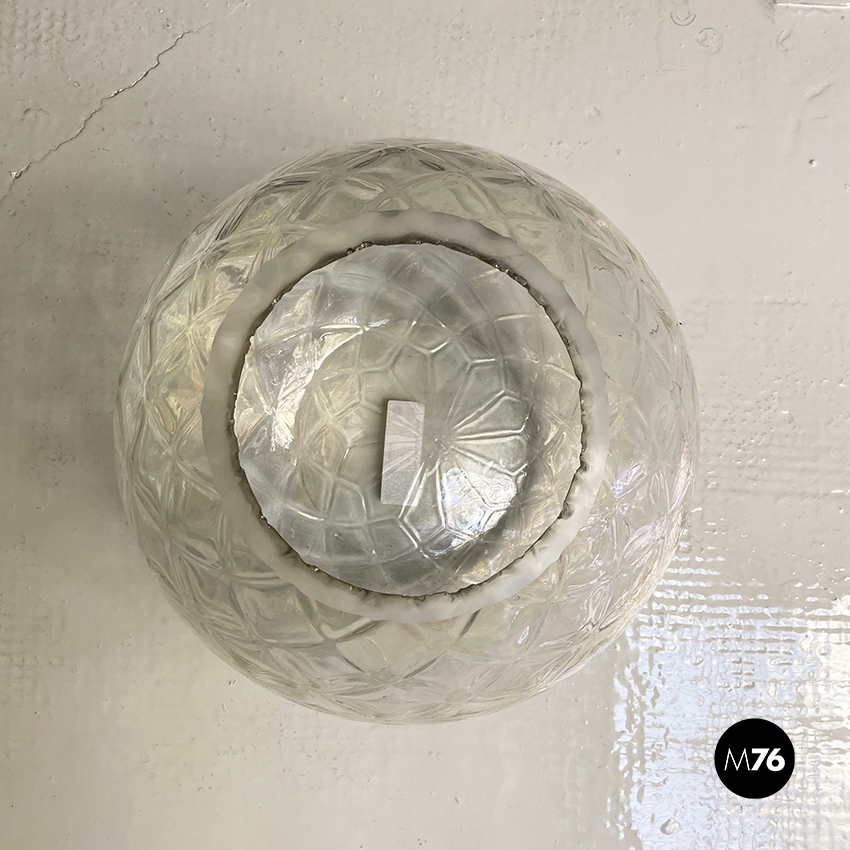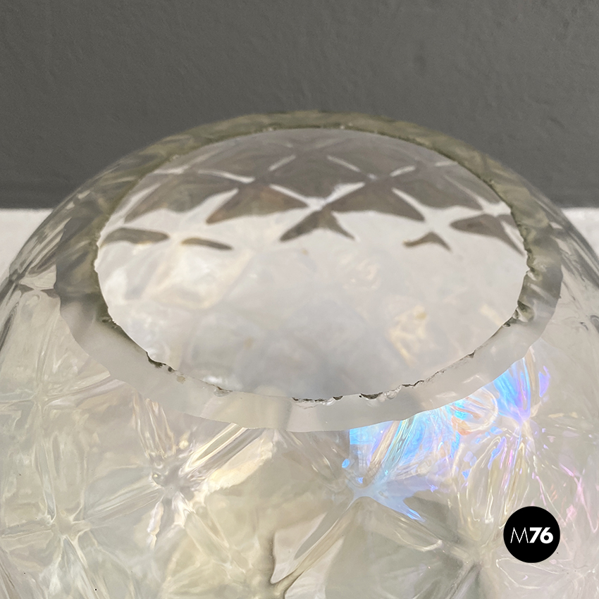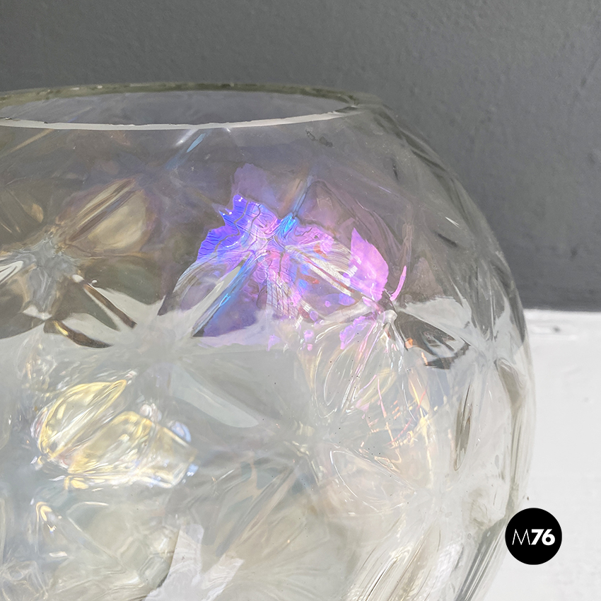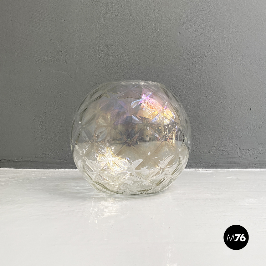 Vaso di forma sferica in vetro trasparente e stampato con motivi romboidali con effetto irridescente. Bordo con finitura irregolare.