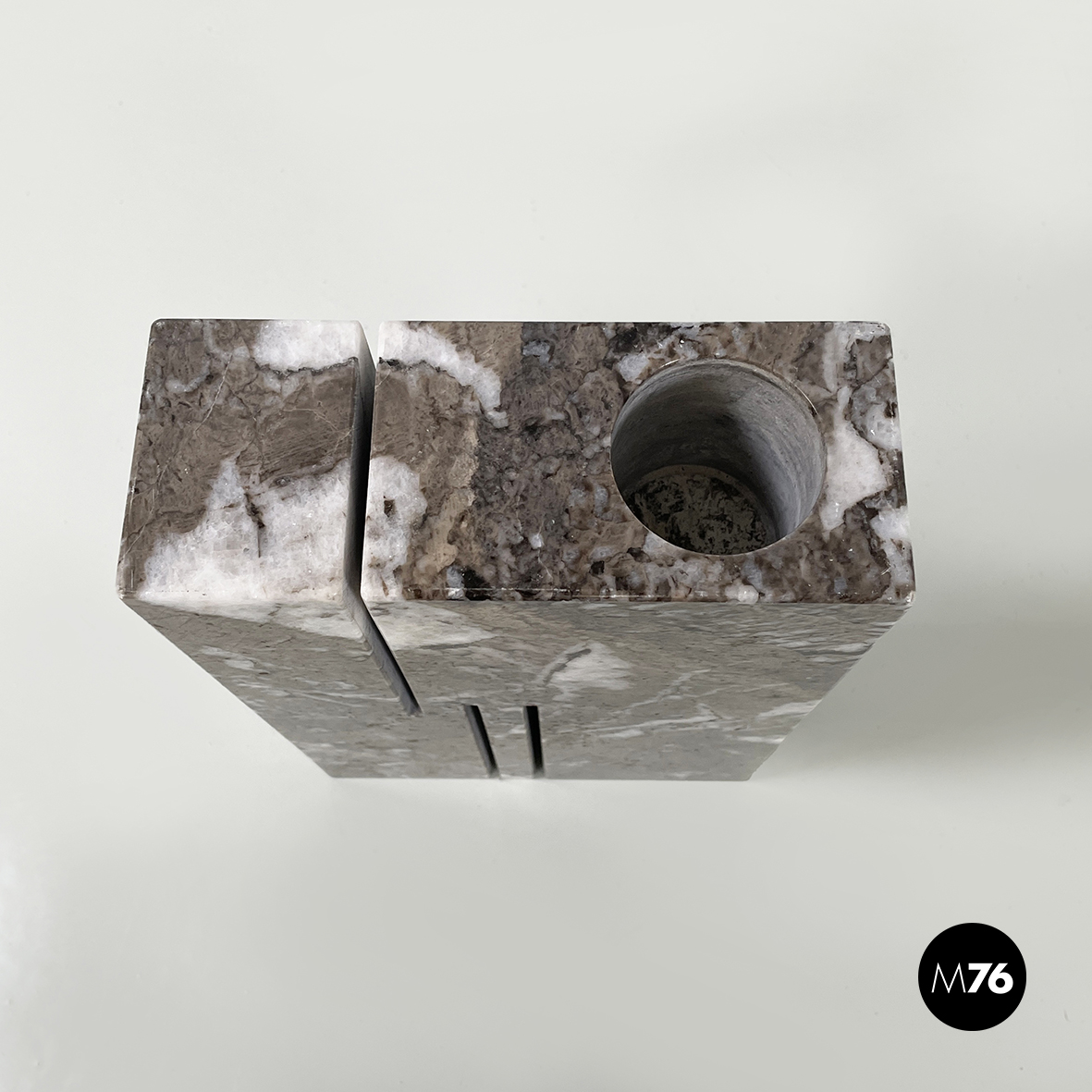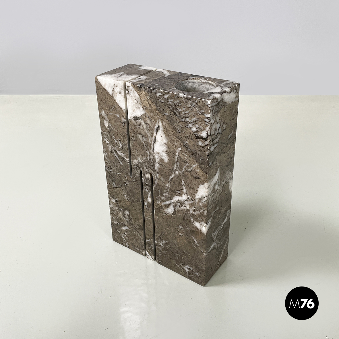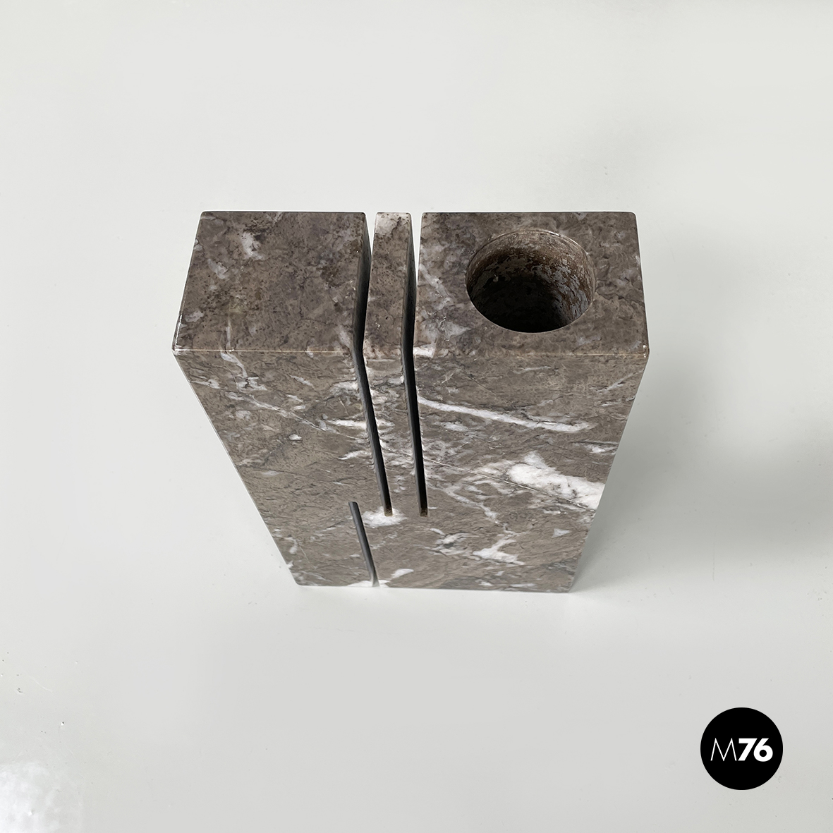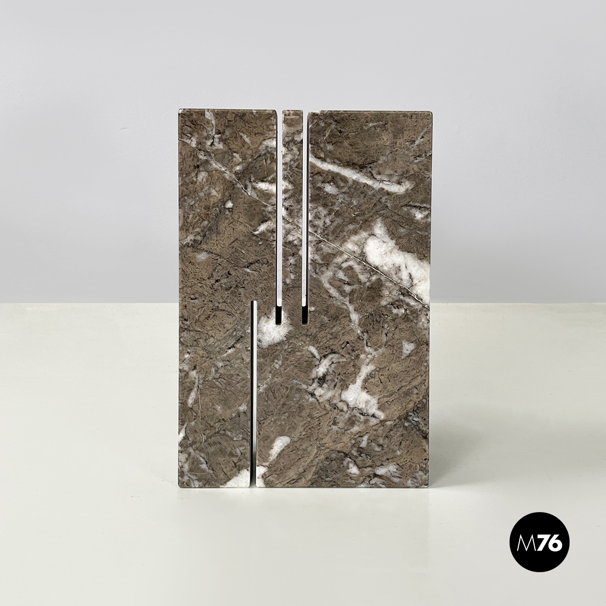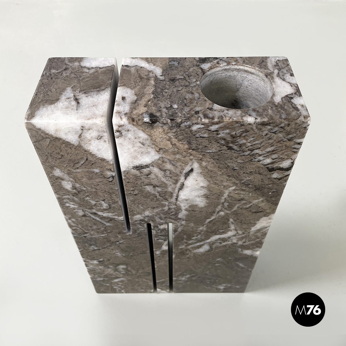 Vaso scultoreo a base rettangolare, interamente in marmo grigio. Su uno dei due lati corti presenta un foro tondo e due scanalature decorative, mentre sul lato opposto un foro e una scanalatura decorativa. Utilizzabile come scultura o oggetto di arredamento.